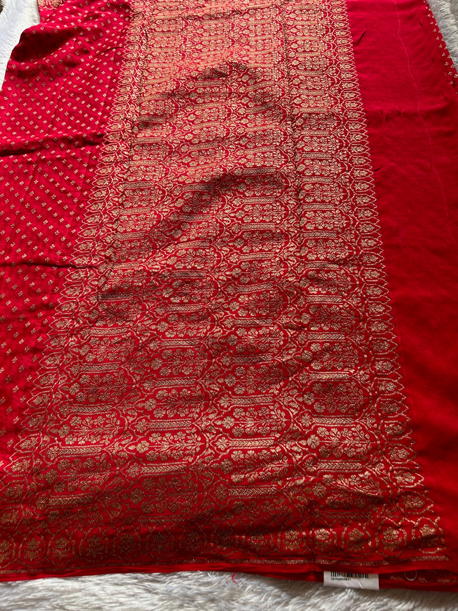 Mahiya showcases the timeless elegance of pure Banarasi crepe silk in a striking solid red. Delicate buttas scattered across the fabric create subtle texture, while an intricate zari border frames the piece with traditional craftsmanship. The rich zari pallu commands attention with its ornate detailing. Complemented by a designer blouse piece featuring comprehensive zari embroidery, this saree merges classic weaving techniques with refined sophistication.