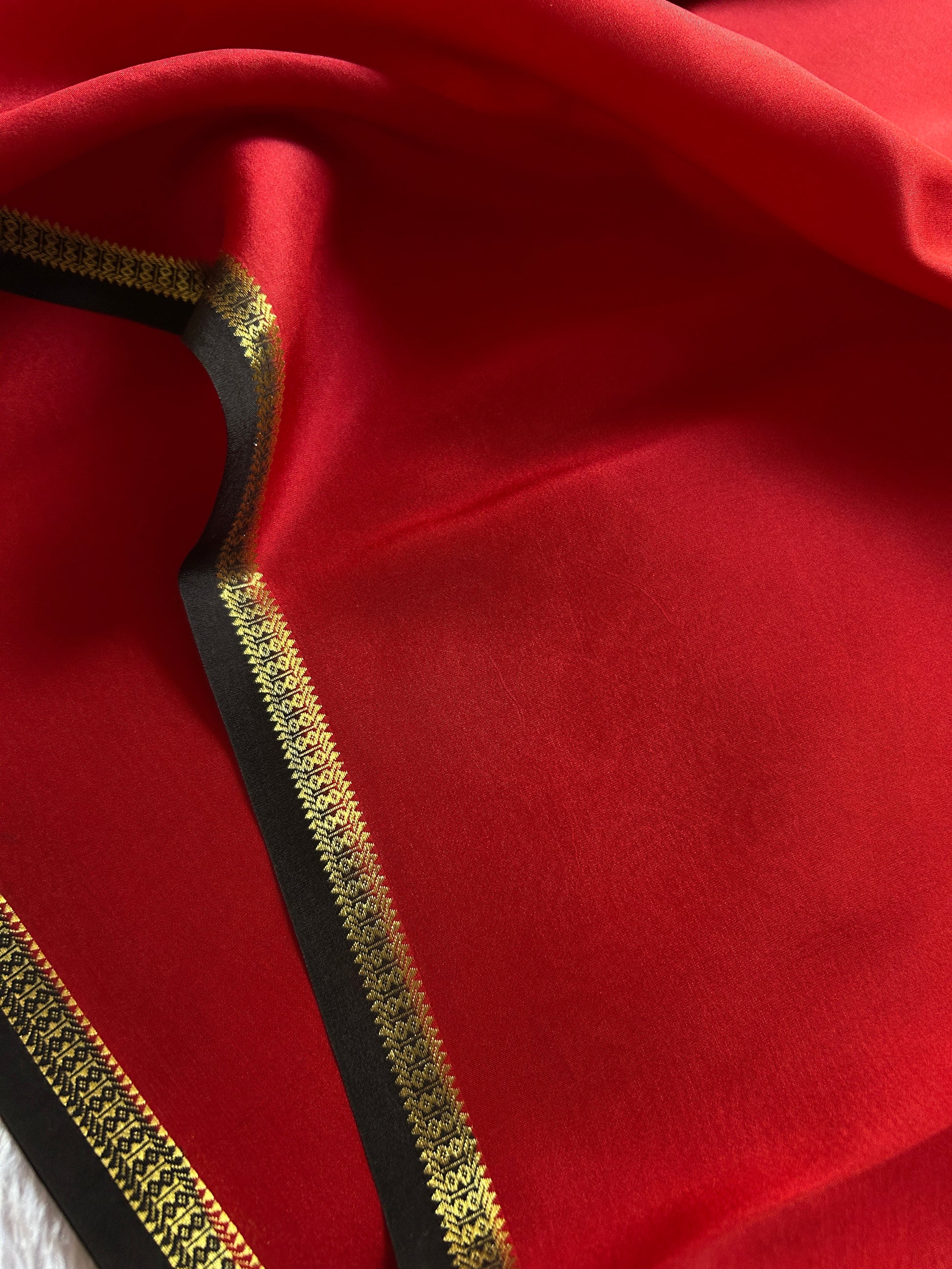This exquisite and lightweight red binny pure crepe silk saree features a refined black border and pallu, both adorned with intricate gold zari work. The delicate craftsmanship highlights traditional artistry, making it an elegant choice for formal occasions. Its rich texture and subtle contrast enhance the saree’s timeless appeal, reflecting expert weaving techniques unique to binny silk.