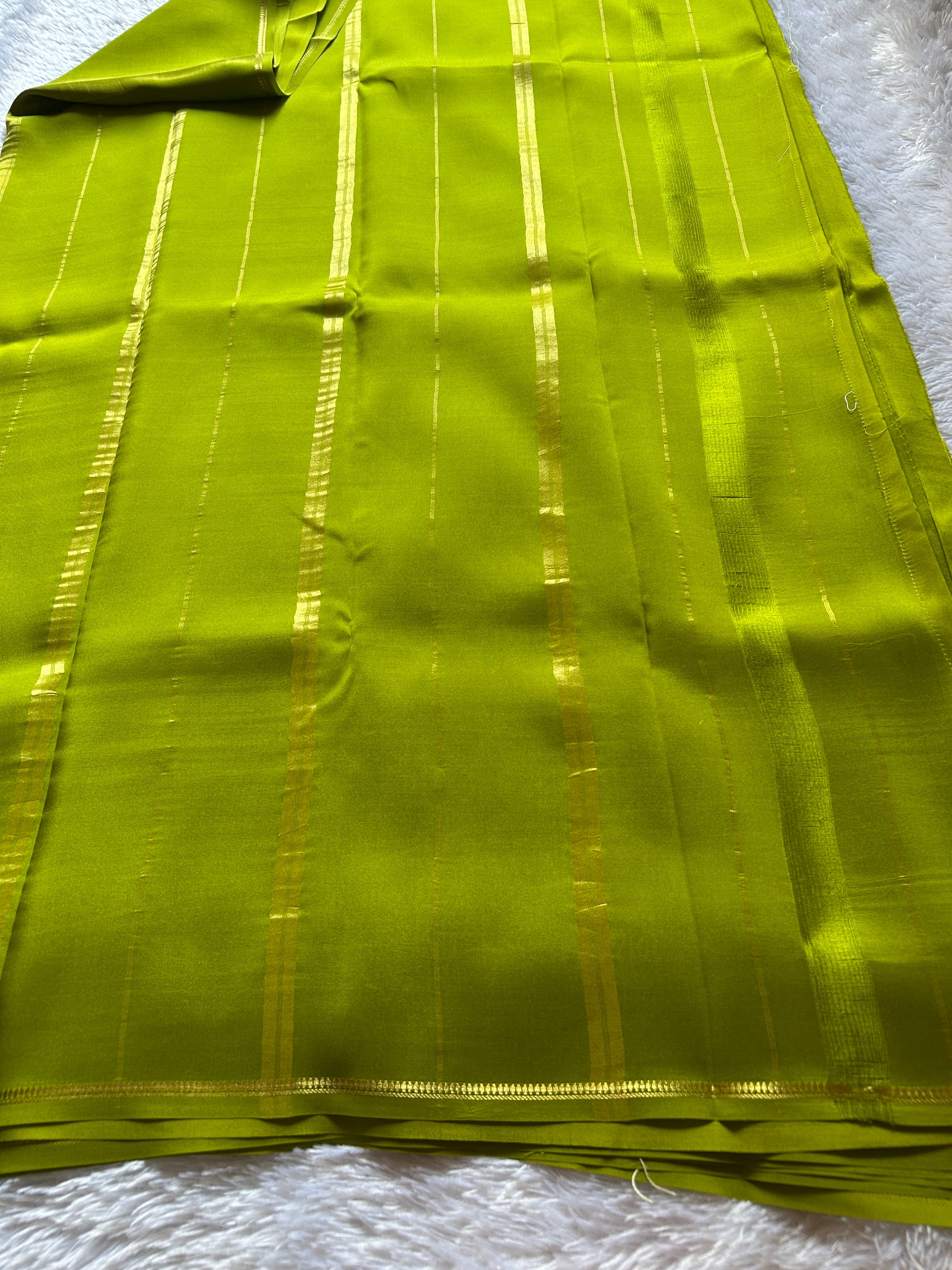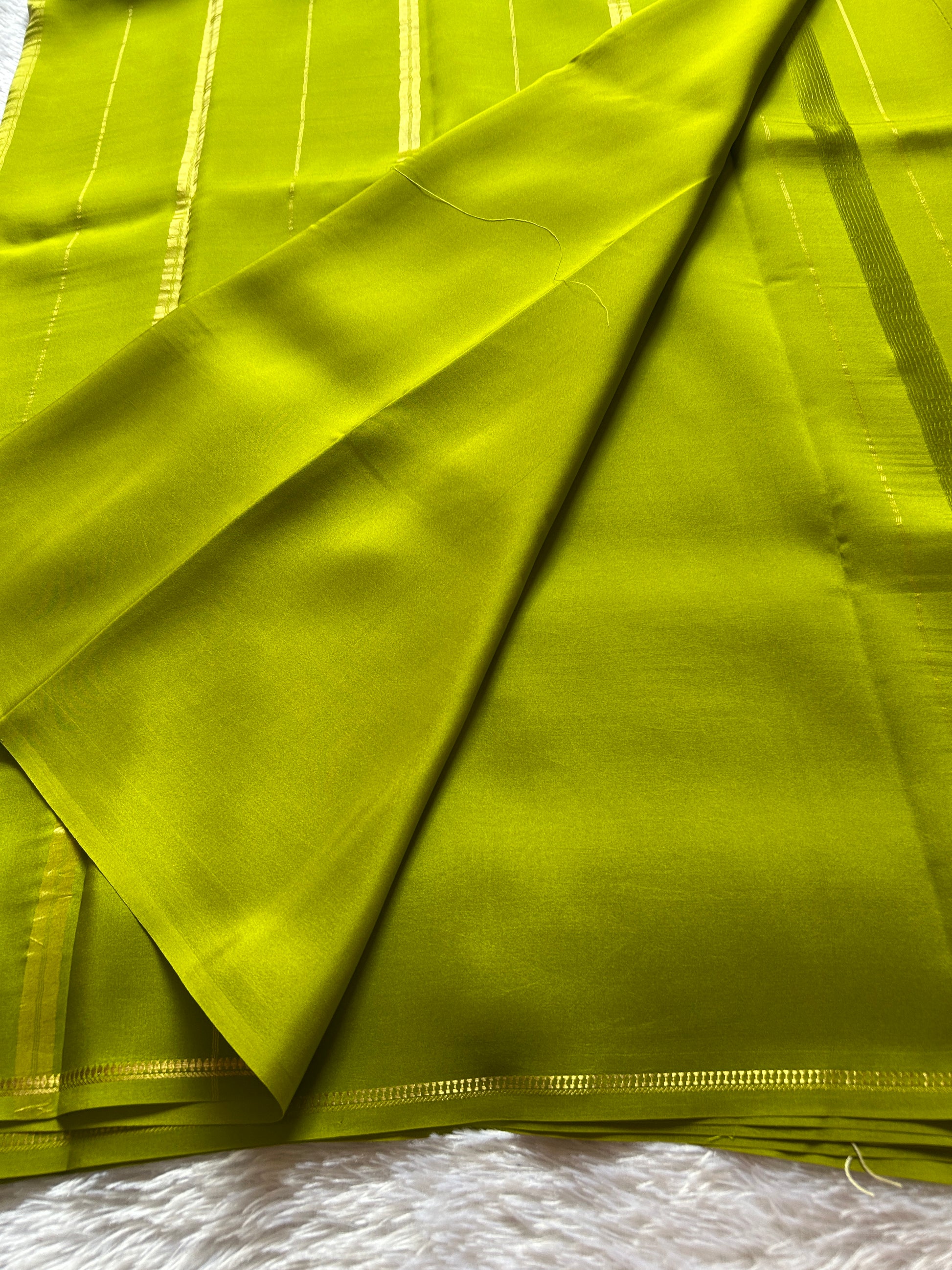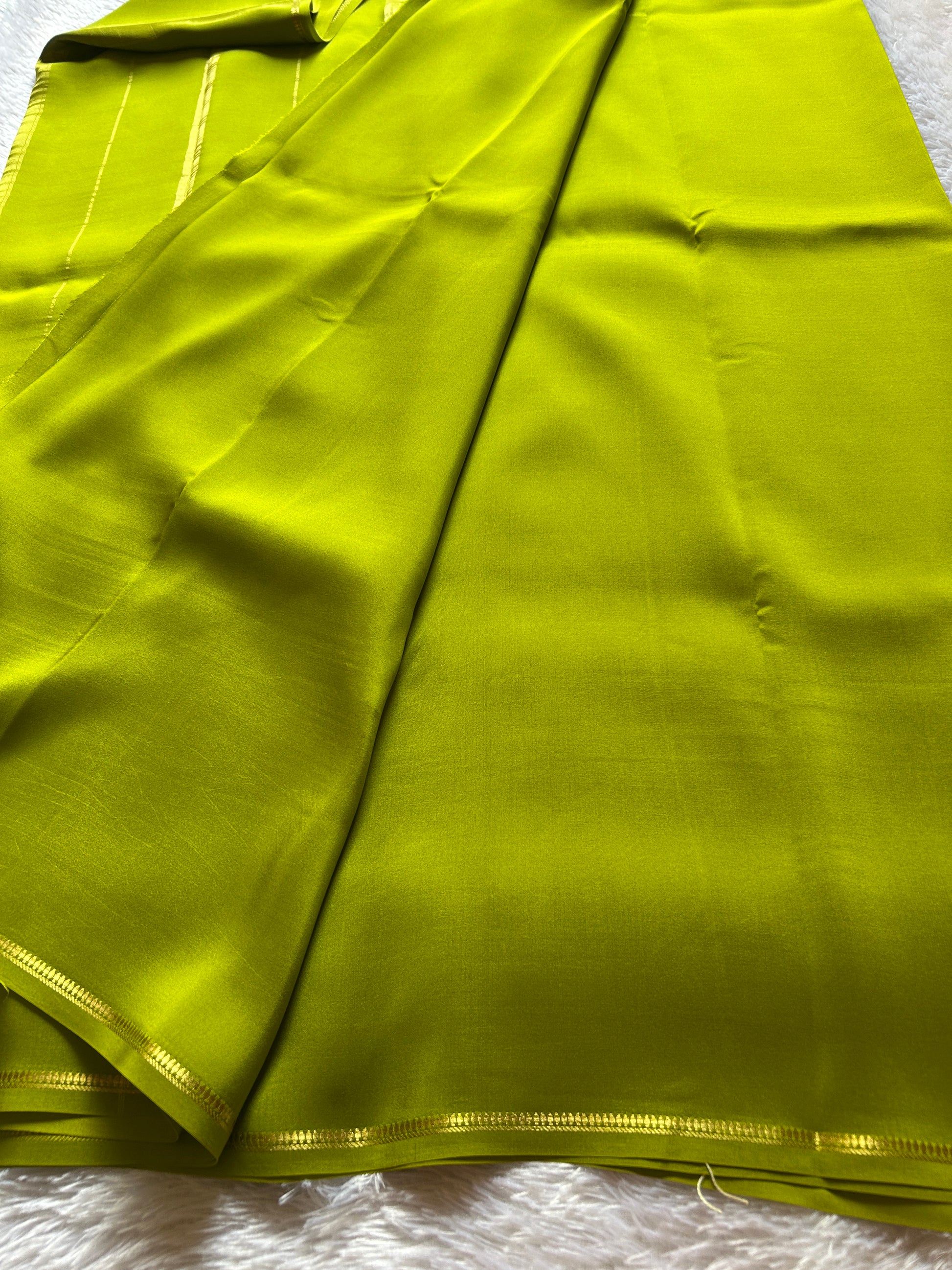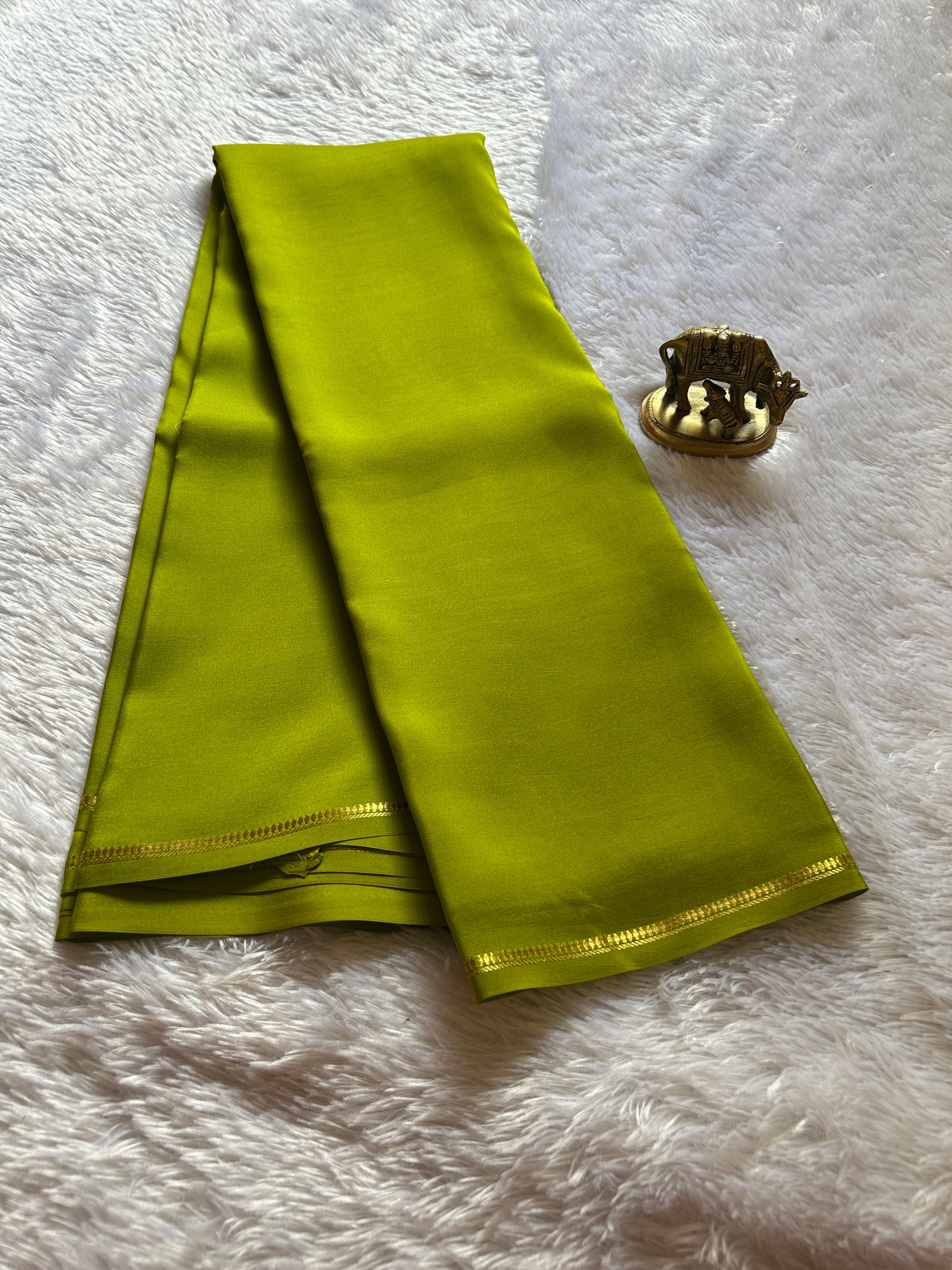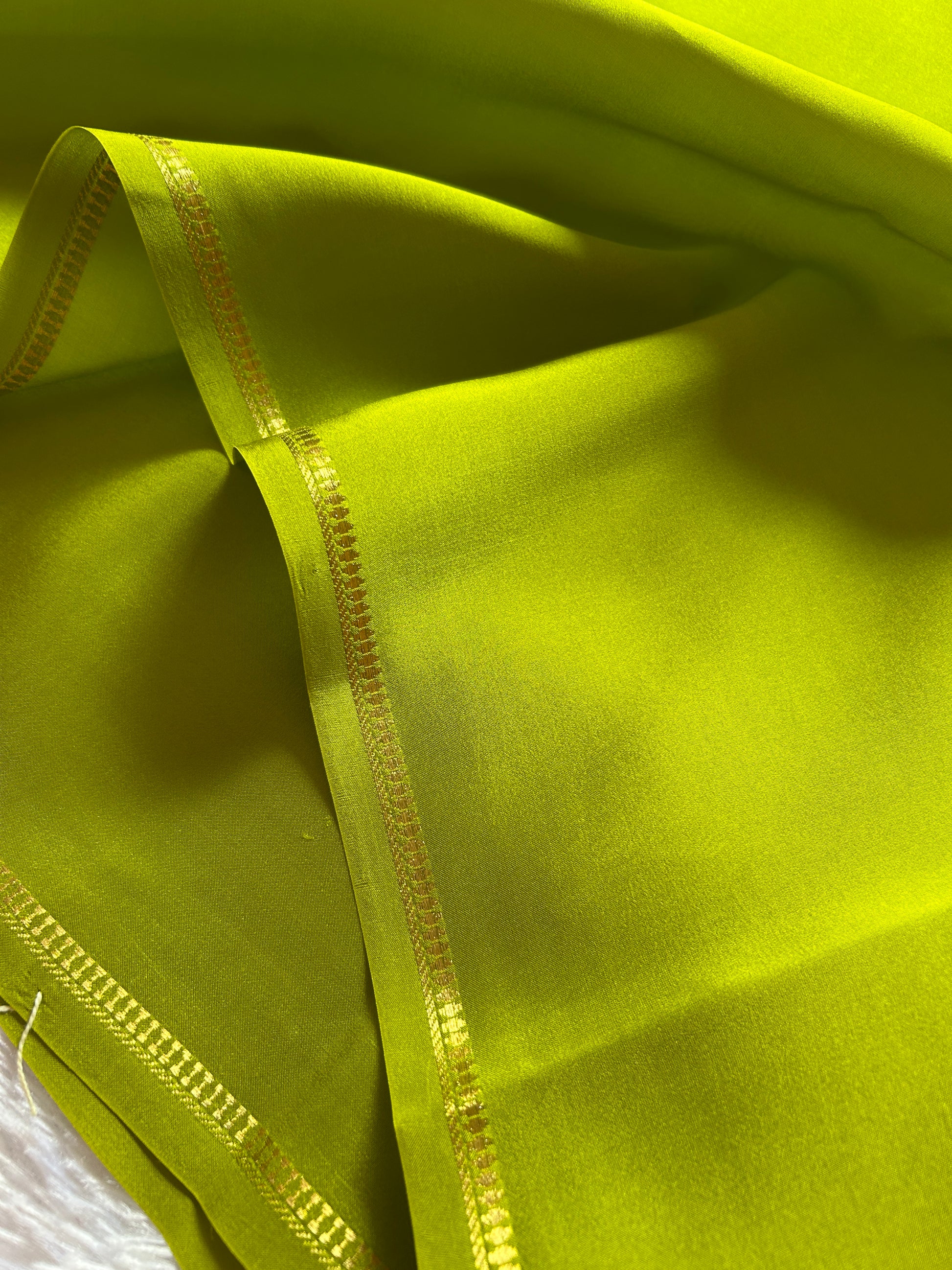 Elevate your traditional wardrobe with the Mani solid Olive green saree crafted from pure CSG Binny crepe silk. This exquisite saree features a delicate pure gold zari border and a beautifully adorned pallu, combining subtle elegance with timeless craftsmanship. Perfect for festive occasions or formal events, it offers both sophistication and comfort with its fine silk drape and refined detailing.