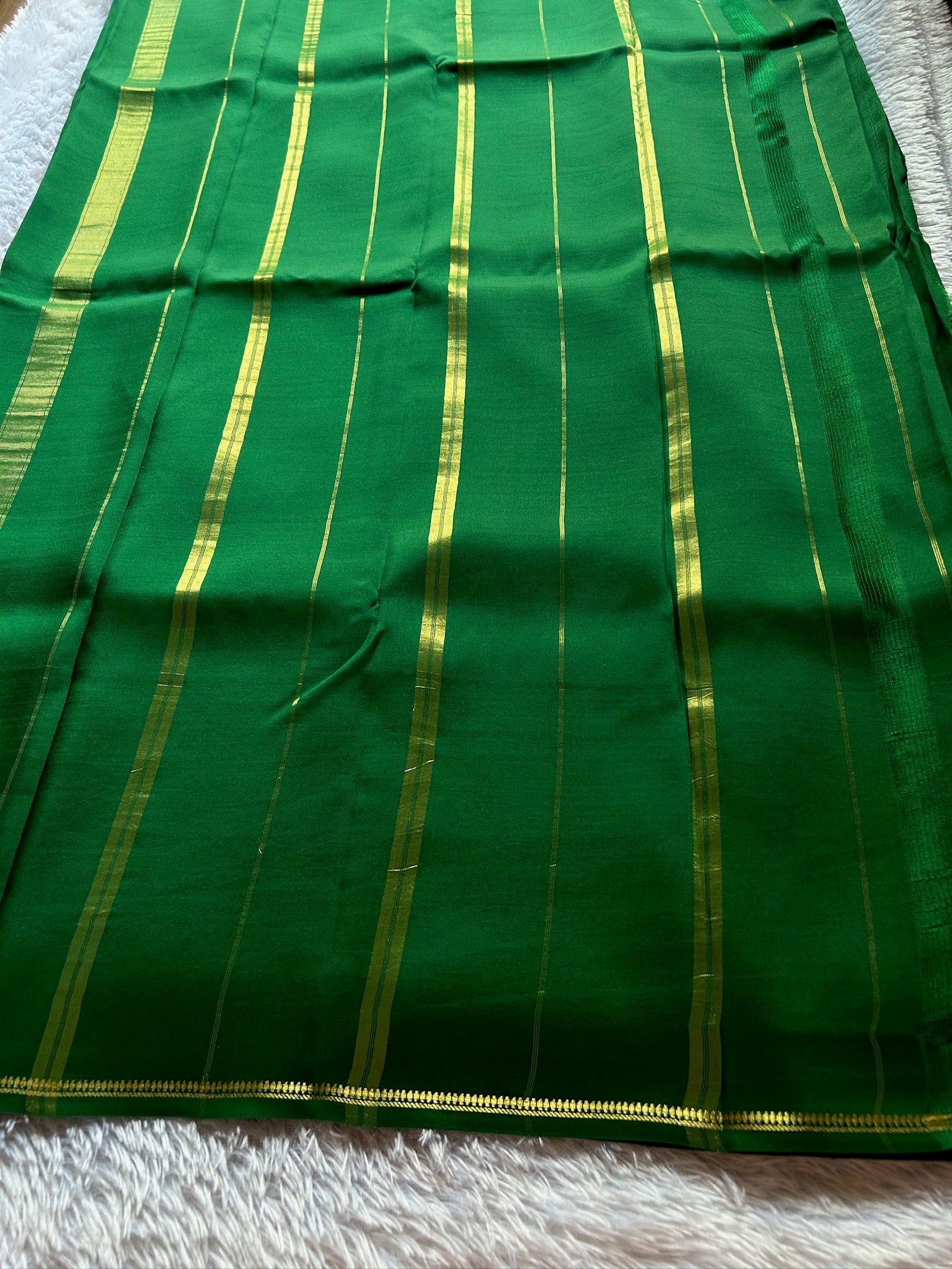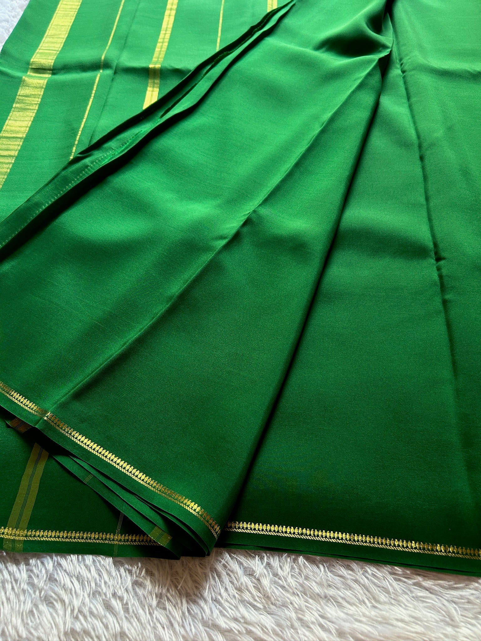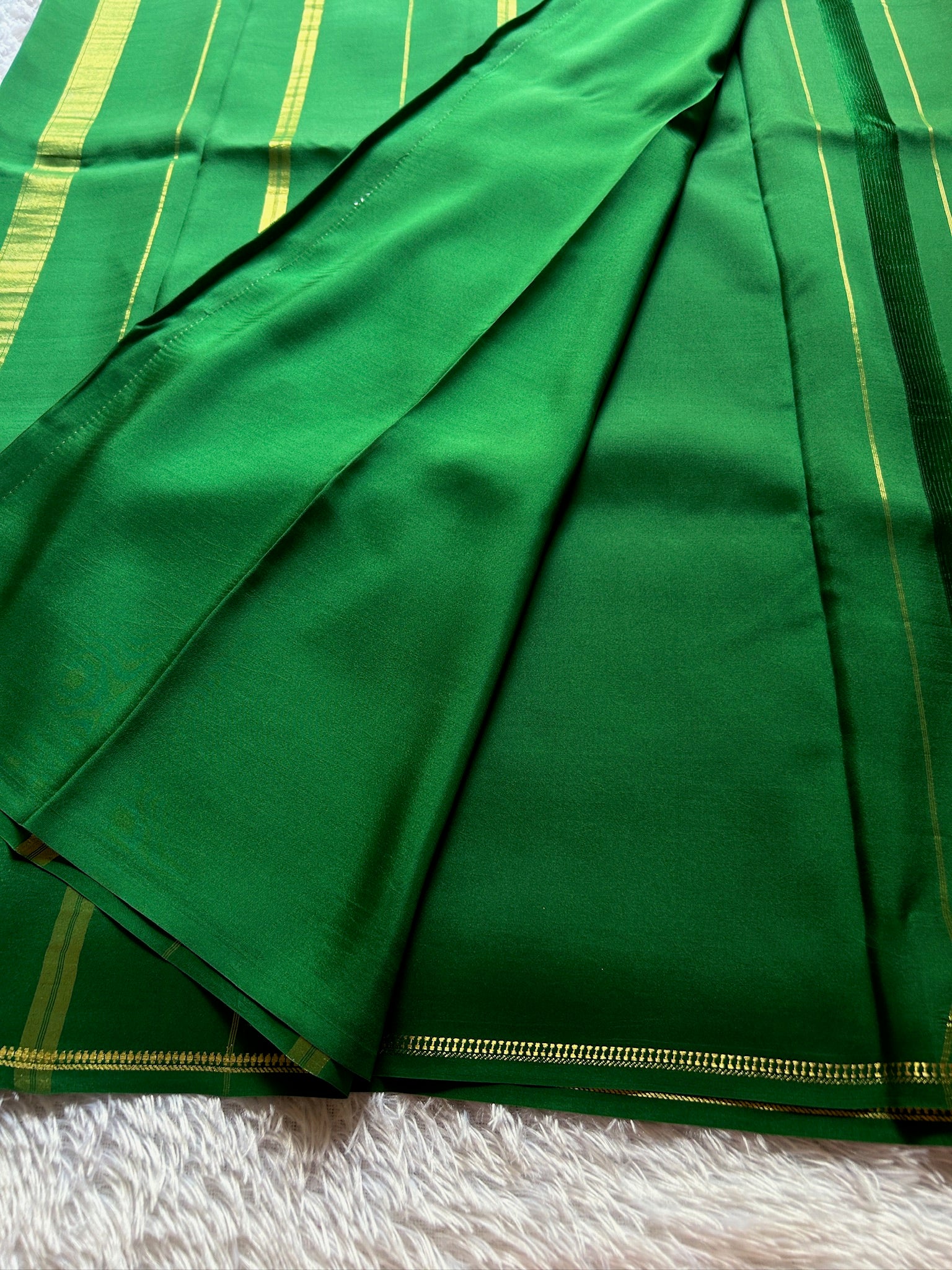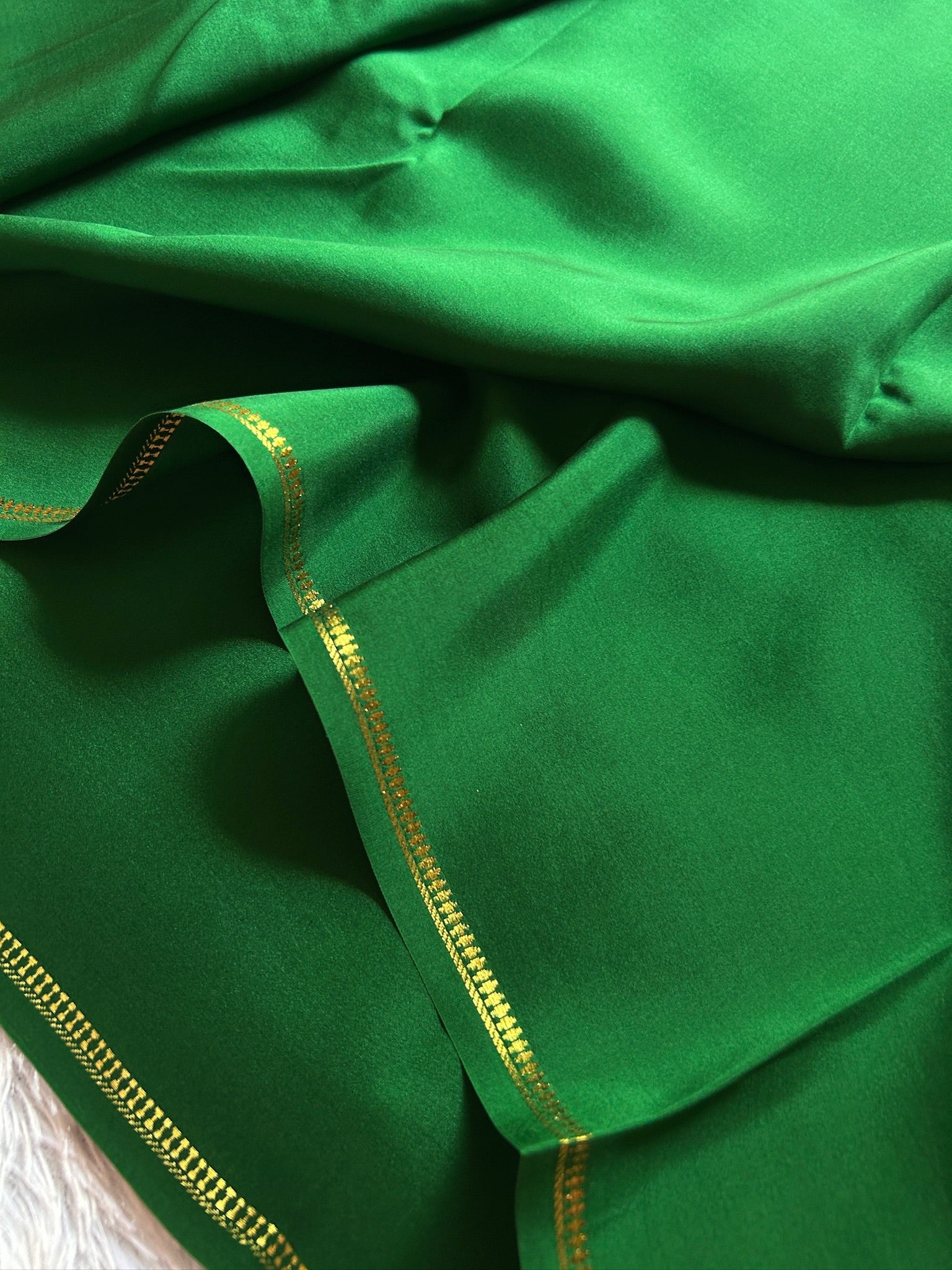 Experience elegance with the Mani saree in solid emerald green, crafted from pure CSG Binny crepe silk. Its rich texture is beautifully complemented by a delicate pure gold zari border and pallu, adding a subtle shimmer that enhances its timeless appeal. Ideal for special occasions, this saree combines traditional craftsmanship with refined sophistication.