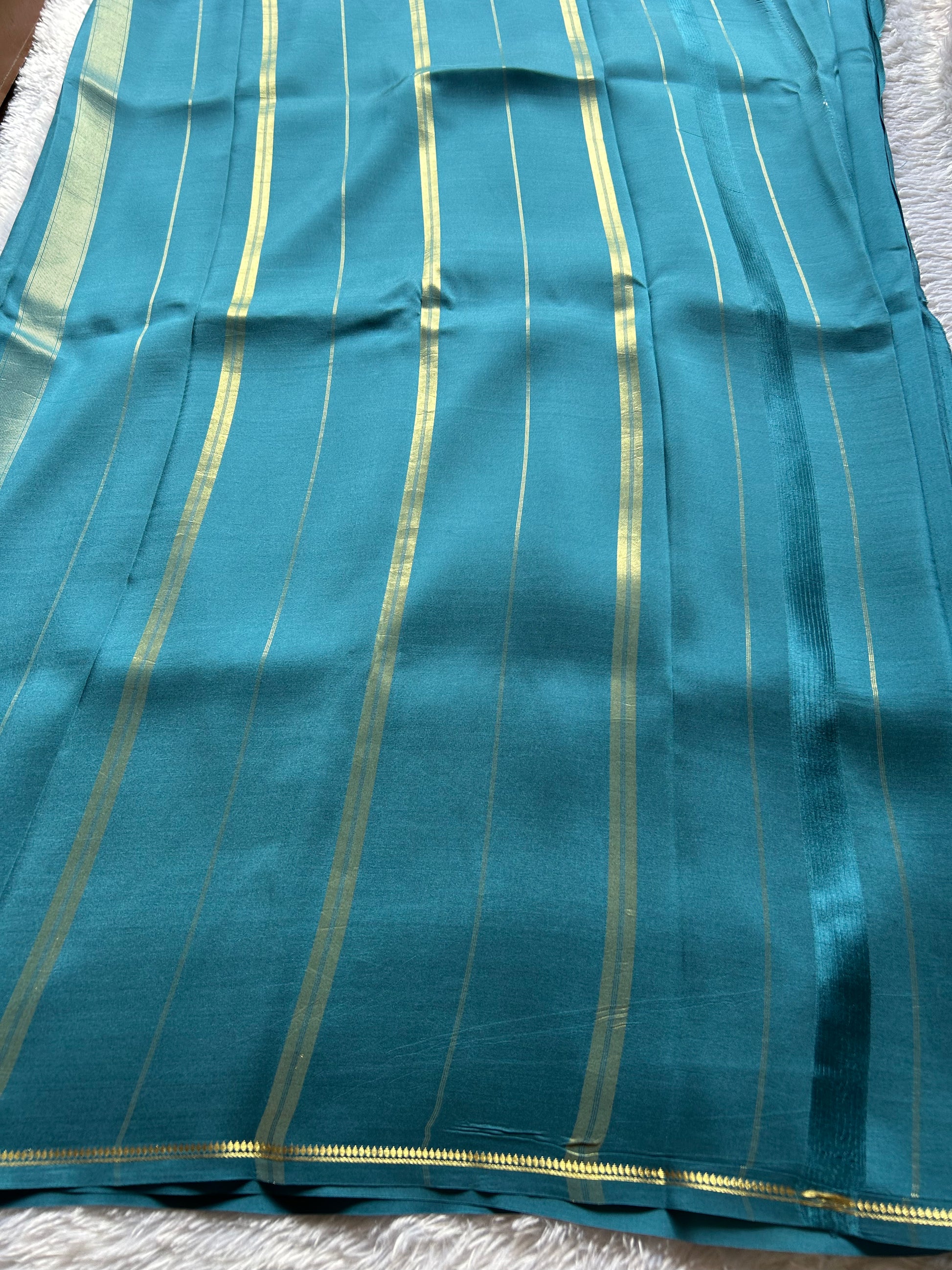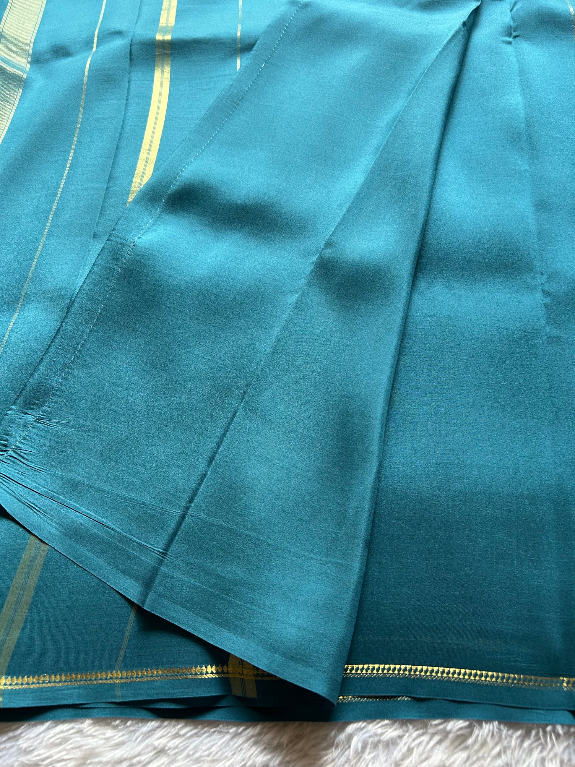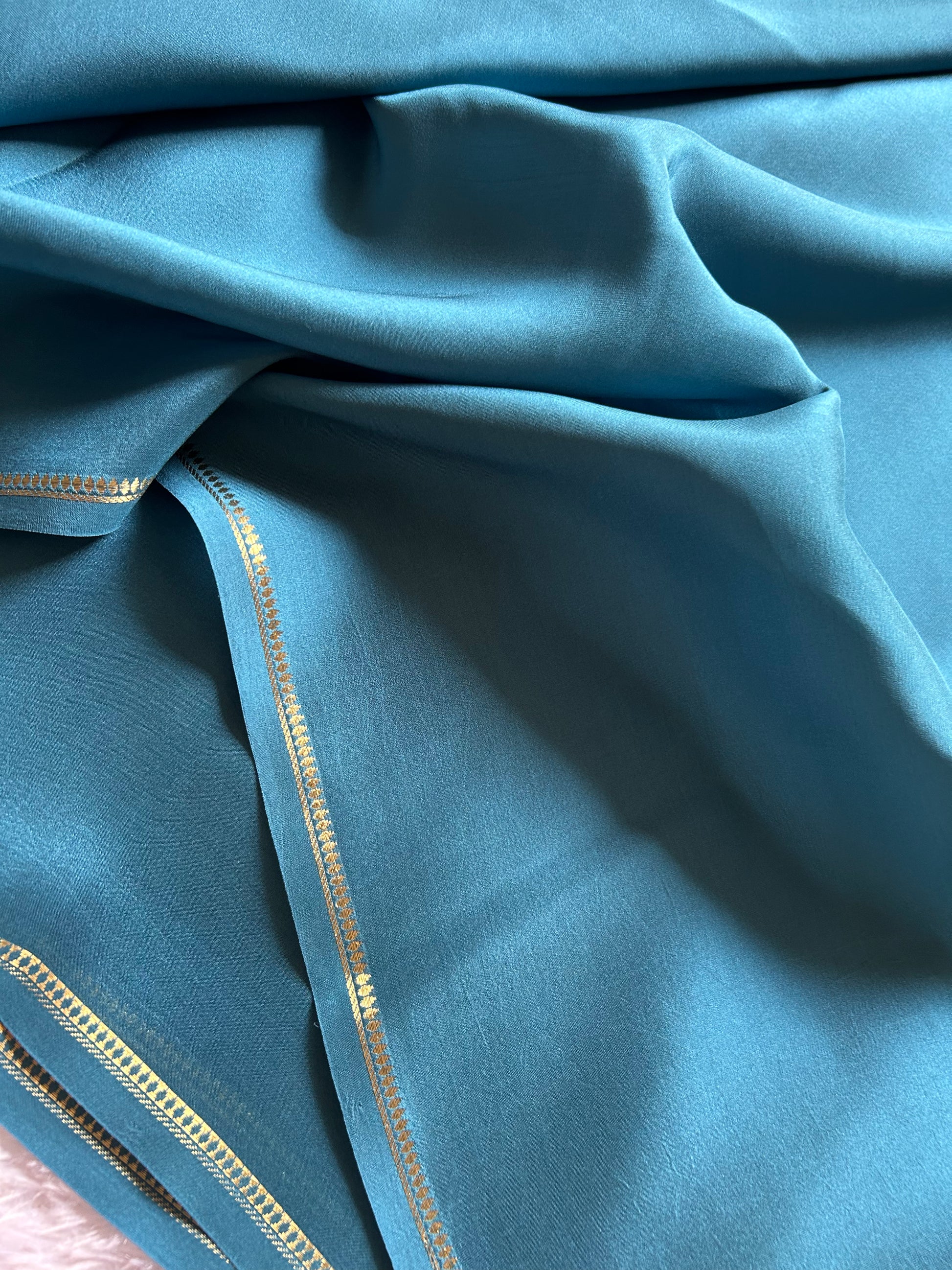 Immerse yourself in timeless elegance with this sea blue pure CSG Binny crepe silk saree, a masterpiece of refined craftsmanship. The luxuriously fluid crepe silk drapes beautifully, offering both comfort and sophistication for any occasion. Adorned with delicate pure gold zari detailing along the border and pallu, this saree showcases traditional artistry with understated opulence. The rich sea blue hue provides a versatile canvas that complements various skin tones, while the intricate gold embellishment elevates the piece to heirloom quality. Perfect for celebrations, formal gatherings, or when you seek to make a discerning statement.