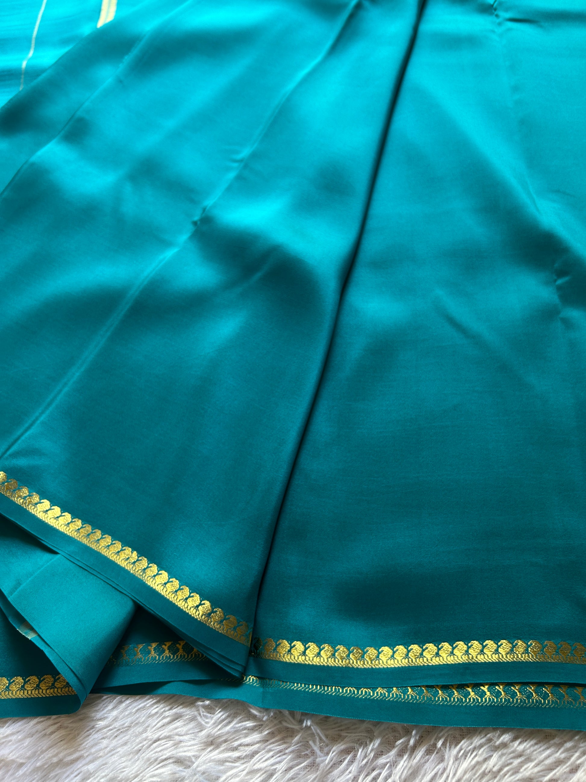 This Manikya saree in solid Ananda blue features premium pure Binny crepe silk renowned for its soft texture and elegant drape. Accentuated with a delicate small gold zari border featuring traditional mango motifs, it showcases subtle gold zari detailing on the pallu, adding a refined touch of sophistication. Ideal for formal occasions, this saree blends classic charm with understated luxury, offering a timeless style statement for discerning connoisseurs of silk sarees.