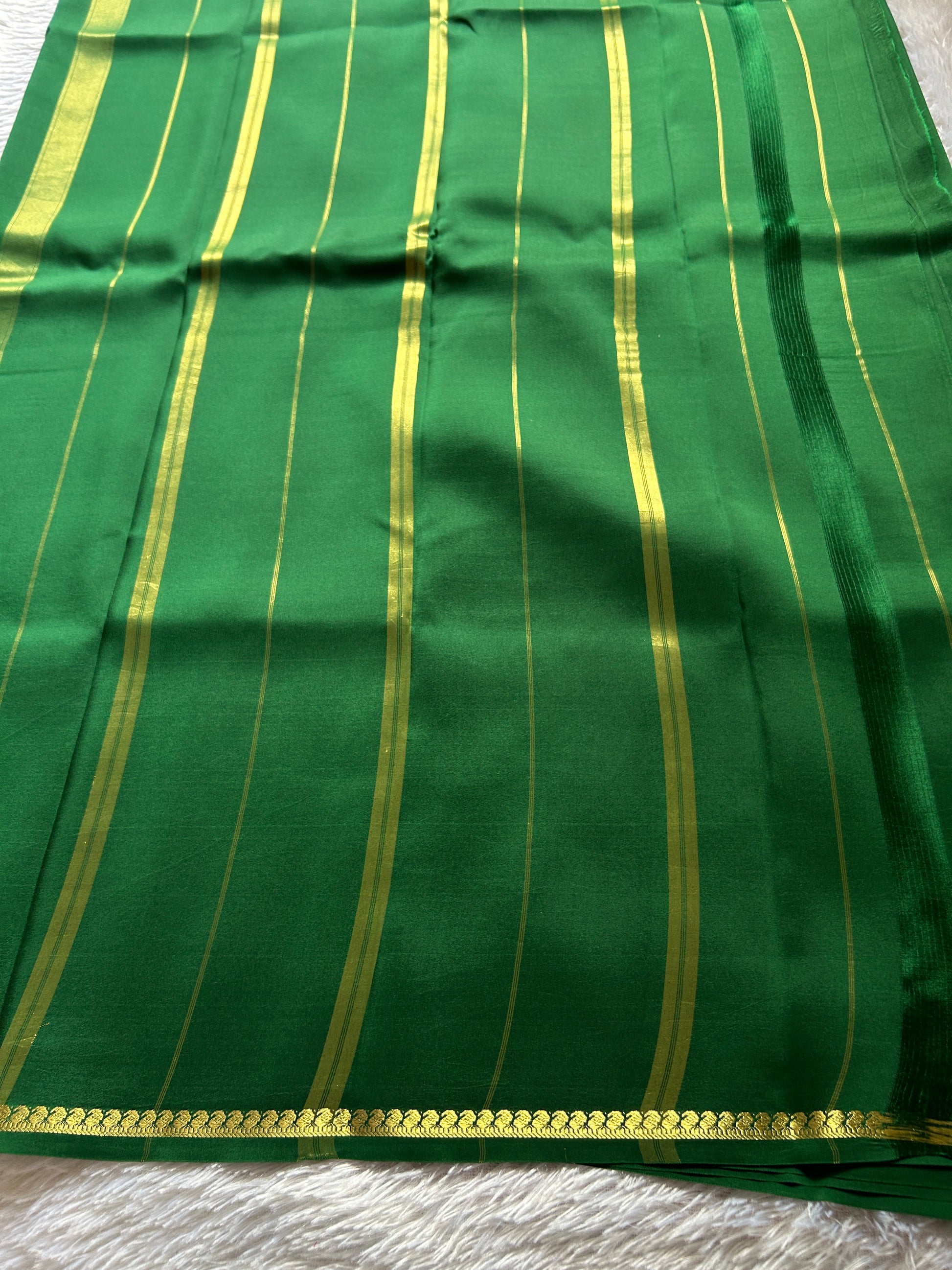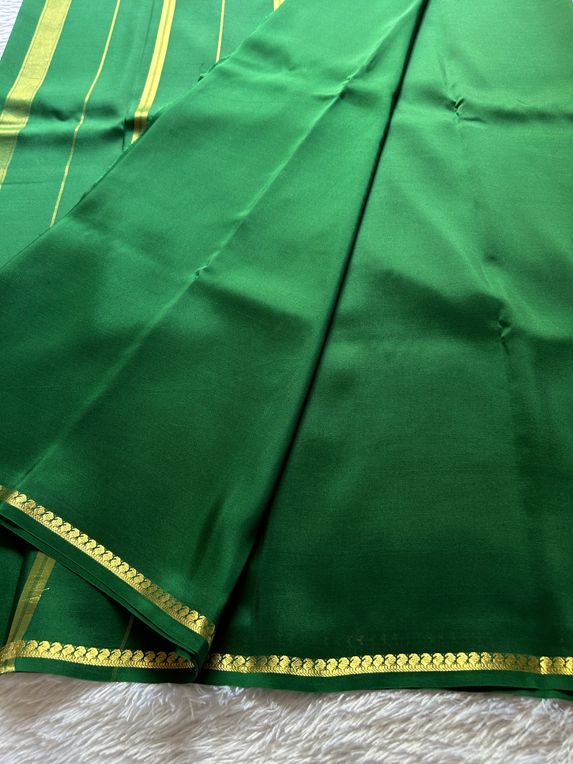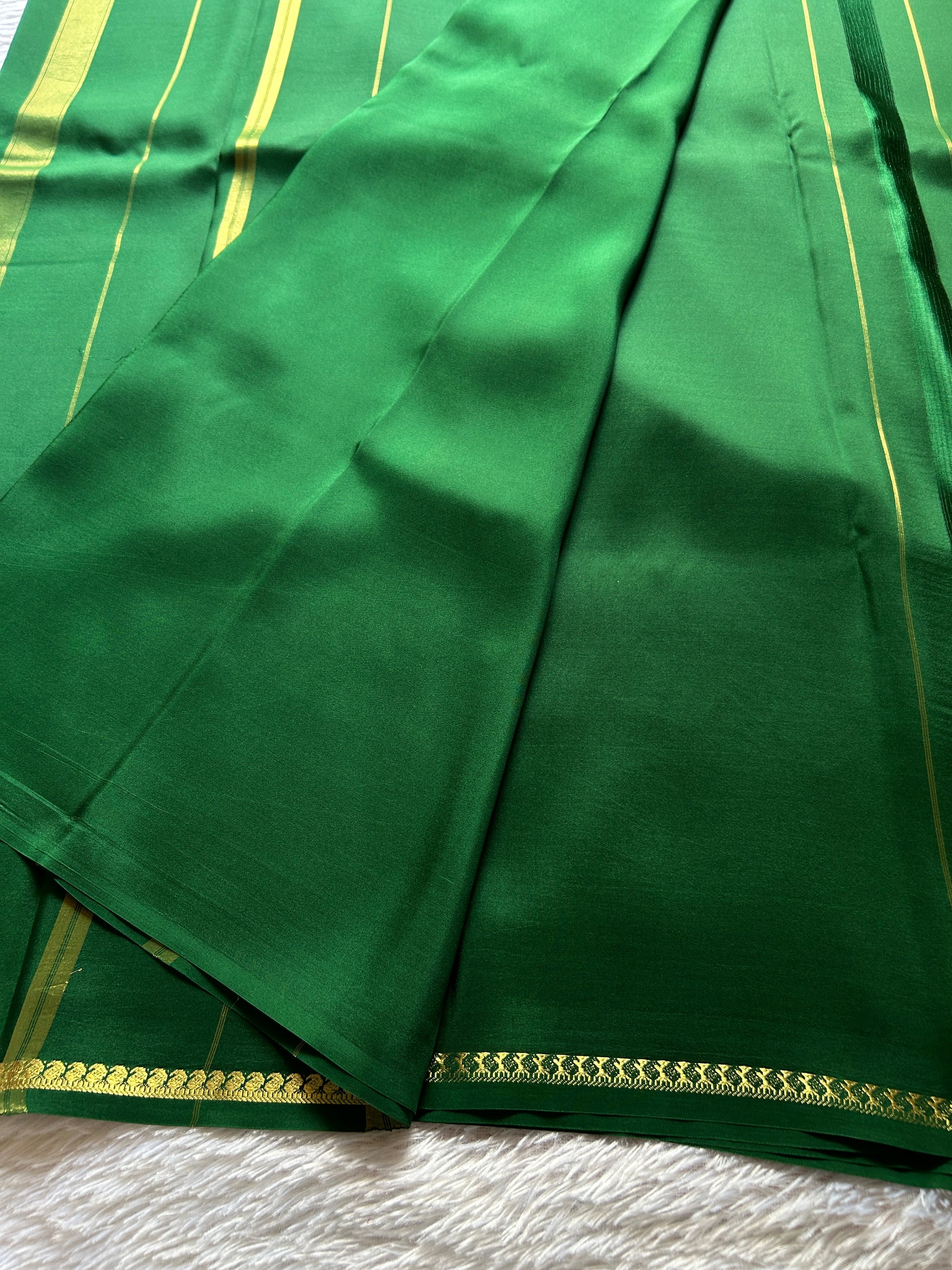 This exquisite bottle green CSG zari pure Binny crepe silk saree features a delicate small gold zari border adorned with intricate mango motifs. The pallu is elegantly enhanced with subtle gold zari work, adding a refined touch to its luxurious texture. Perfect for connoisseurs of traditional silk, this saree combines classic craftsmanship with timeless elegance.