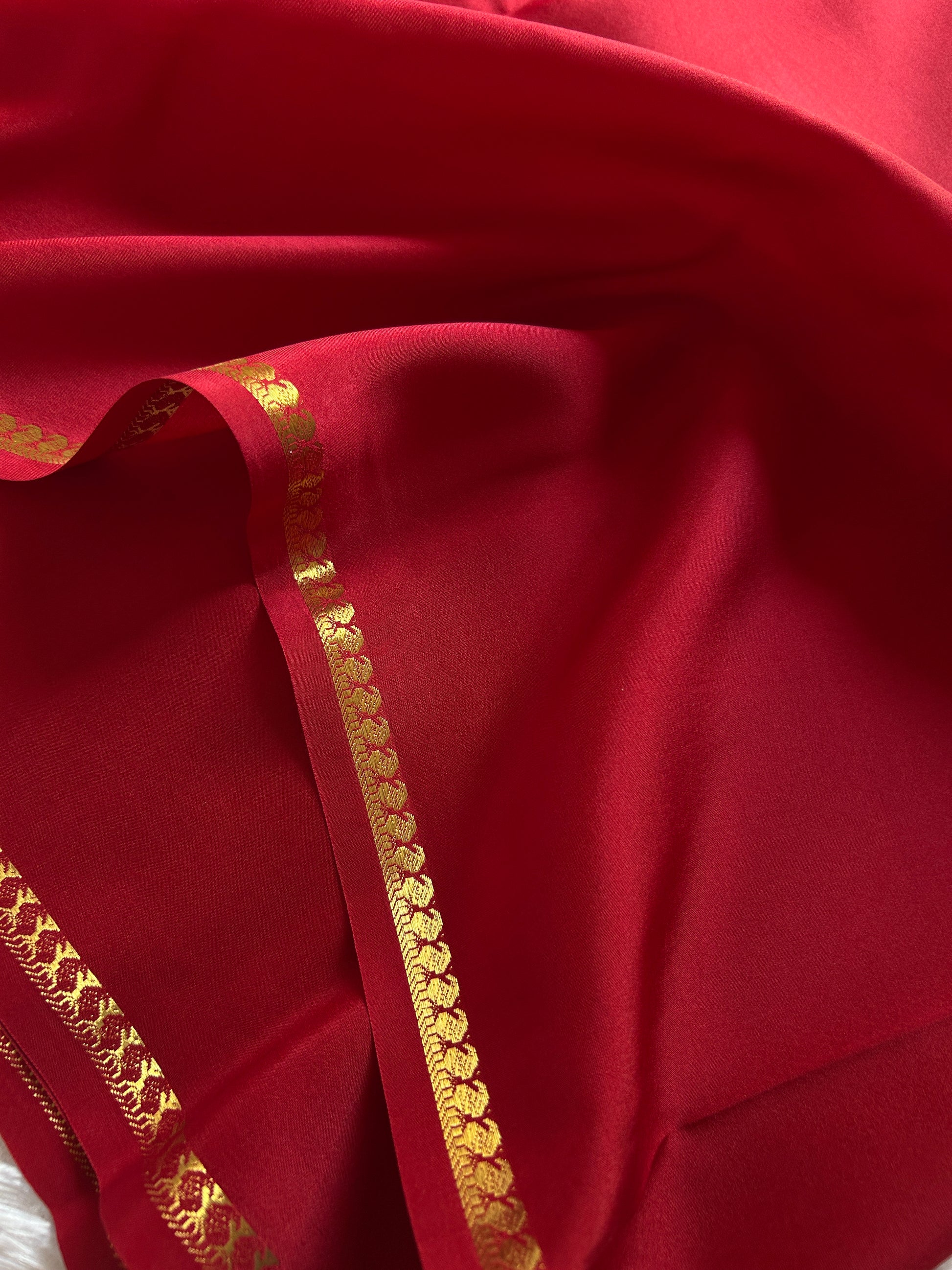This Manikya saree in solid cherry red showcases pure Binny crepe silk enriched with delicate gold CSG zari. Featuring a slender gold zari border adorned with traditional mango motifs, it exudes understated elegance. The pallu highlights subtle gold zari work, enhancing the saree’s timeless appeal. Perfect for those who appreciate refined craftsmanship and classic charm.