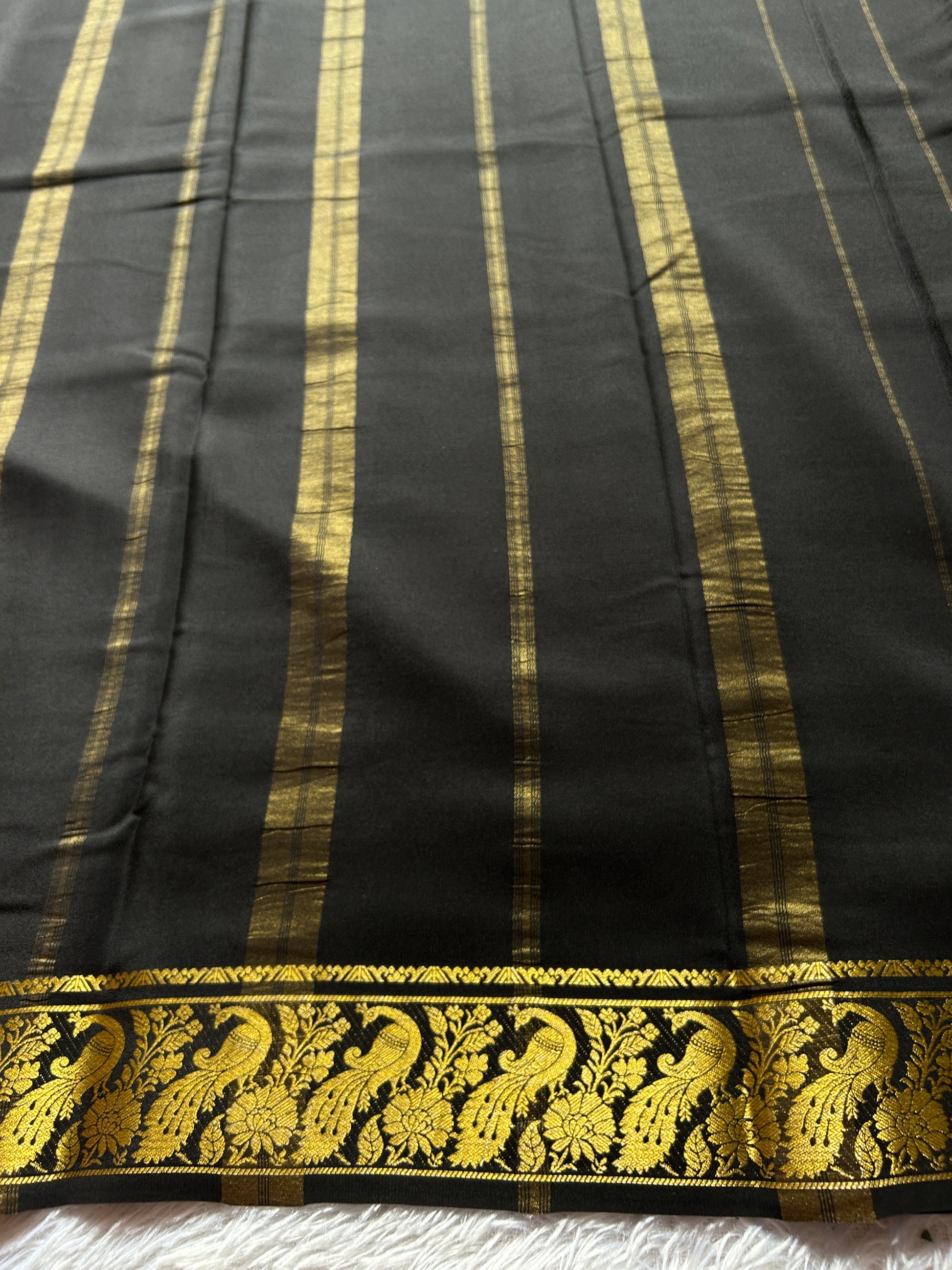 This elegant black Mysore crepe silk saree, crafted from 110 GSM pure silk, features a sophisticated zari border adorned with intricate peacock and floral motifs. Its lightweight texture ensures comfort while the detailed craftsmanship highlights traditional artistry, making it an exquisite choice for formal occasions and celebrations.