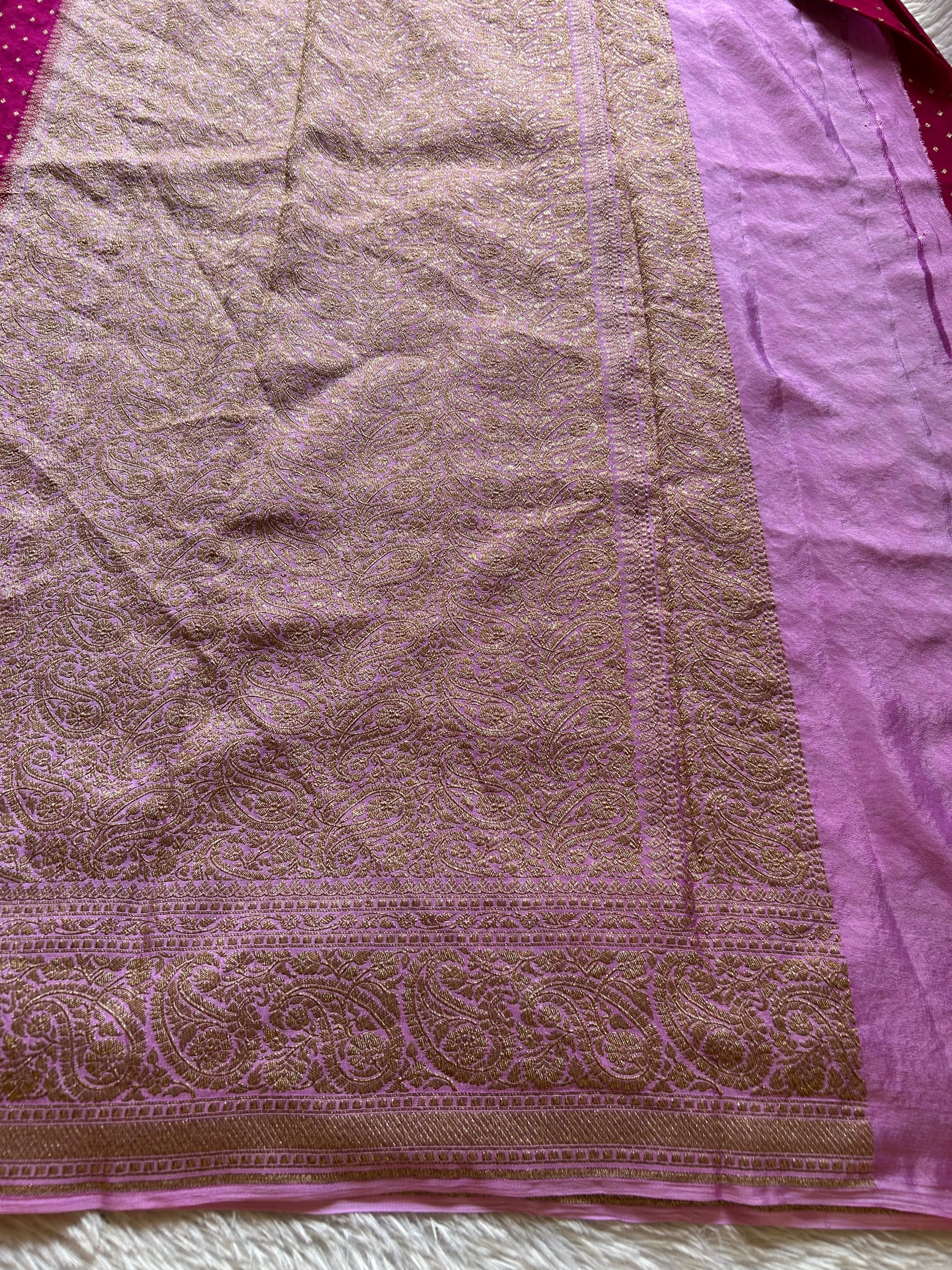Menaka showcases the timeless elegance of pure Banarasi crepe silk, rendered in a sophisticated dark pink with delicate zari buttas scattered throughout. The saree features a graceful baby pink border and pallu, creating a refined contrast that enhances its understated luxury. Complemented by a designer blouse piece adorned with intricate Banarasi zari work, this saree exemplifies traditional craftsmanship. The crepe silk fabric drapes beautifully while maintaining its structure, making it an ideal choice for weddings, celebrations, and formal occasions where refined sophistication is paramount.