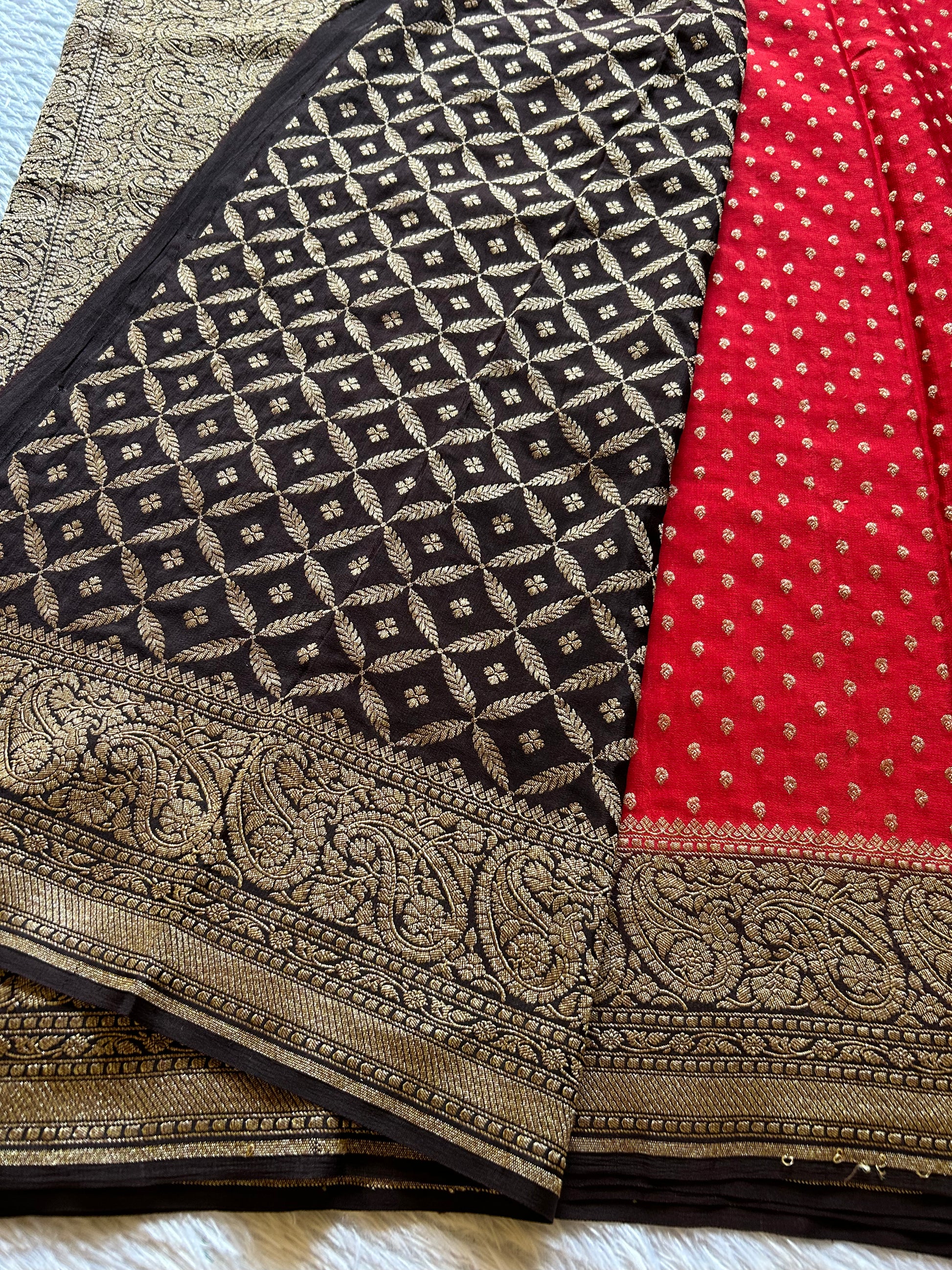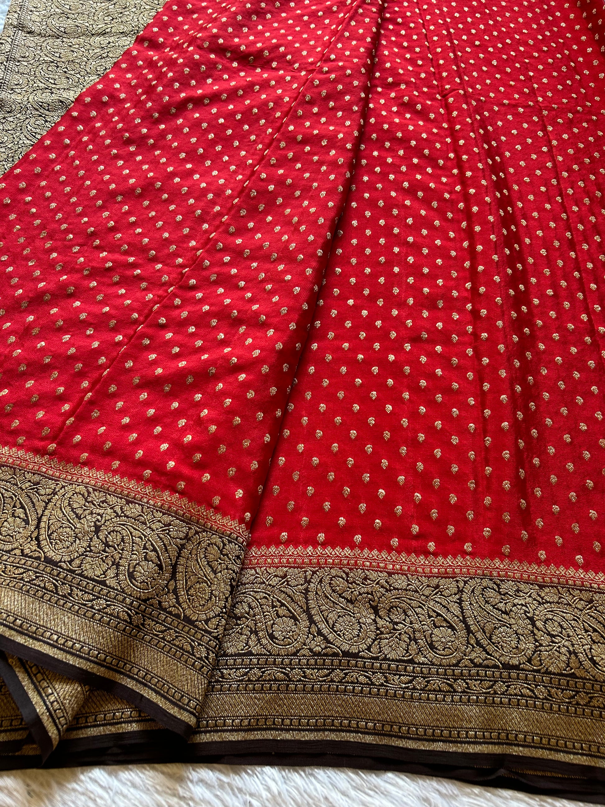 Menaka (2D) showcases the timeless elegance of pure Banarasi crepe silk in a striking red hue. Delicate zari buttas are scattered across the entire fabric, creating an intricate textured surface that catches light beautifully. The contrasting black border frames the saree with sophistication, while the matching black pallu features exquisite Banarasi zari work that serves as a stunning focal point. The accompanying designer blouse material is pre-embellished with authentic Banarasi zari detailing, allowing you to complete your ensemble with minimal effort. This saree exemplifies traditional craftsmanship merged with refined aesthetics, perfect for weddings, celebrations, and formal occasions where understated luxury is appreciated.
