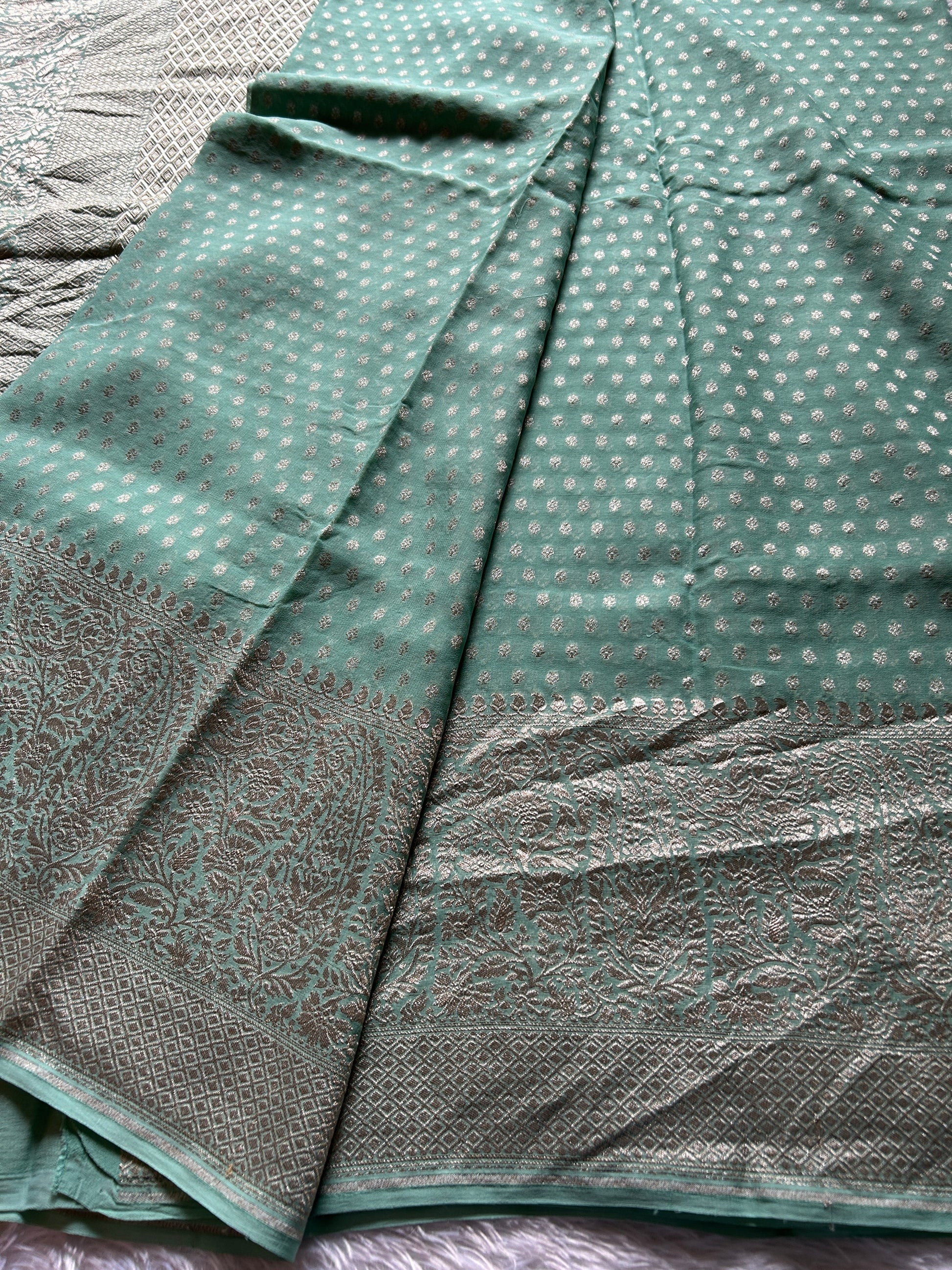 Elevate your ethnic wardrobe with this exquisite pastel mint green georgette saree, a masterpiece of refined elegance. The lightweight pure georgette fabric drapes beautifully, offering comfort without compromising on sophistication. Delicate buttas scattered across the entire length add subtle texture and visual interest, while the standout feature—a richly embellished border—showcases intricate zari work that commands attention. This versatile piece transitions seamlessly from festive occasions to formal gatherings, making it an essential addition for the discerning saree connoisseur.