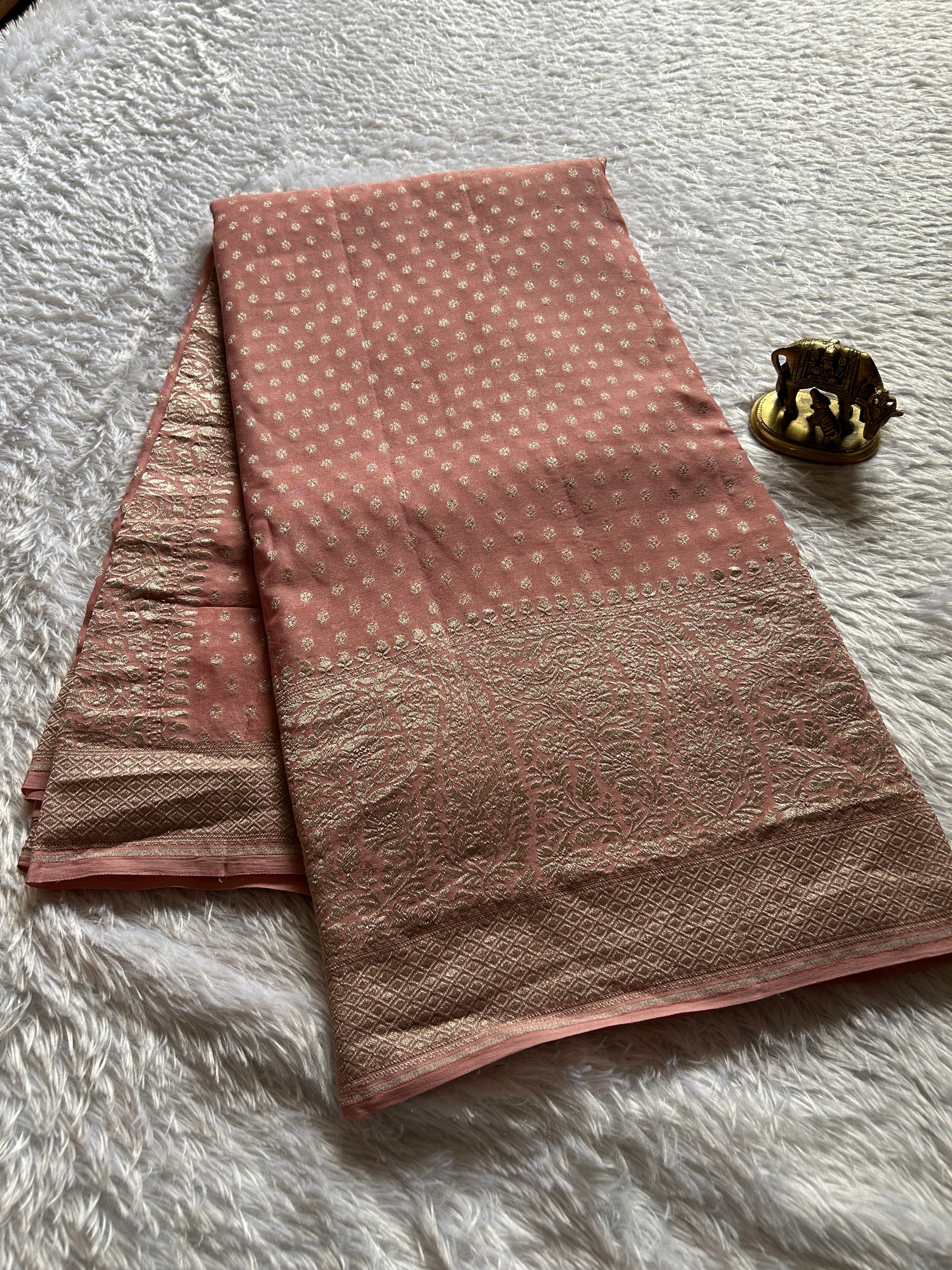 Drape yourself in understated elegance with this pastel peach georgette saree, a masterpiece of refined simplicity. The pure georgette fabric flows with effortless grace, while delicate buttas scattered across the length add subtle texture and visual interest. The standout feature is the magnificent border—richly adorned with intricate zari work that showcases traditional craftsmanship at its finest. Perfect for occasions demanding sophistication without ostentation, this saree balances minimalist aesthetics with luxurious detailing, making it an essential addition to any discerning wardrobe.