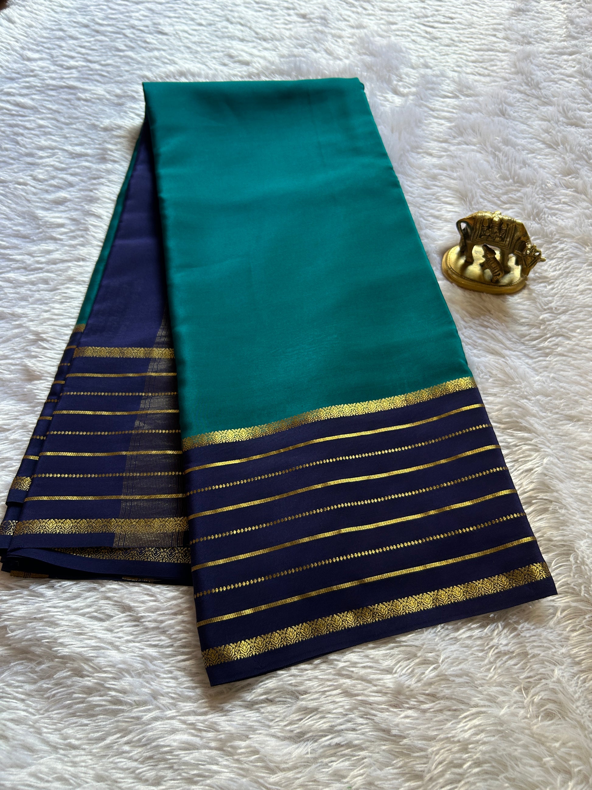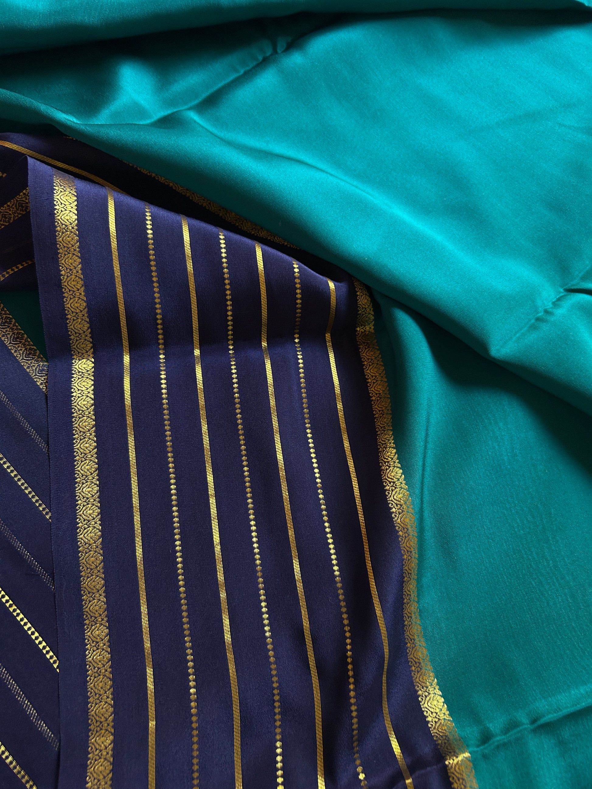 Navami (2D) showcases the timeless elegance of pure Mysore crepe silk in a sophisticated ananda blue hue. Crafted from premium 110 GSM fabric, this saree drapes with refined fluidity and subtle texture. The navy blue line border features intricate copper-silver silk (CSS) zari work, while the pallu displays matching CSS zari embellishment for coordinated opulence. The combination of crepe silk's natural sheen with lustrous zari detailing creates a versatile piece suitable for both festive occasions and refined everyday wear. A masterpiece for those who appreciate authentic South Indian weaving traditions.