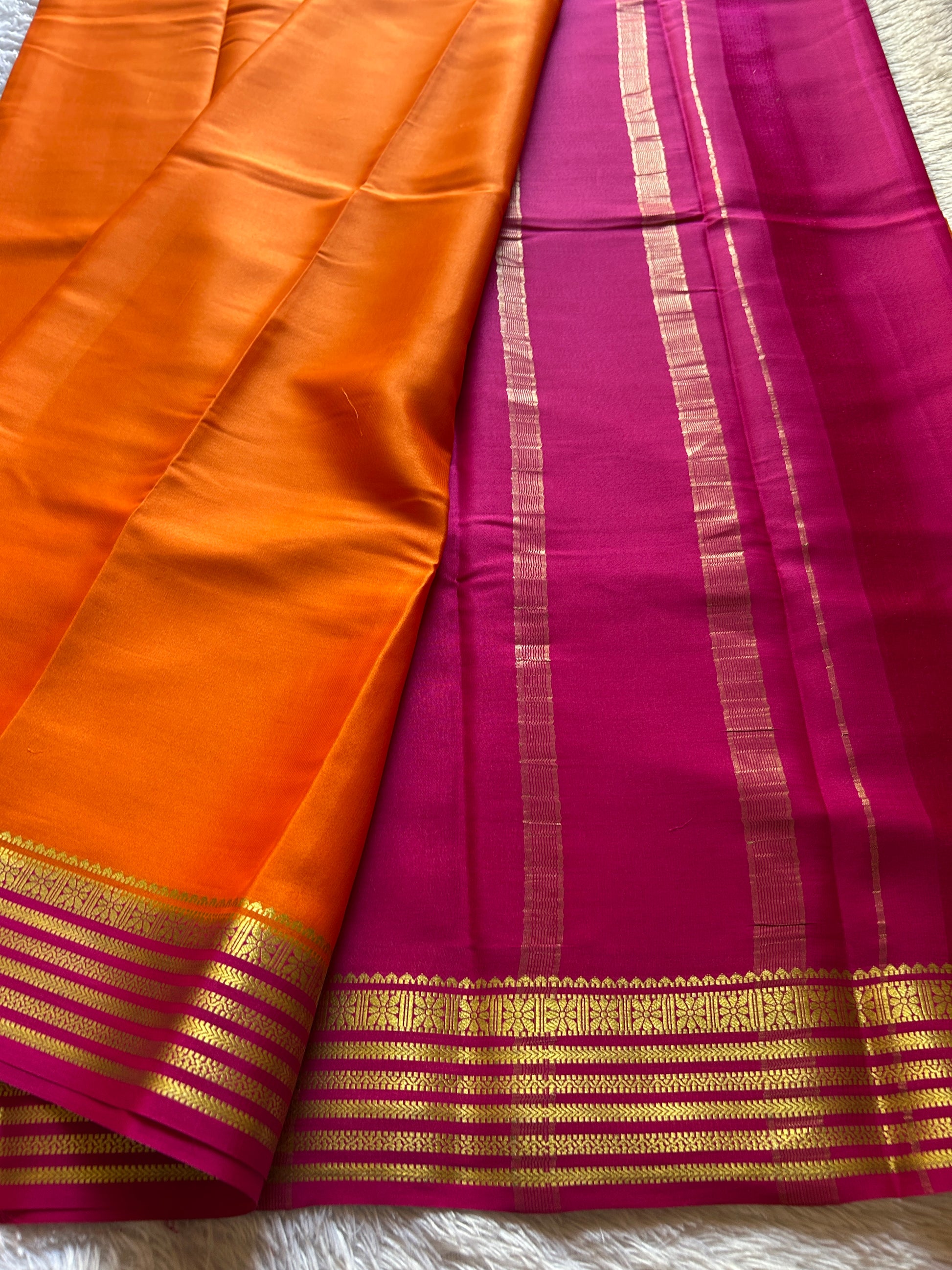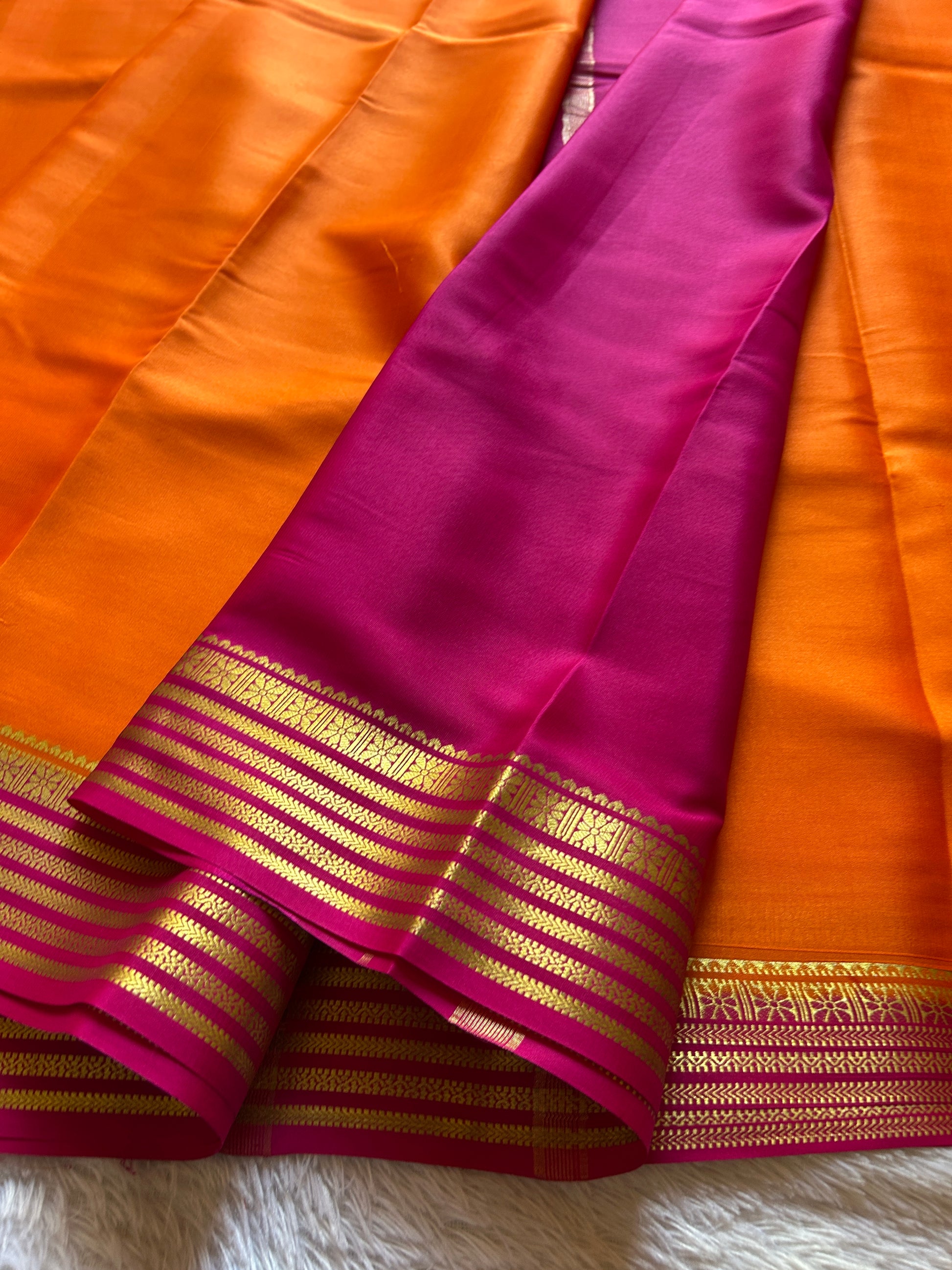 Experience timeless elegance with the Nayana saree crafted from lightweight, pure Mysore crepe silk. Its vibrant orange body is beautifully contrasted by a delicate pink border, enhanced with intricate zari work that adds subtle sophistication. This saree combines traditional craftsmanship with graceful drape, making it an ideal choice for formal occasions or festive celebrations. The breathable silk ensures comfort throughout the day while maintaining a rich, refined look.