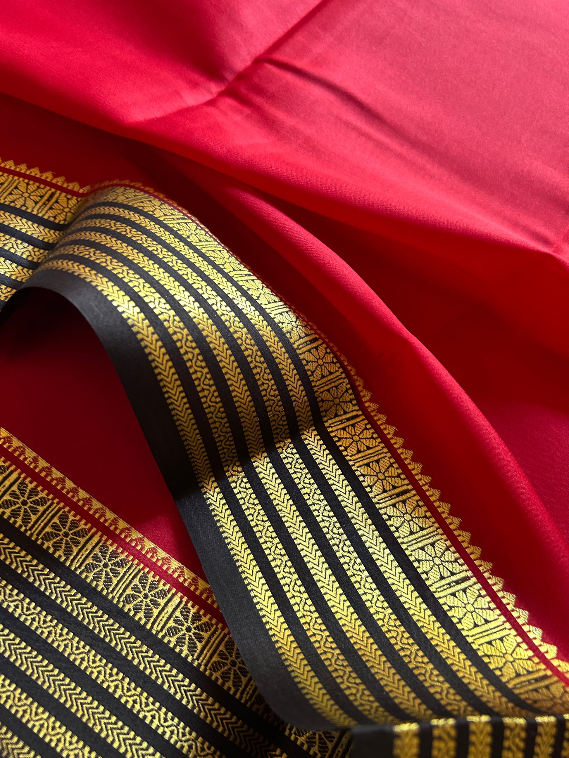 Elevate your elegance with the Nayana (2D) saree, crafted from lightweight pure Mysore crepe silk renowned for its smooth texture and enduring quality. The vibrant red body pairs exquisitely with a black border, highlighted by intricate work along delicate zari lines. This saree blends traditional craftsmanship with a modern touch, offering both comfort and a refined aesthetic perfect for special occasions or formal events.