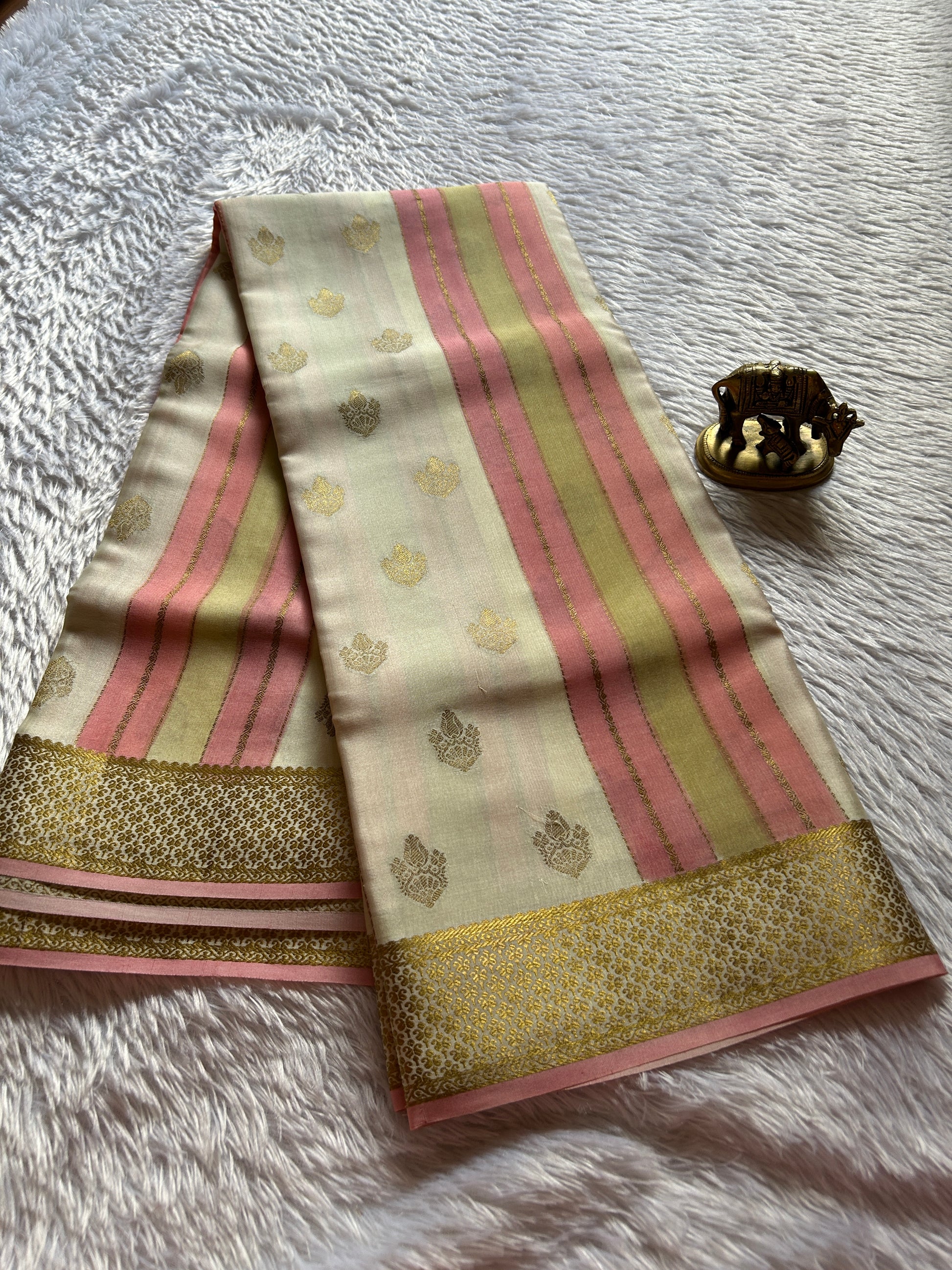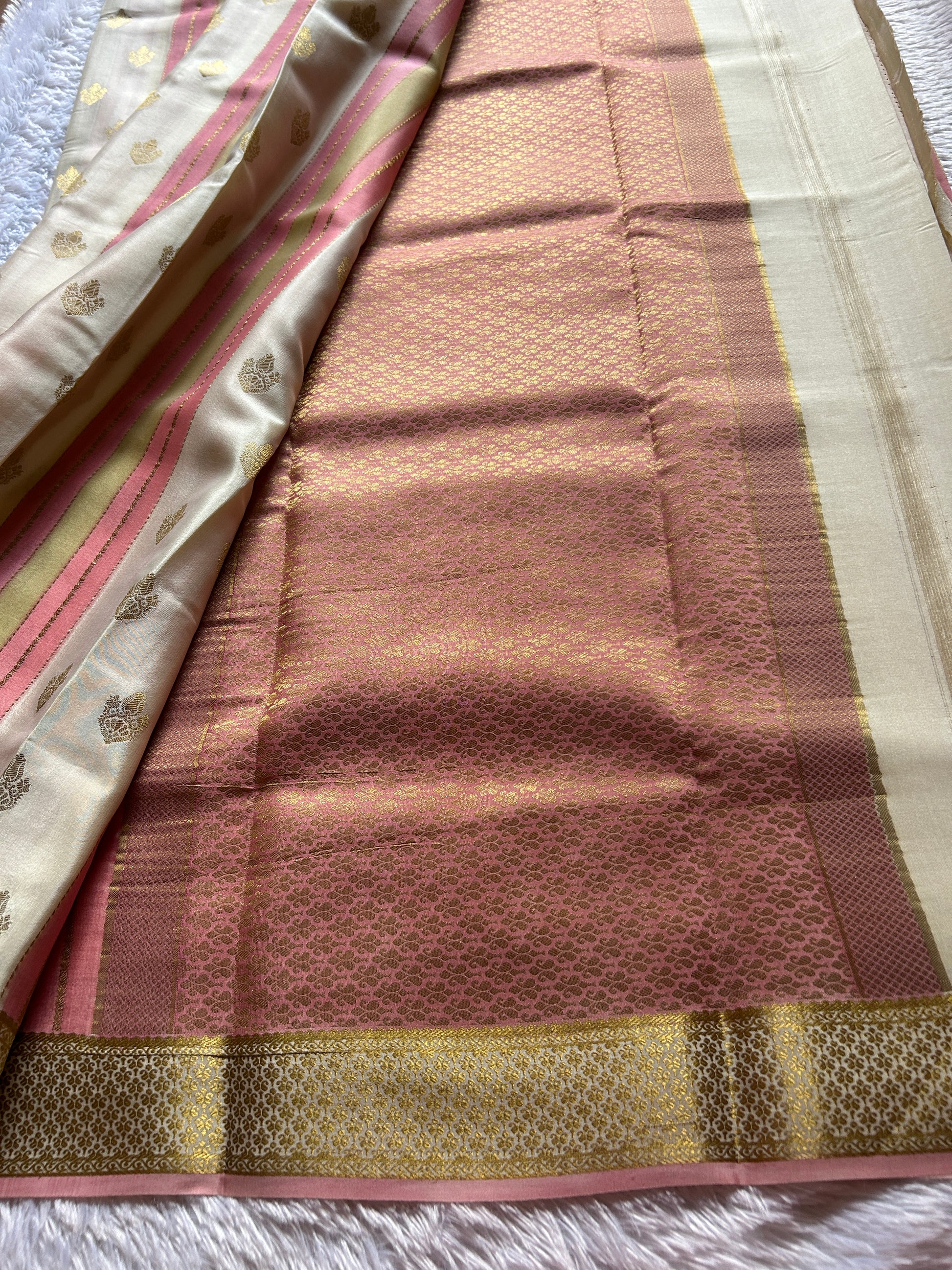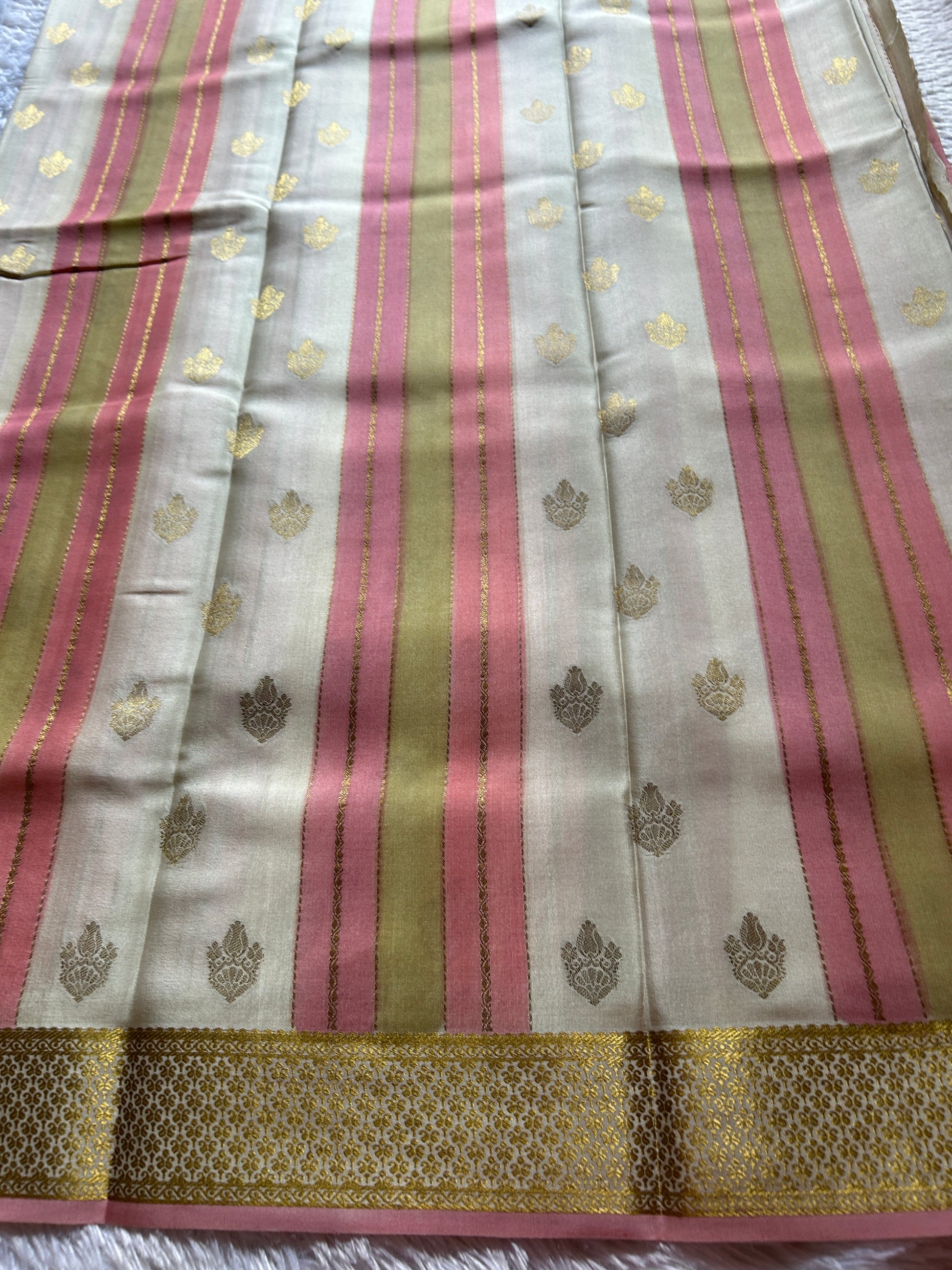 Experience timeless elegance with the Nisha Ombré Blush Pink saree, crafted from pure Mysore crepe silk. This exquisite piece features delicate vertical stripes adorned with fine zari lines and graceful zari buttas, enhancing its refined texture. The rich, intricate zari border adds a touch of sophistication, making it ideal for formal occasions or celebrations. Lightweight yet luxurious, this saree drapes beautifully, embodying expert craftsmanship and traditional artistry in every thread.