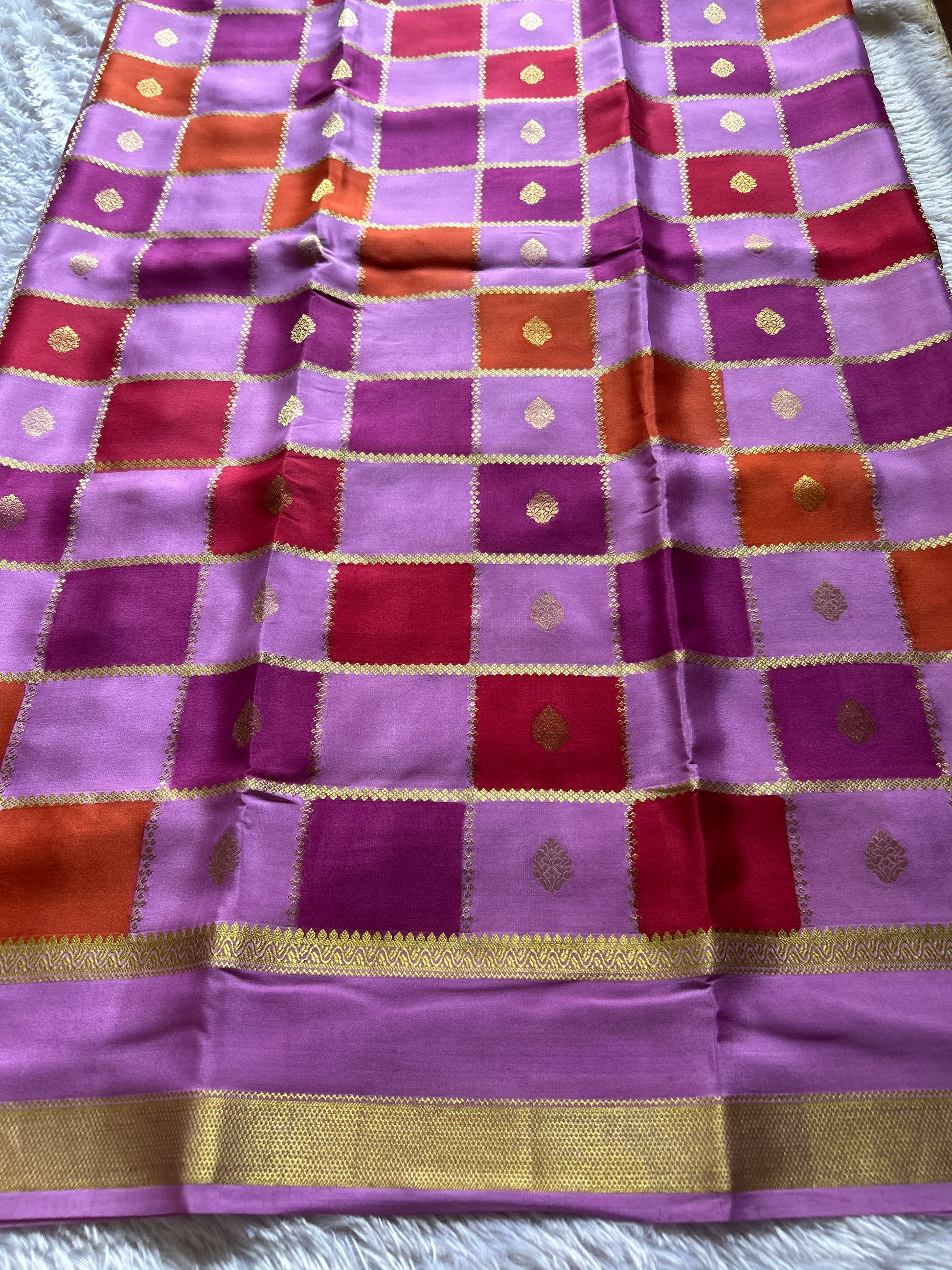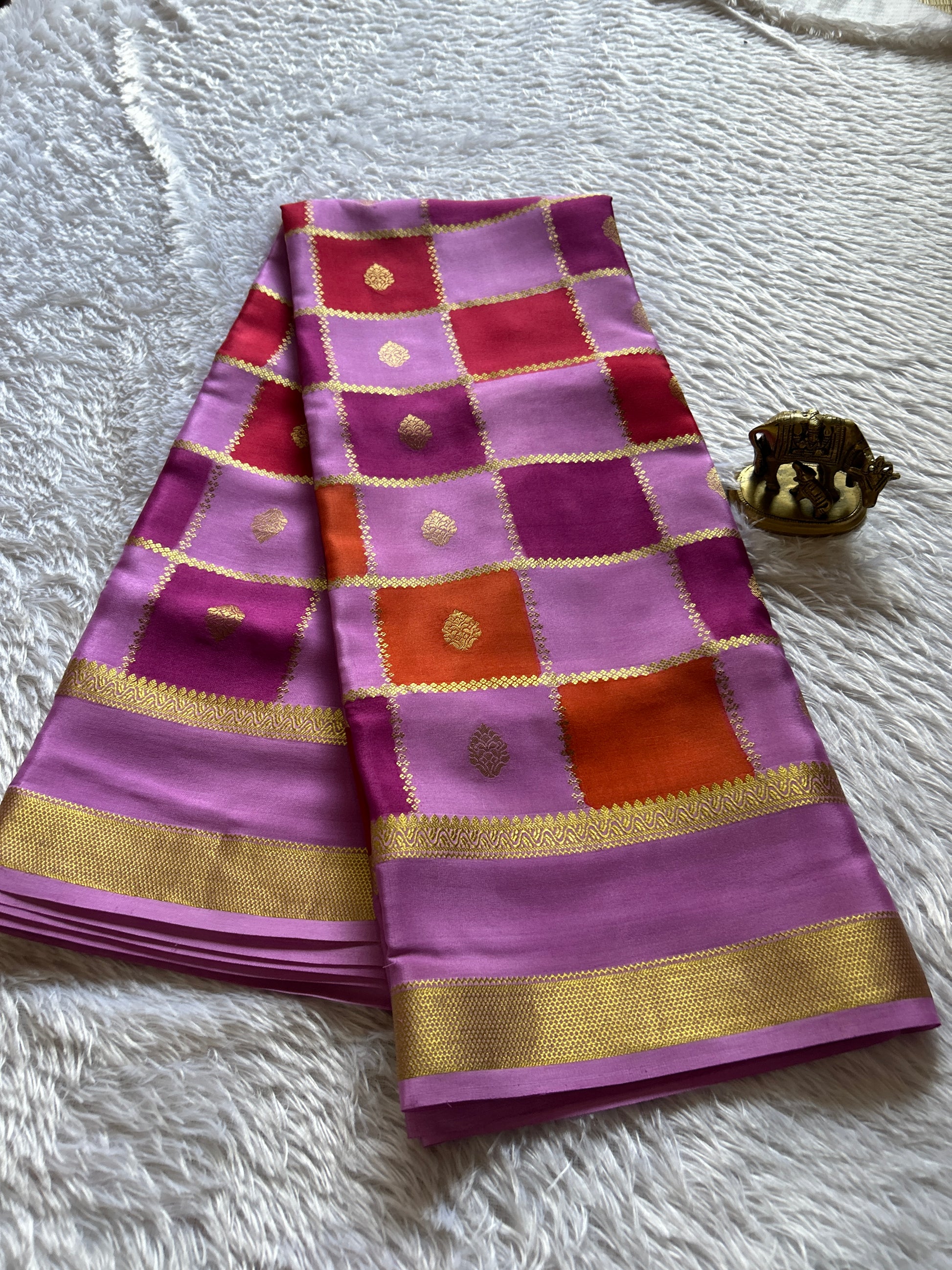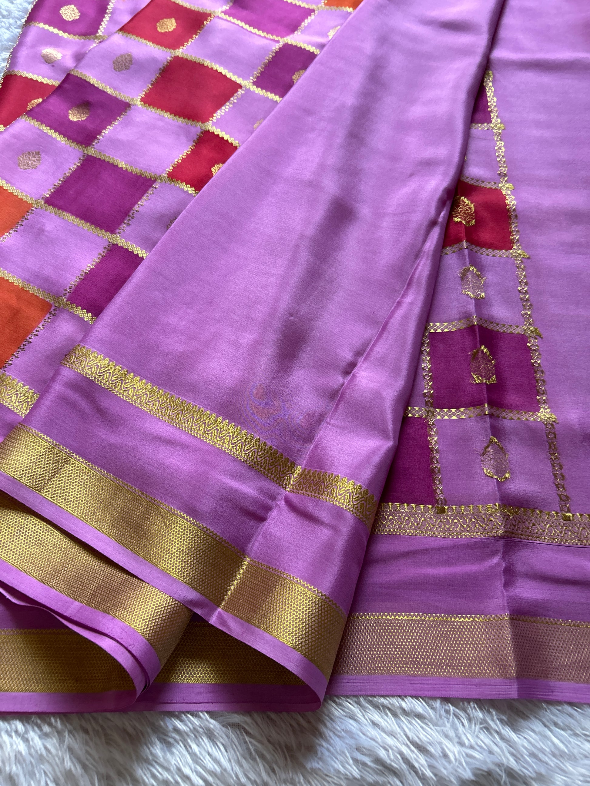 Nisha showcases the timeless elegance of pure Mysore crepe silk in a captivating lavender-pink palette. The saree features an exquisite ombré effect across zari checks, creating subtle depth and dimension throughout the weave. Delicate zari buttas are scattered across the fabric, while the border commands attention with its rich, intricately detailed zari work. The gap border adds architectural precision to this sophisticated piece, making it an ideal choice for celebrations where refined craftsmanship speaks volumes.