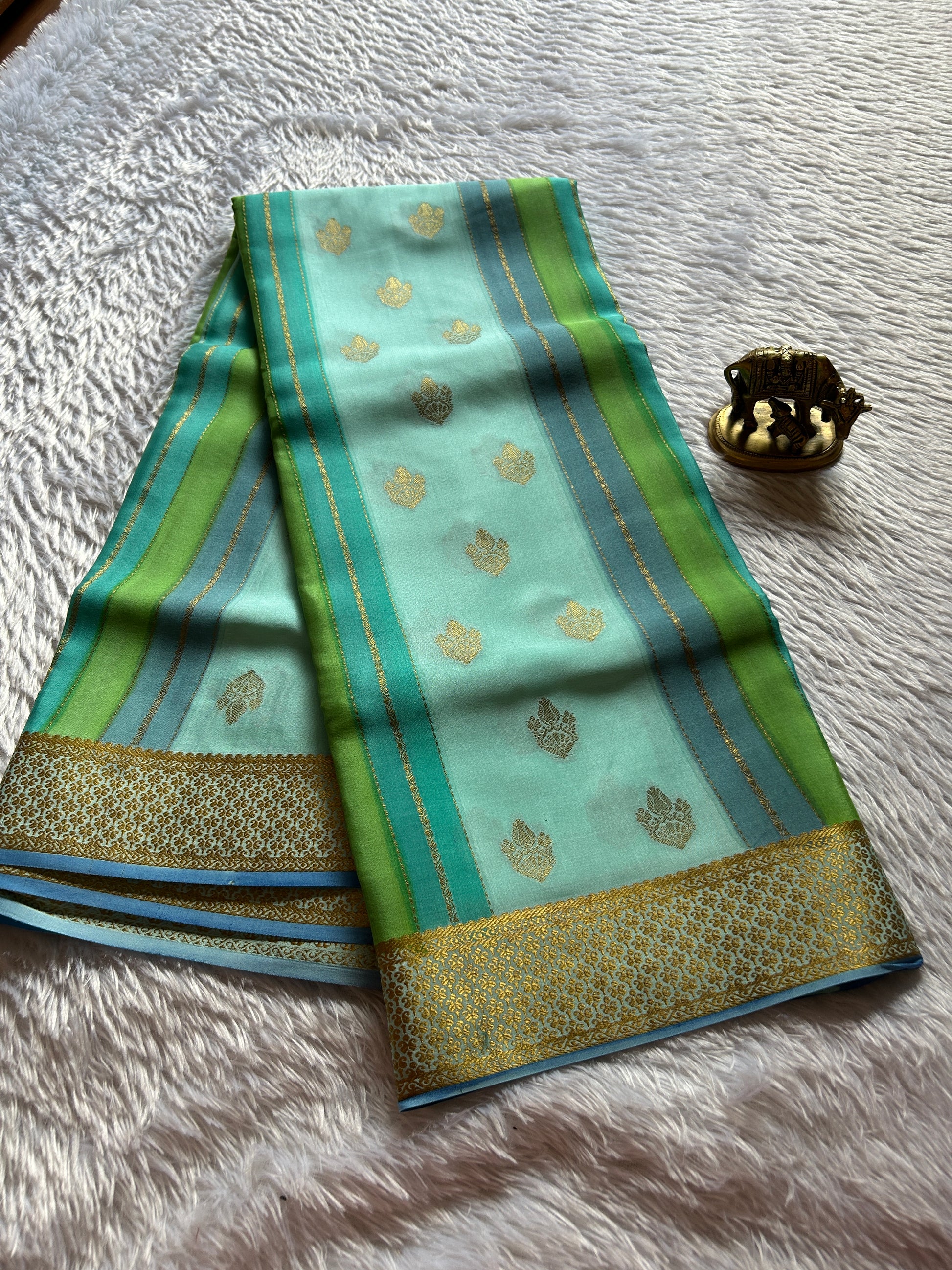 This sky blue ombré saree showcases the elegance of pure Mysore crepe silk, featuring vertical stripes highlighted by fine zari lines and delicate zari buttas. The rich, intricate zari border adds depth and a luxurious touch, embodying expert craftsmanship ideal for formal and traditional occasions. Its subtle color gradient and detailed embellishments enhance the saree’s sophisticated appeal, making it a distinguished choice for refined dressing.