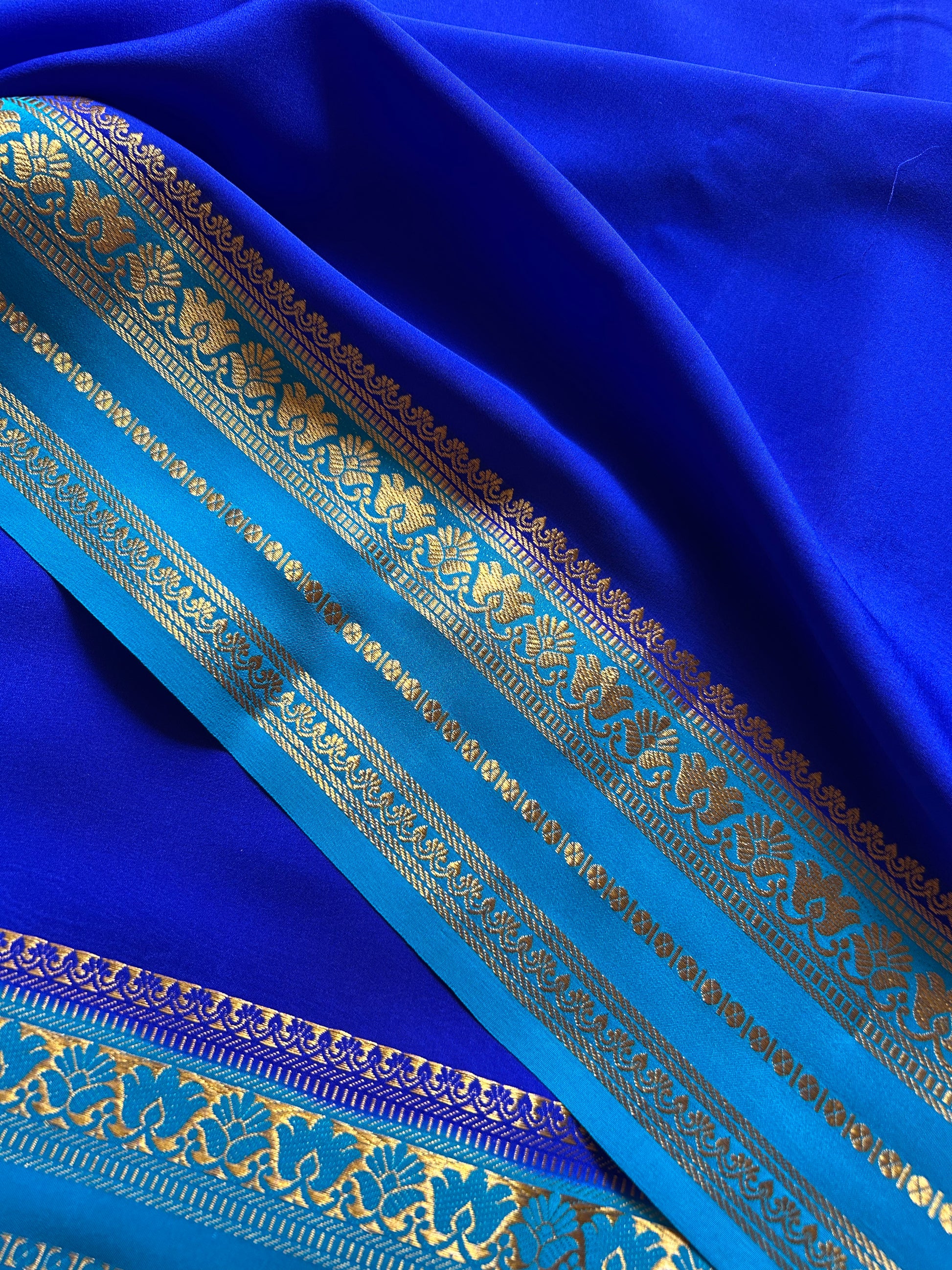 Elevate your ethnic wardrobe with this stunning royal blue Mysore crepe silk saree, crafted from pure Copper Silver Silk (CSS) for a luxurious drape and subtle sheen. The exquisite ananda blue CSS zari border adds sophisticated detailing that catches light beautifully. Perfect for weddings, festivals, and special occasions, this saree combines traditional craftsmanship with timeless elegance. The rich color palette and intricate zari work make it a versatile choice that pairs effortlessly with classic jewelry and traditional styling.