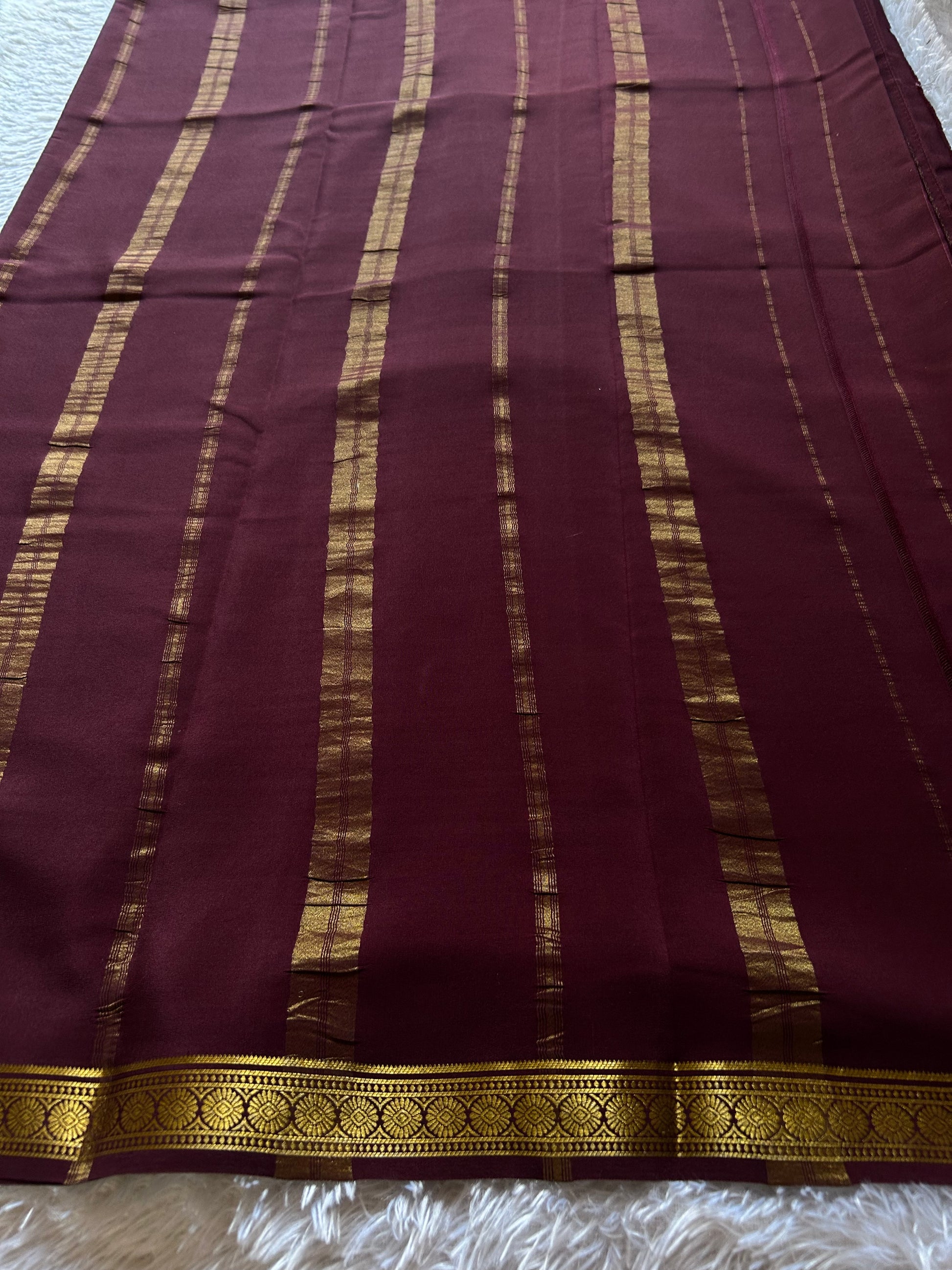Parijata celebrates timeless elegance in rich deep brown, crafted from pure Mysore crepe silk that drapes with natural grace. This sophisticated saree features intricate CSS zari work along the border, adorned with delicate flower motifs that add refined detail without overwhelming the solid palette. The Copper Silver Silk composition ensures a subtle luminosity that catches light beautifully, making it equally suited for festive occasions and formal gatherings. The crepe silk's inherent texture provides comfortable wear throughout the day, while the traditional zari embellishment speaks to masterful craftsmanship. A versatile choice for those who appreciate understated luxury and classic saree aesthetics.