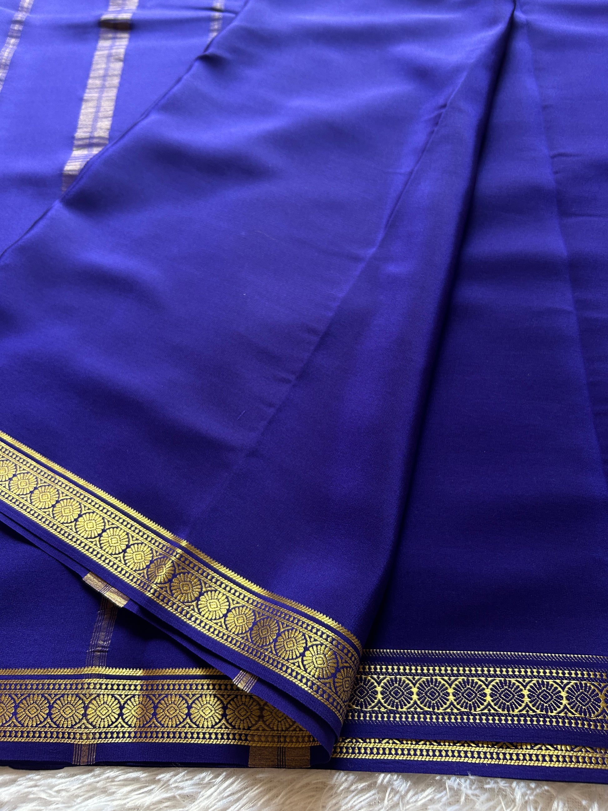 Elevate your ethnic wardrobe with this exquisite navy blue Mysore crepe silk saree, crafted from pure Copper Silver Silk for a luxurious drape and subtle sheen. The saree features an intricately designed border adorned with CSS zari work, showcasing delicate flower motifs that add timeless elegance to the solid base. The crepe silk fabric ensures comfortable wear throughout the day while maintaining its graceful silhouette. Perfect for festive occasions, celebrations, or formal gatherings, this Parijata saree combines traditional craftsmanship with refined aesthetics. The sophisticated navy blue hue pairs effortlessly with various blouse options, making it a versatile addition to your collection.