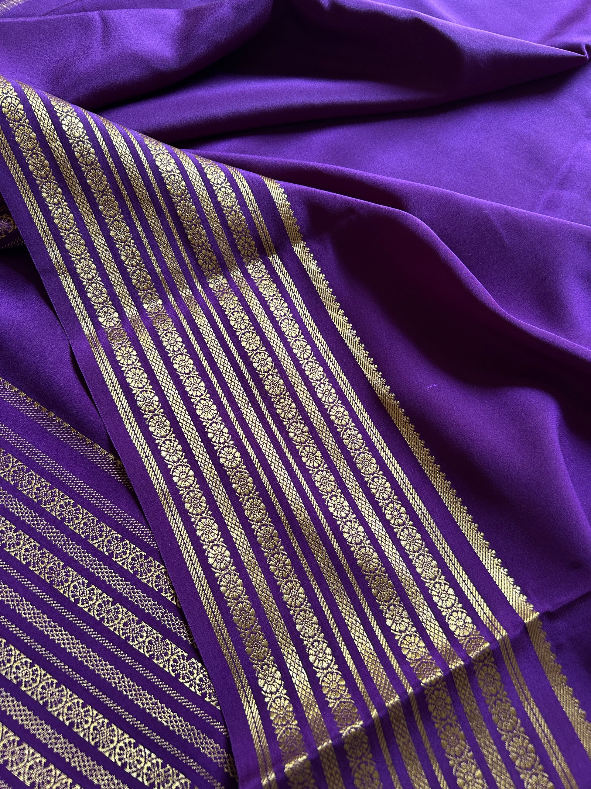 Parimala exemplifies understated luxury in a mesmerizing deep violet, constructed from pure Mysore crepe silk renowned for its distinctive texture and graceful movement. The saree is enriched with exquisite CSS zari work featuring delicate floral motifs that grace the border with traditional elegance. The Copper Silver Silk zari creates luminous accents against the deep violet base, enhancing the fabric's natural sheen. A distinguished piece for the discerning collector, perfect for significant celebrations where authentic South Indian weaving heritage and refined aesthetics converge.