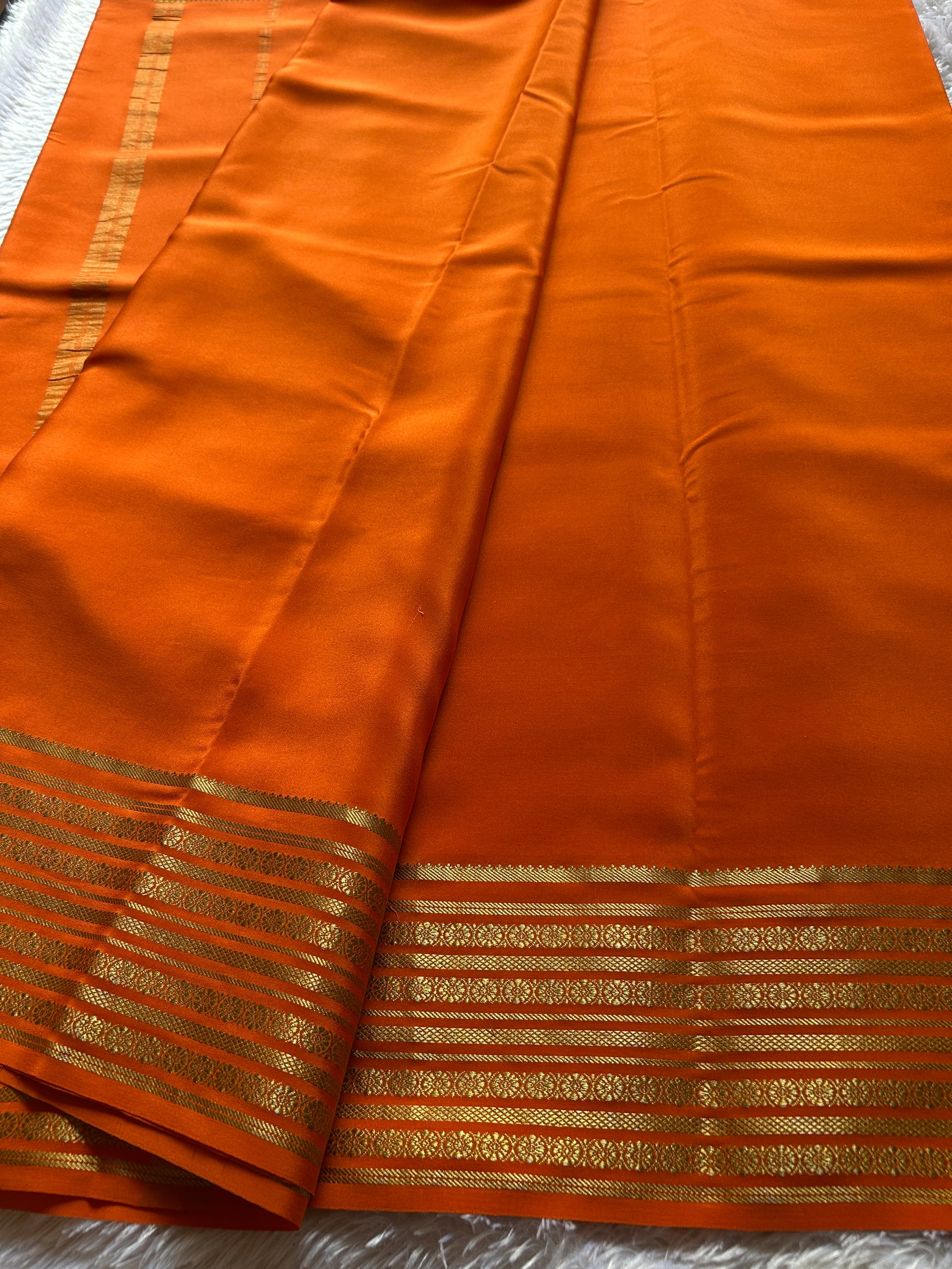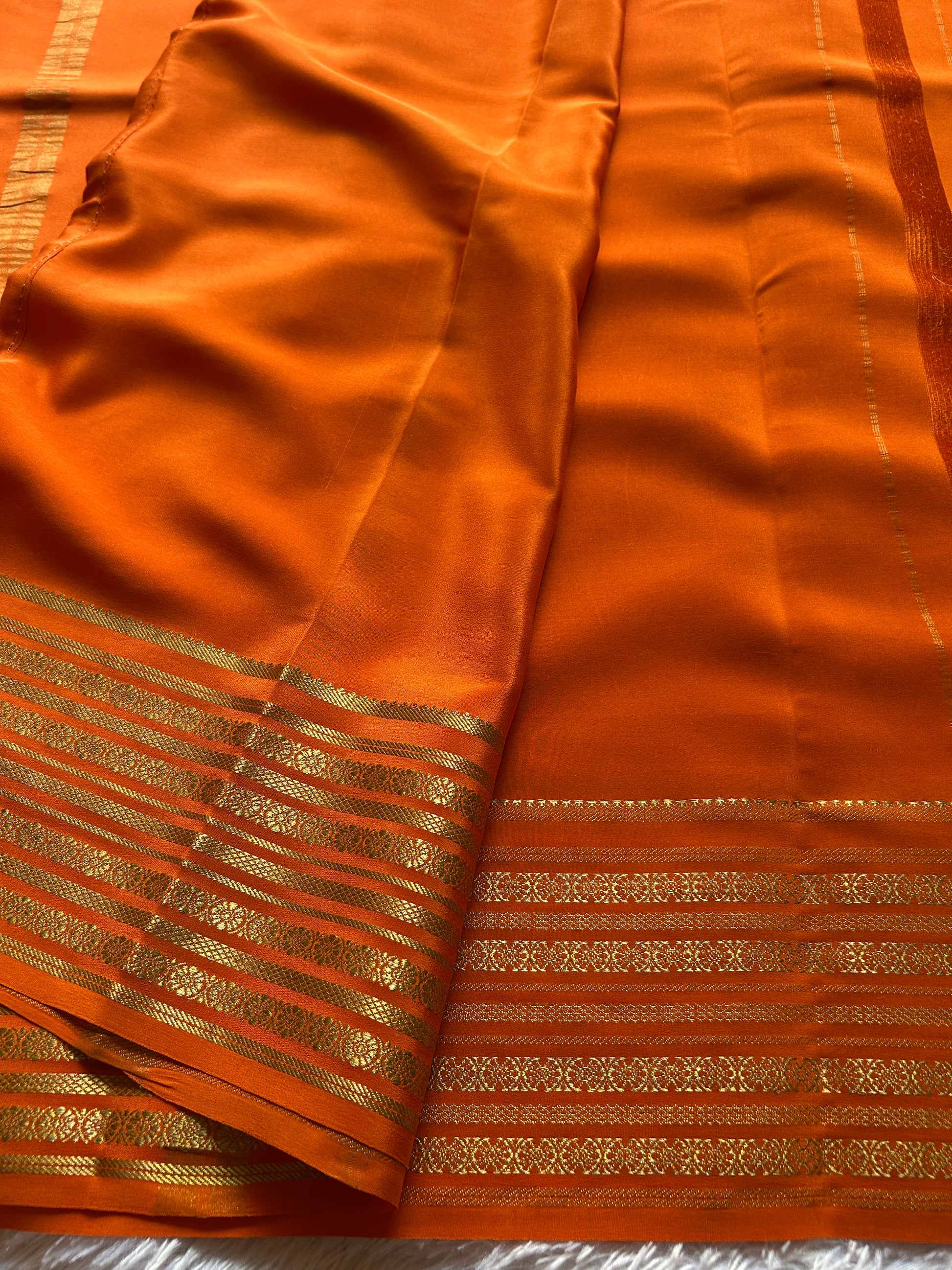 Elevate your collection with Parimala, a stunning solid orange Mysore crepe silk saree that embodies timeless elegance. Crafted from pure Mysore silk, this saree features a luxuriously soft drape and subtle sheen characteristic of premium crepe weaves. The border showcases intricate CSS (Copper Silver Silk) zari floral lines, adding sophisticated detailing that complements the vibrant orange base without overwhelming it. The refined craftsmanship and restrained ornamentation make this saree versatile for both festive occasions and refined everyday wear. Perfect for those who appreciate understated luxury and quality textiles.