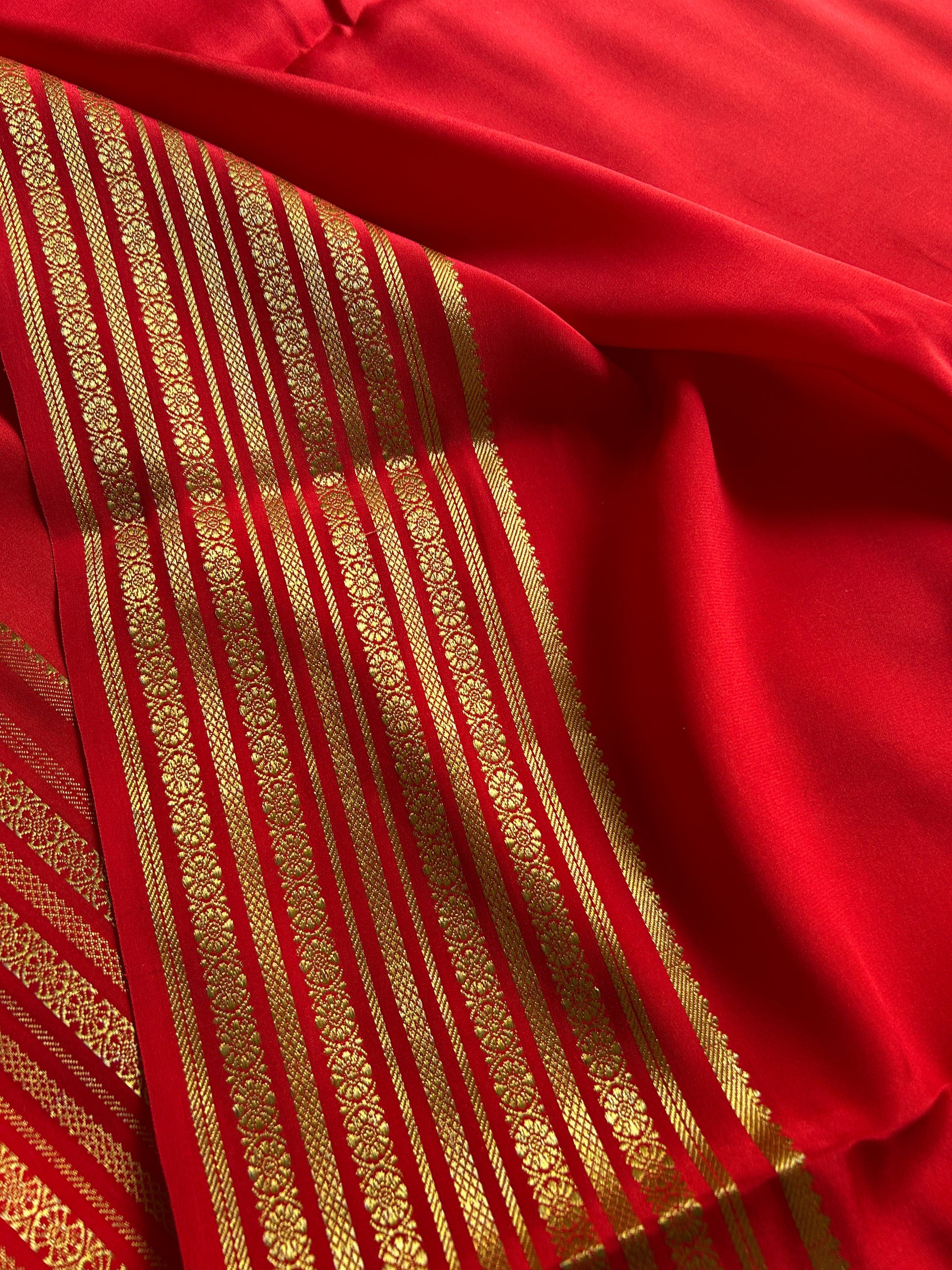 Elevate your ethnic wardrobe with Parimala, a stunning red Mysore crepe silk saree that embodies timeless elegance. Crafted from pure Mysore silk, this saree features a luxurious crepe texture that drapes beautifully while maintaining its shape. The sophisticated border showcases intricate CSS (Copper Silver Silk) zari floral lines, adding a refined touch of traditional craftsmanship. The solid red base provides versatility for both festive occasions and formal gatherings, while the ornate border detailing ensures you stand out with understated luxury. Perfect for those who appreciate authentic silk sarees with meticulous artisanal work.