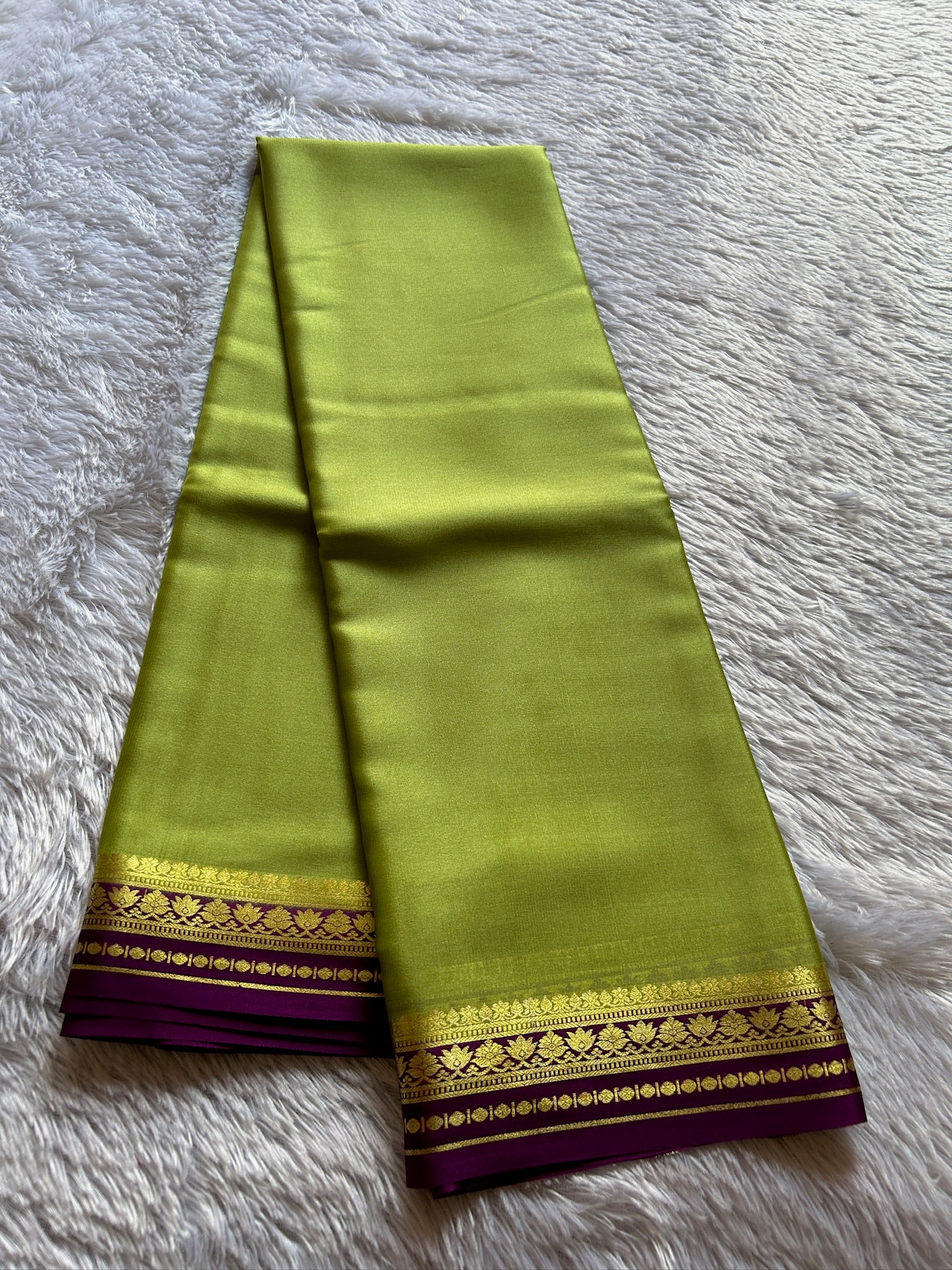 Expertly crafted in pure crepe silk, this stunning saree features a delicate pastel green hue and a vibrant magenta border. Perfect for any occasion, this saree exudes elegance and sophistication. Elevate your wardrobe with this timeless piece.