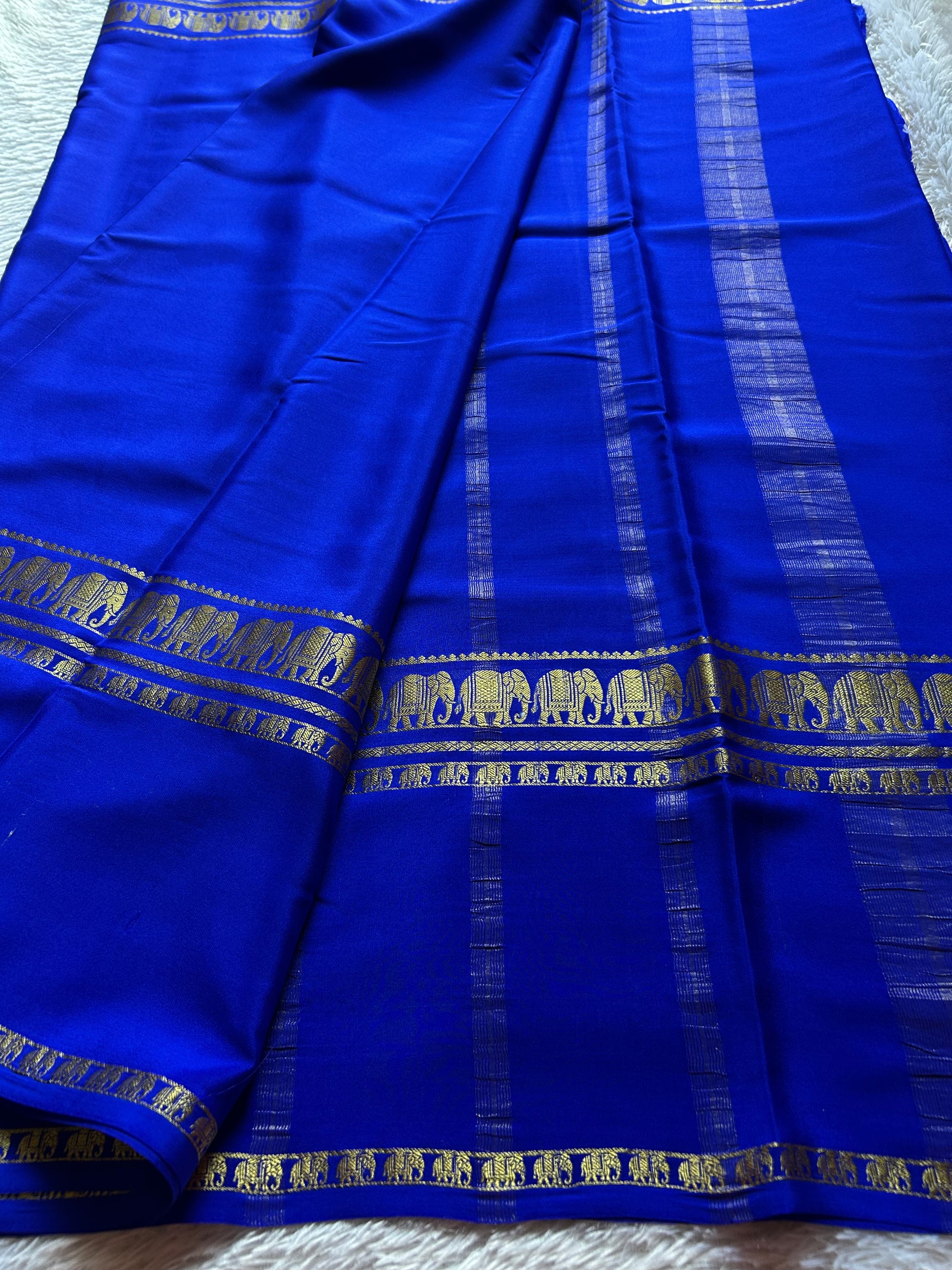 Elevate your collection with this exquisite royal blue Mysore crepe silk saree, a masterpiece of traditional craftsmanship. The luxuriously soft pure silk drapes with an elegant fluidity, while the striking big gap border commands attention with intricately woven zari elephant motifs. Each elephant is meticulously detailed, symbolizing grace and prosperity in classic saree aesthetics. The solid royal blue base provides a sophisticated canvas that complements the ornate border work, making this piece versatile for both festive occasions and formal celebrations. Perfect for those who appreciate refined elegance and authentic silk sarees.
