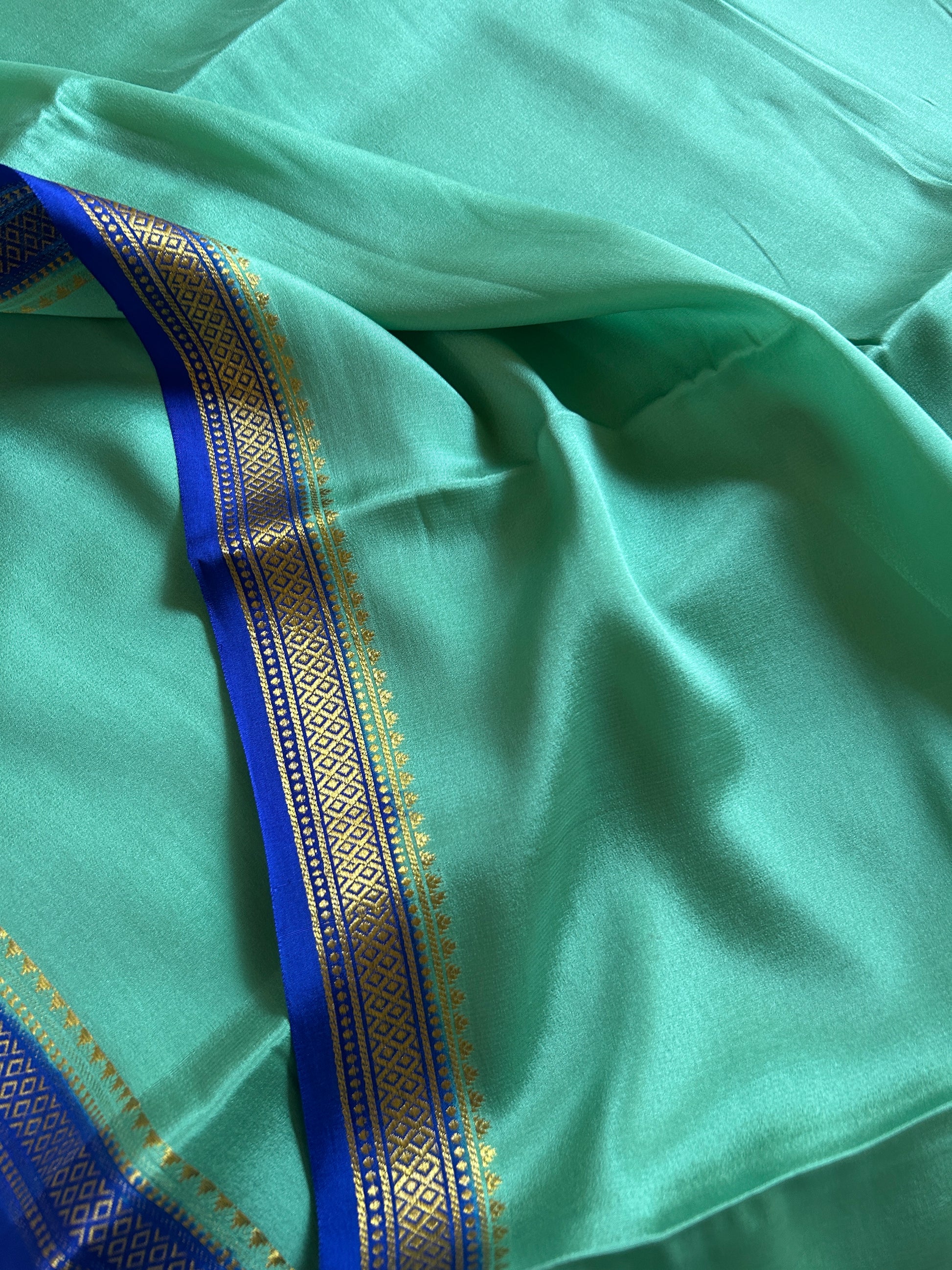 Elevate your ethnic wardrobe with this exquisite Mysore crepe silk saree in refreshing mint green. The lustrous pure silk fabric drapes beautifully, offering both comfort and sophistication for any occasion. A striking royal blue border adorned with intricate zari work adds regal elegance and visual depth. The fine craftsmanship and premium silk quality ensure this piece becomes a timeless addition to your collection, perfect for celebrations, festivals, or formal gatherings.