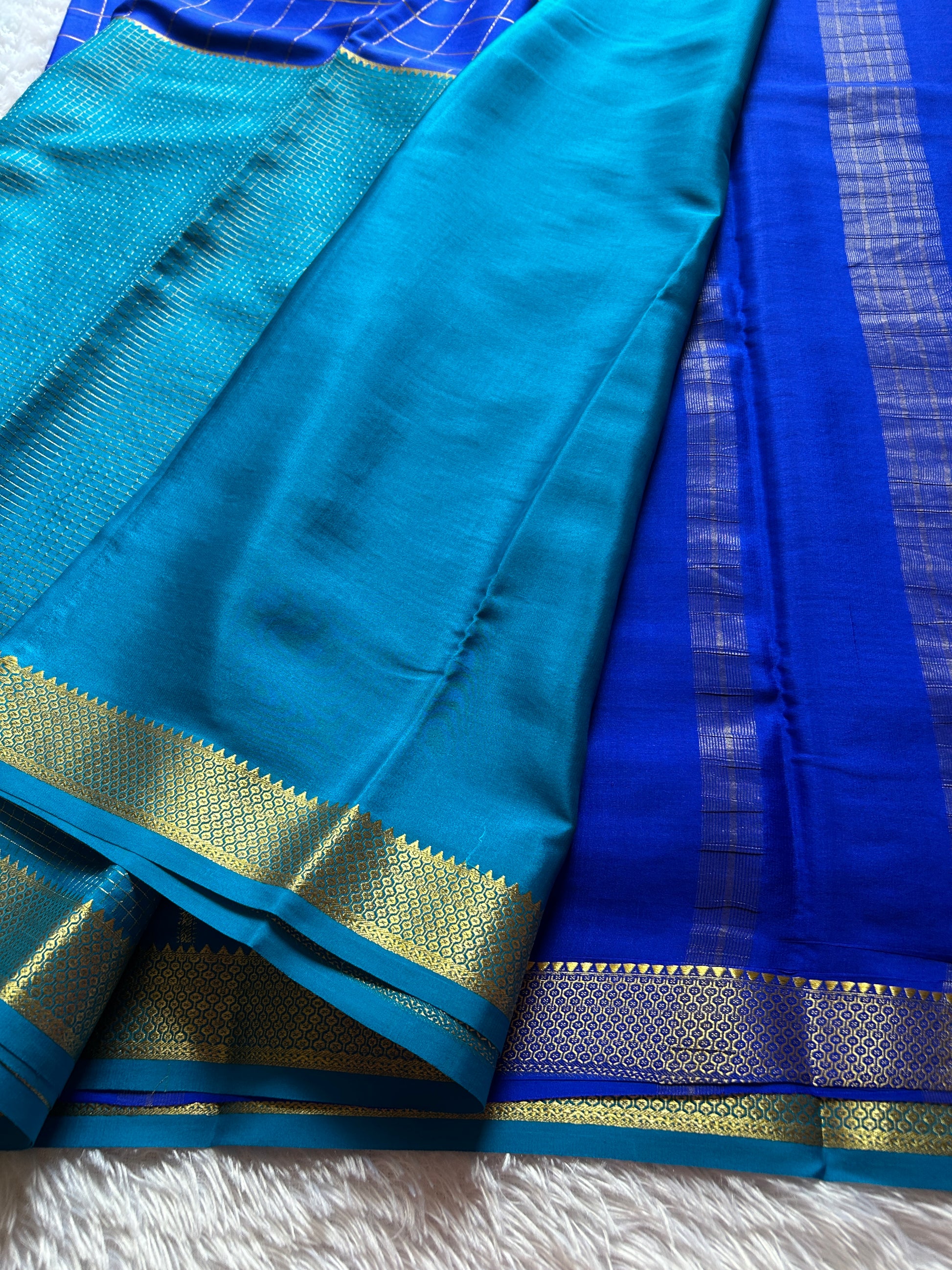 This Mysore crepe silk saree showcases a double pallu concept, offering two elegant looks in one. Its half-and-half design in sea blue and royal blue features smaller zari checks in royal blue paired with larger checks in sea blue, creating a balanced and sophisticated pattern. The intricately zari-adorned border adds a touch of refinement, making it perfect for formal occasions and traditional celebrations. Expertly crafted, this saree blends timeless artistry with a subtle color palette for a distinguished and graceful appearance.