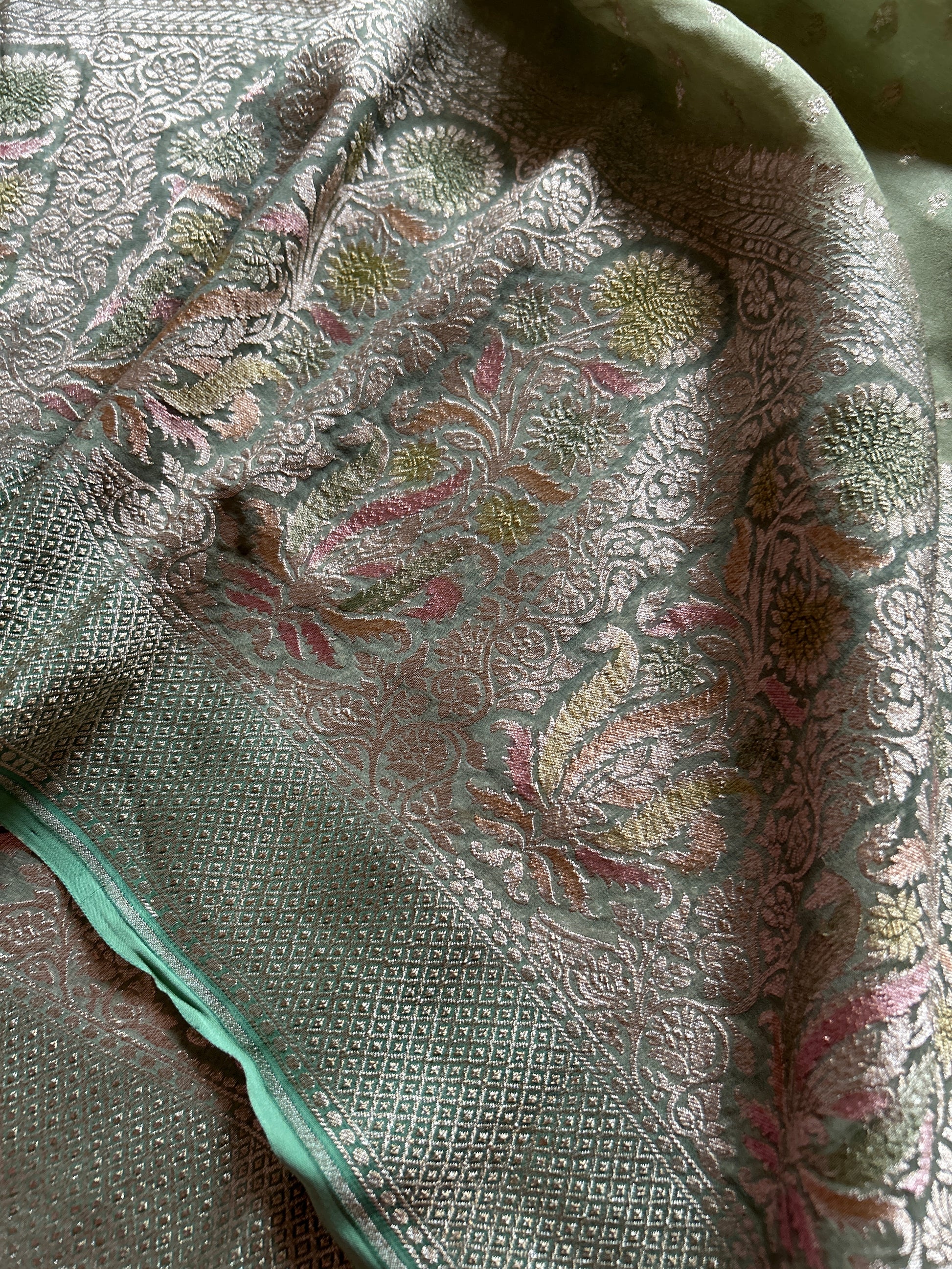 Elevate your ethnic wardrobe with this exquisite sage green pure chiffon kaddi georgette saree, a masterpiece of traditional craftsmanship. The fabric drapes beautifully with its lightweight, fluid texture, while delicate meenakari work adorns the entire piece with intricate detailing. Small buttas scattered across the body create visual rhythm and depth. The mint green border and pallu showcase elaborate meenakari embellishment, adding a sophisticated contrast that enhances the overall aesthetic. Perfect for festive occasions, weddings, and celebrations, this saree combines timeless elegance with refined artisanal work, making it an investment piece for the discerning wearer.