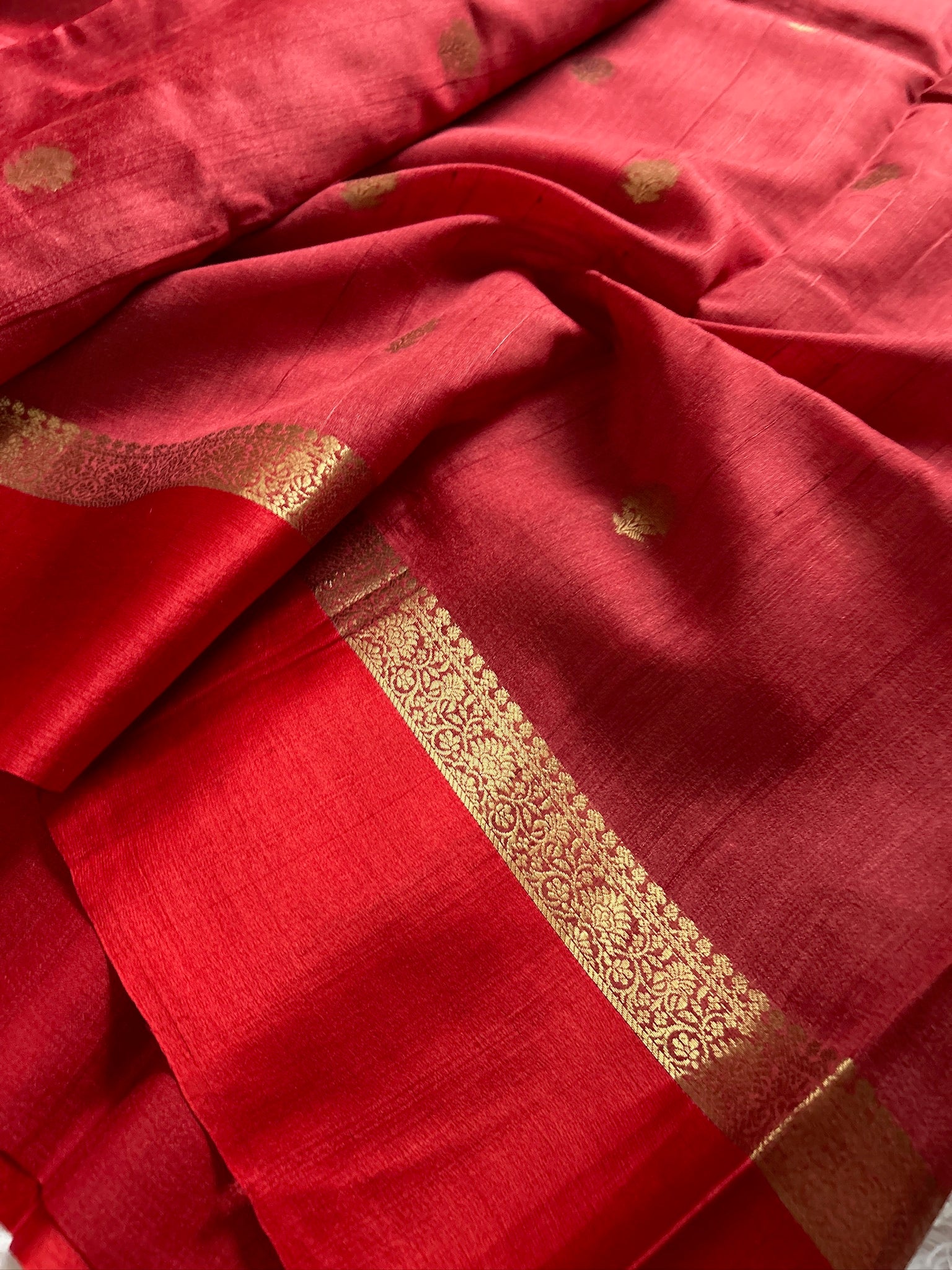 Elevate your wardrobe with this exquisite pure raw tussar georgette saree in a sophisticated brick red hue. The fabric showcases delicate zari buttas scattered throughout, adding subtle sparkle and dimension to the weave. Complemented by a striking red satin border adorned with intricate zari embellishments on the inner edge, this piece seamlessly blends traditional craftsmanship with refined elegance. The raw tussar texture provides a luxurious drape while maintaining breathability, making it ideal for both festive occasions and everyday sophistication. A timeless investment for the discerning saree connoisseur.
