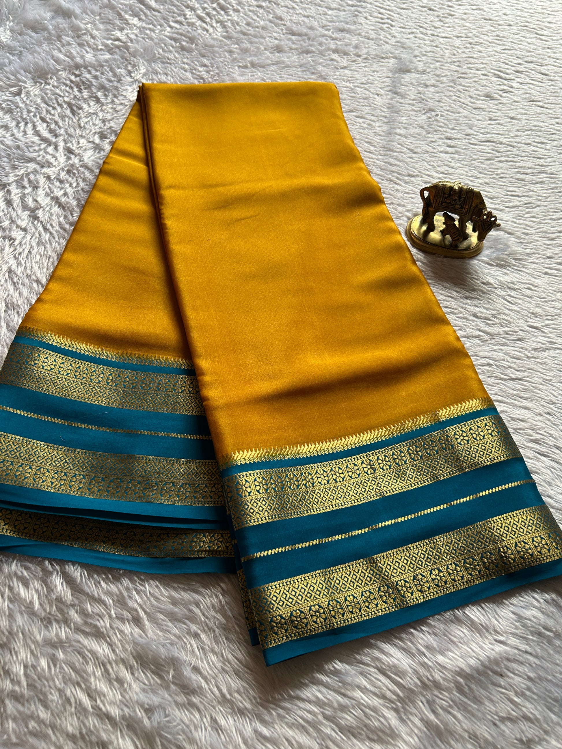 Elegant mustard Mysore silk saree featuring a traditional teal gap border with intricate zari work. This pure silk creation combines timeless craftsmanship with a sophisticated color palette, perfect for special occasions while remaining comfortable for all-day wear.
