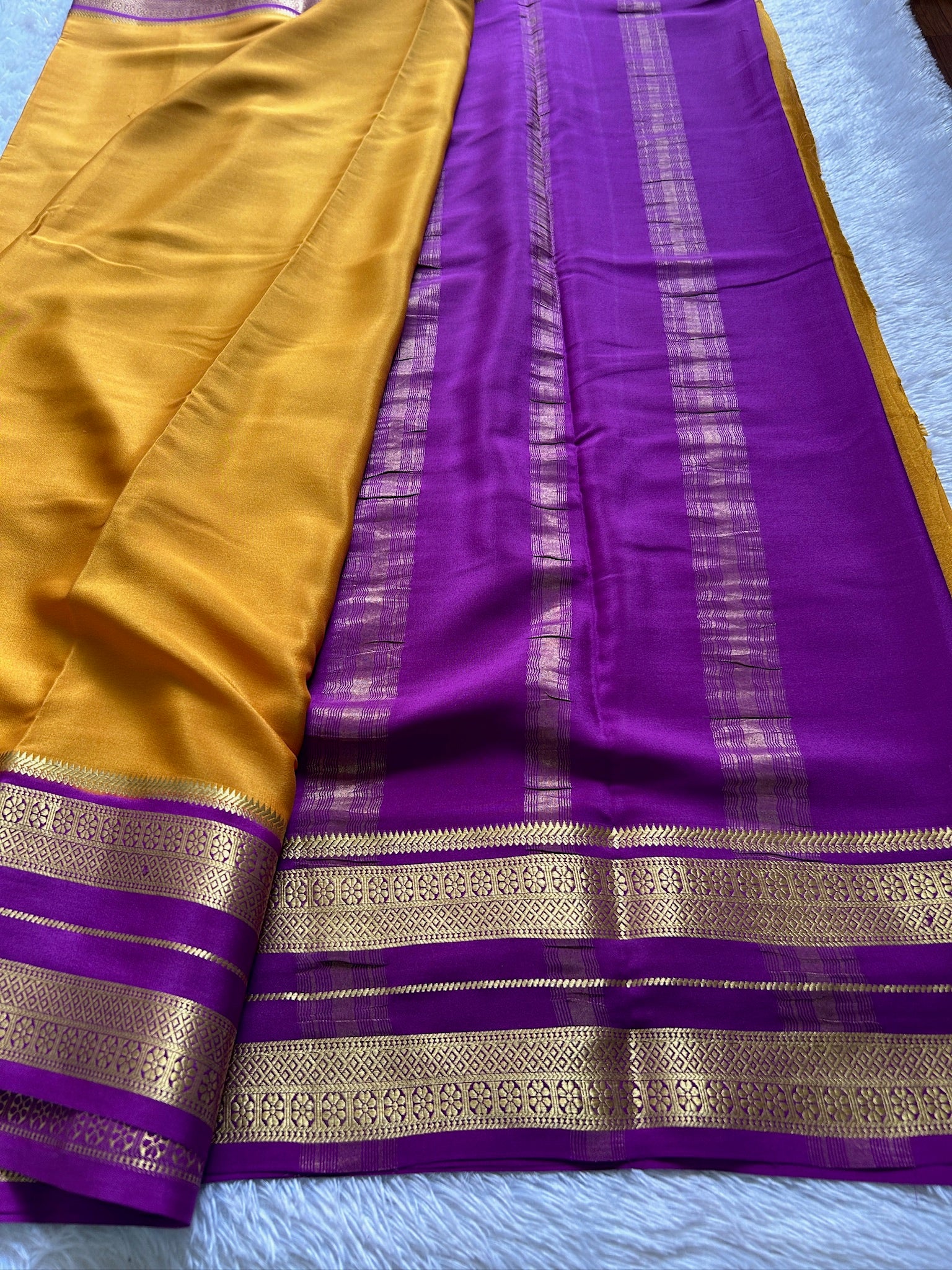 Luxurious pure Mysore silk saree in rich mustard with traditional magenta border. Features elegant zari work detailing that highlights the classic craftsmanship. Perfect for special occasions while maintaining timeless appeal and comfort.