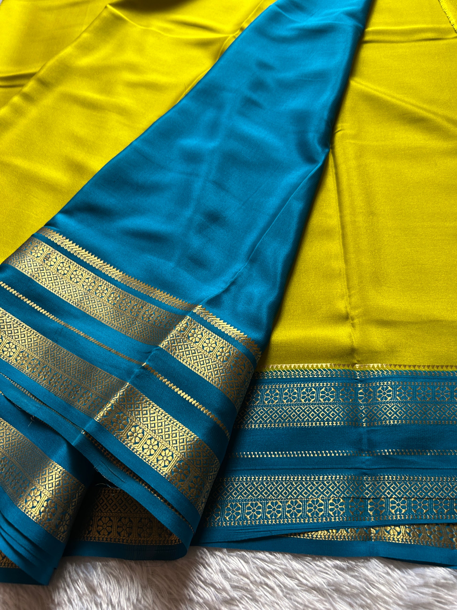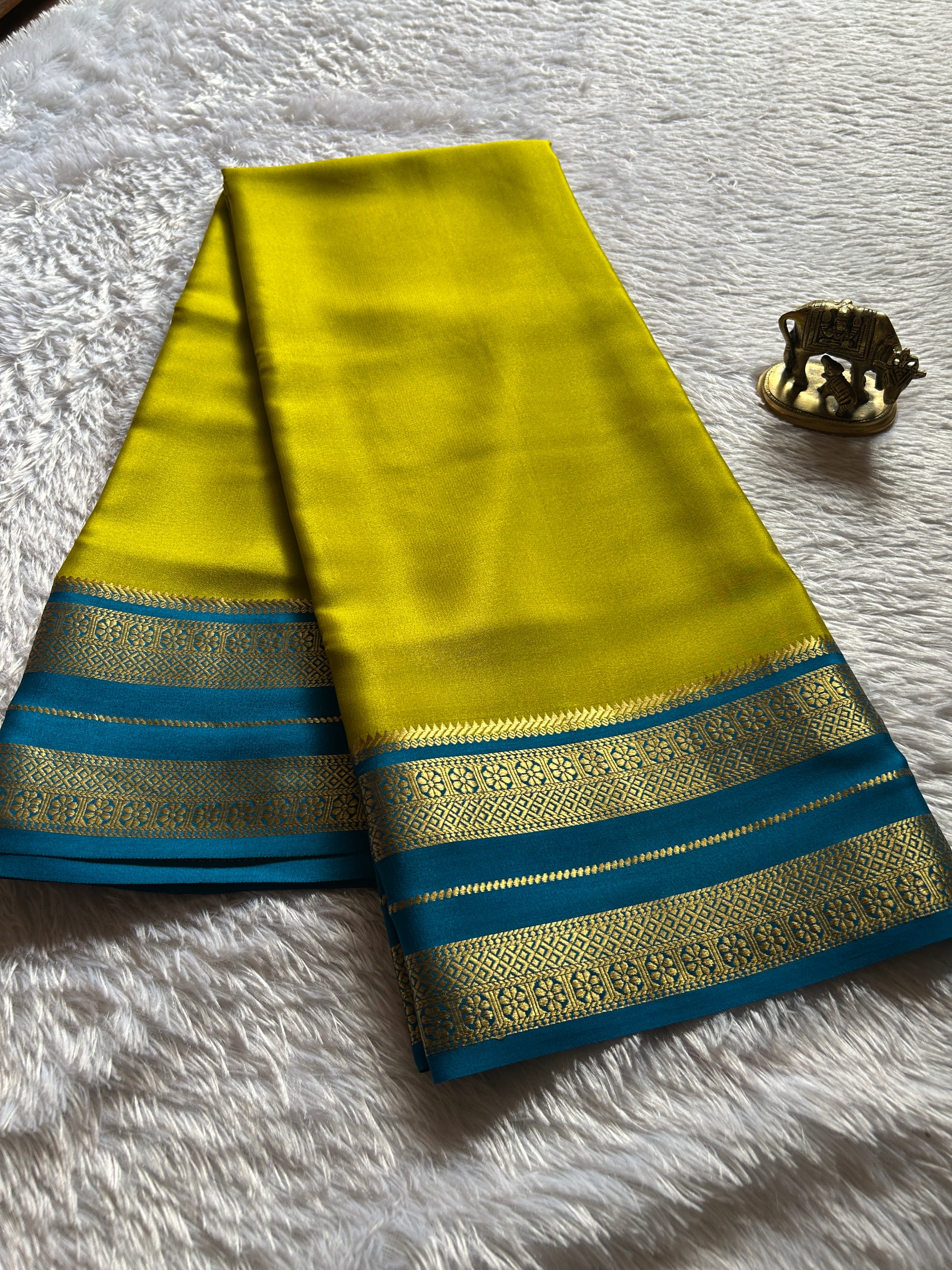 Elegant lime green-colored pure Mysore silk saree featuring a traditional teal gap border. Adorned with exquisite zari work that highlights the craftsmanship of this timeless piece. Perfect for special occasions while maintaining the authentic charm of classic Indian heritage.