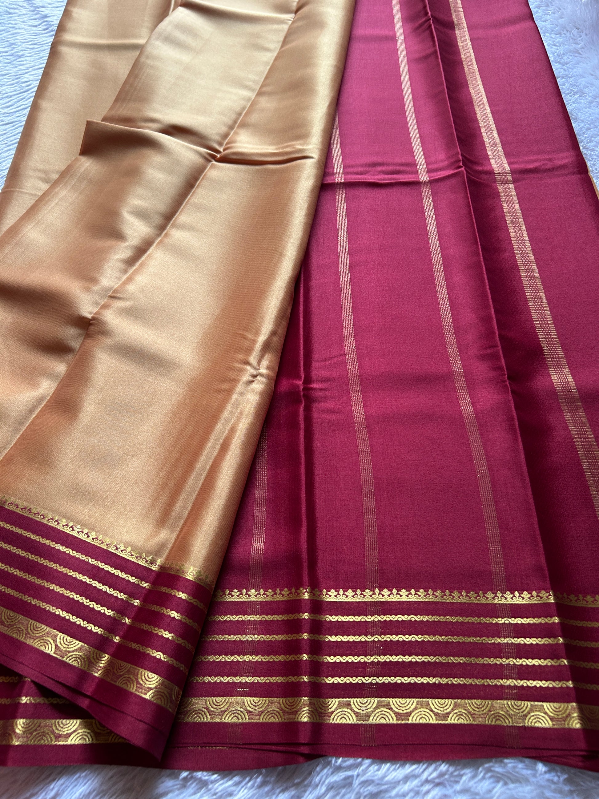 Discover timeless elegance with this exquisite Mysore crepe silk saree, crafted from pure silk at a delicate 60 GSM for effortless draping and comfort. The soft beige base provides a versatile canvas, beautifully complemented by a rich maroon border adorned with classic zari work that adds traditional sophistication. This lightweight weave makes it ideal for all-day wear while maintaining the luxurious feel of authentic silk. Perfect for both formal occasions and refined everyday styling, this saree exemplifies the finest in traditional Indian craftsmanship.