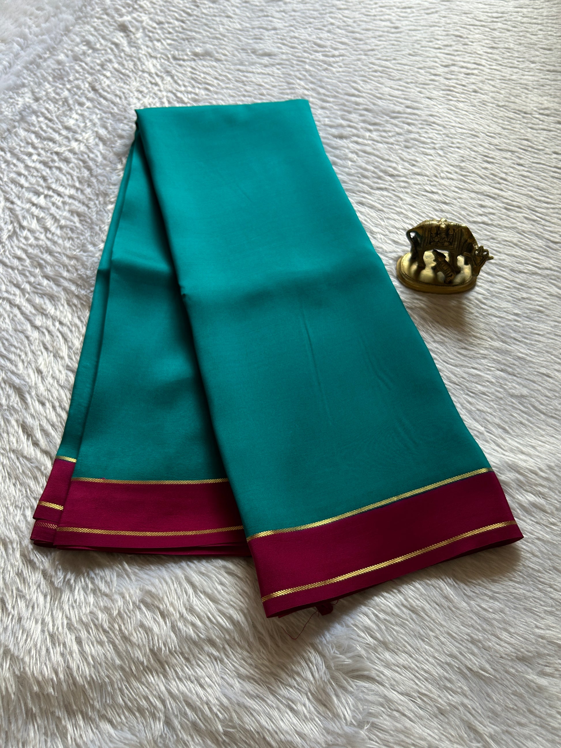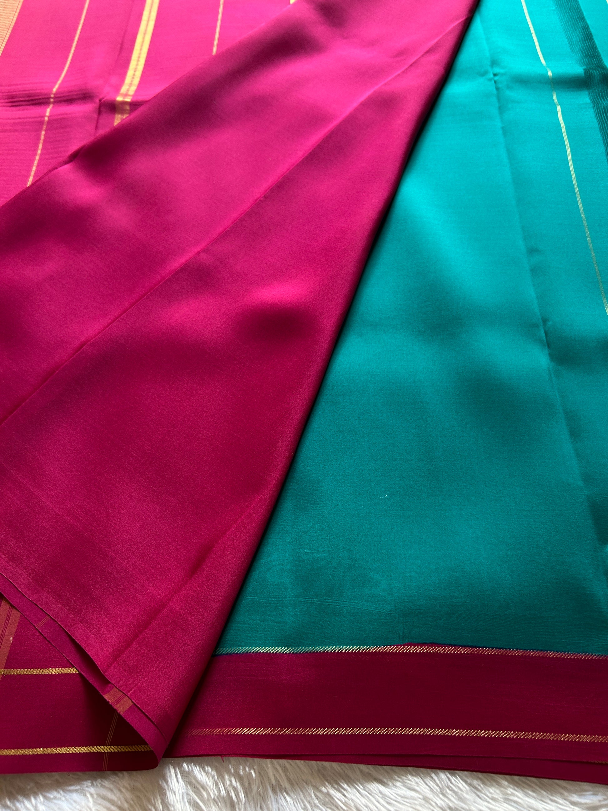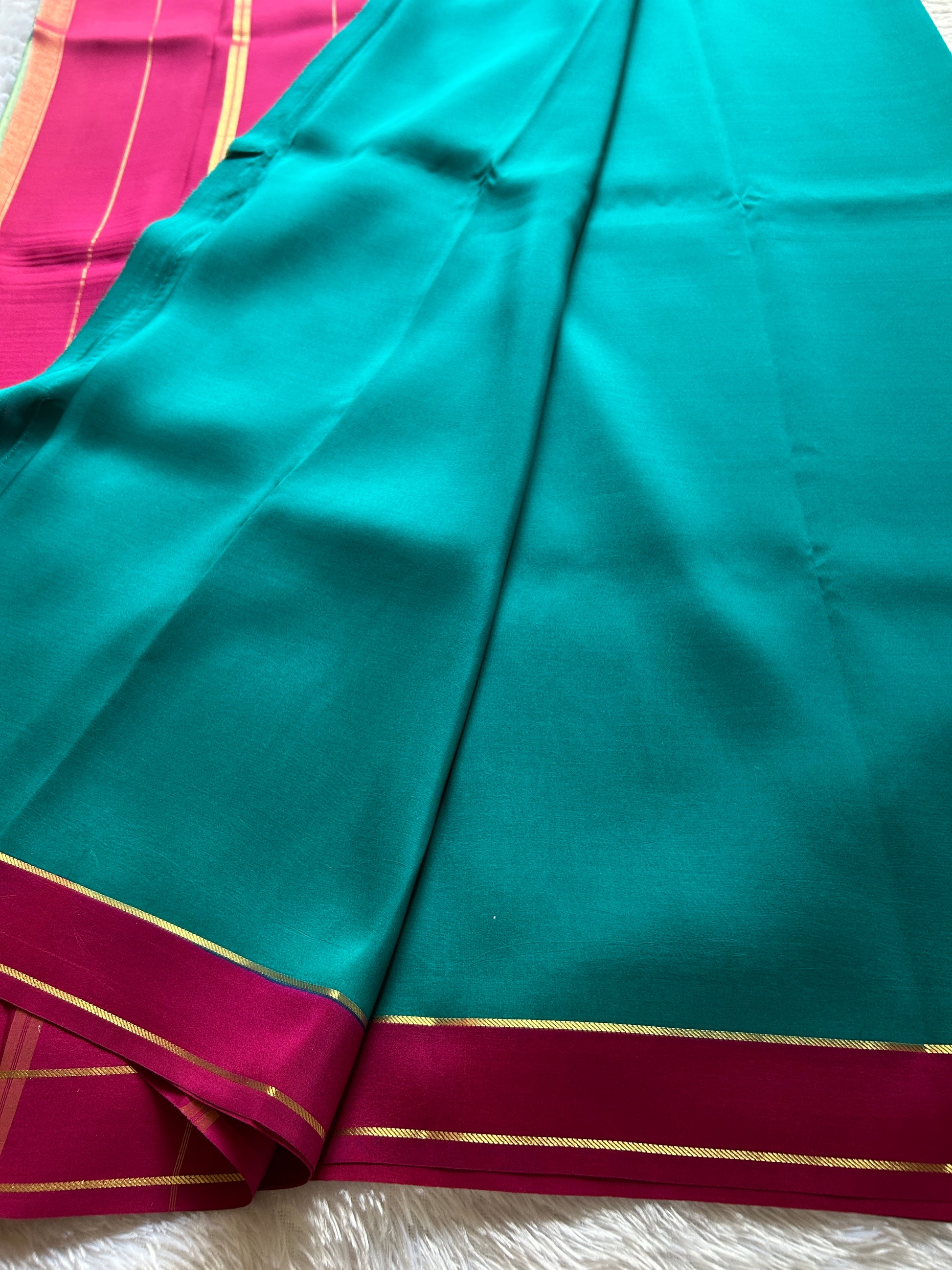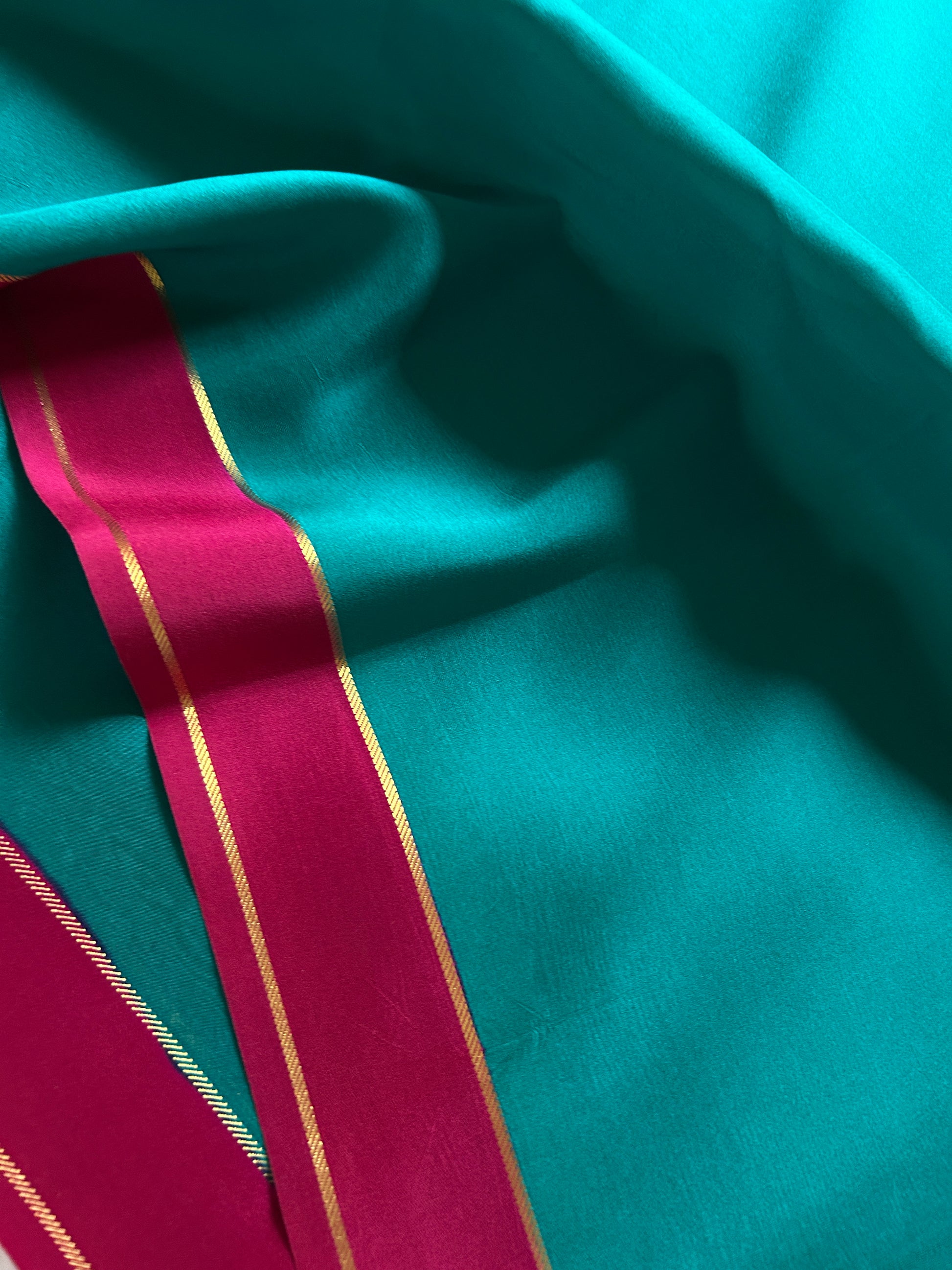 Elevate your ethnic wardrobe with this exquisite ananda blue pure Binny crepe silk saree, a masterpiece of traditional craftsmanship. The luxurious crepe silk fabric drapes beautifully, offering both comfort and sophistication for any occasion. The pink pallu features intricate gold zari work that catches light elegantly, while the matching gap border adds a refined finishing touch. This saree seamlessly blends timeless design with premium quality, making it an ideal choice for celebrations, festivals, or formal gatherings. Perfect for the discerning wearer who appreciates authentic handcrafted details and superior fabric quality.