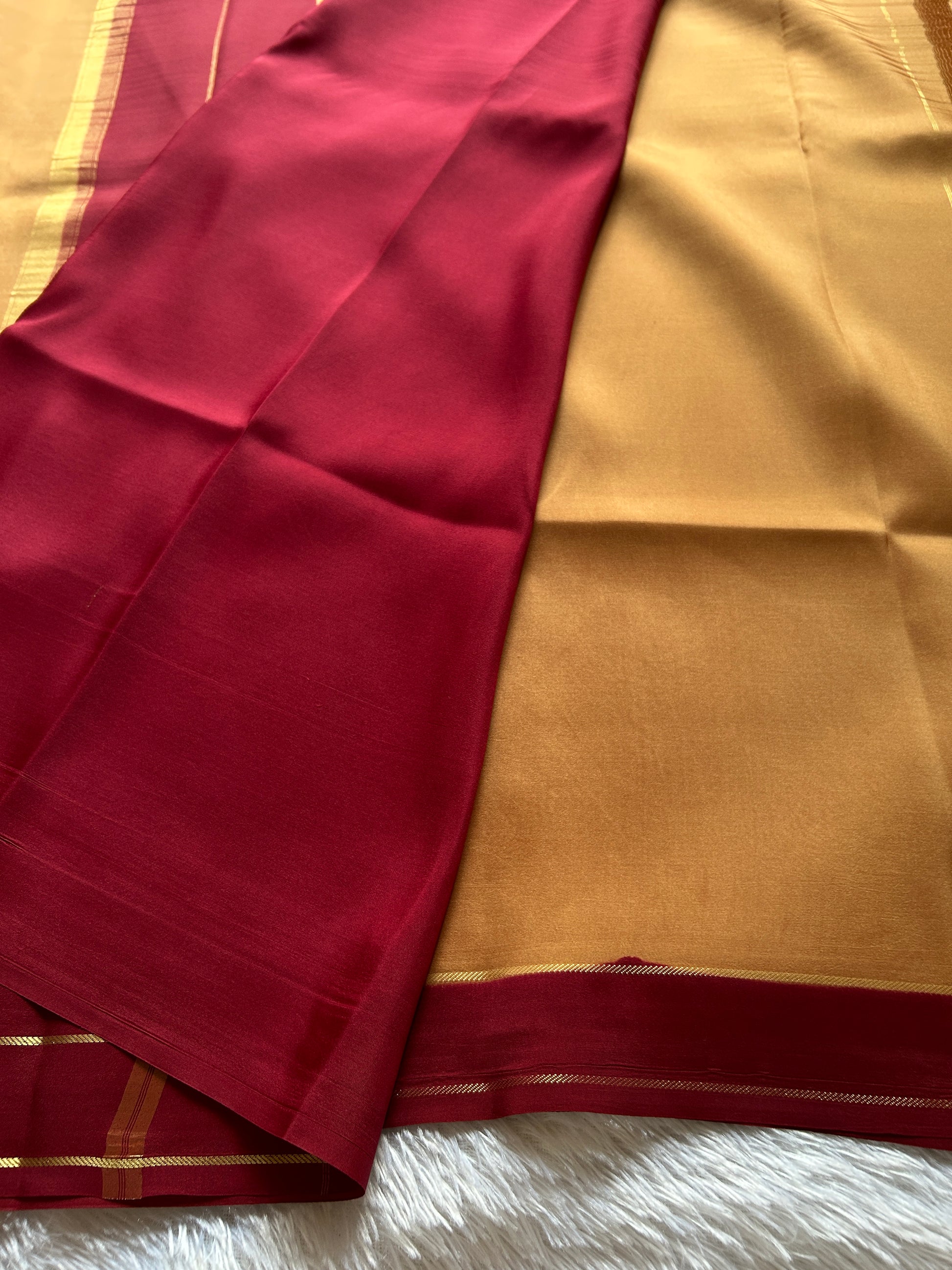 Elevate your ethnic wardrobe with this sophisticated beige pure Binny crepe silk saree, a masterpiece of refined craftsmanship. The luxurious crepe silk drapes beautifully, offering both comfort and elegance for any occasion. The maroon pallu and gap border are adorned with intricate gold zari work, creating a striking contrast that draws the eye and adds a touch of opulence. The interplay of warm beige with deep maroon tones makes this saree versatile enough for festive celebrations, weddings, or formal gatherings. Perfect for those who appreciate timeless design paired with premium fabric quality.