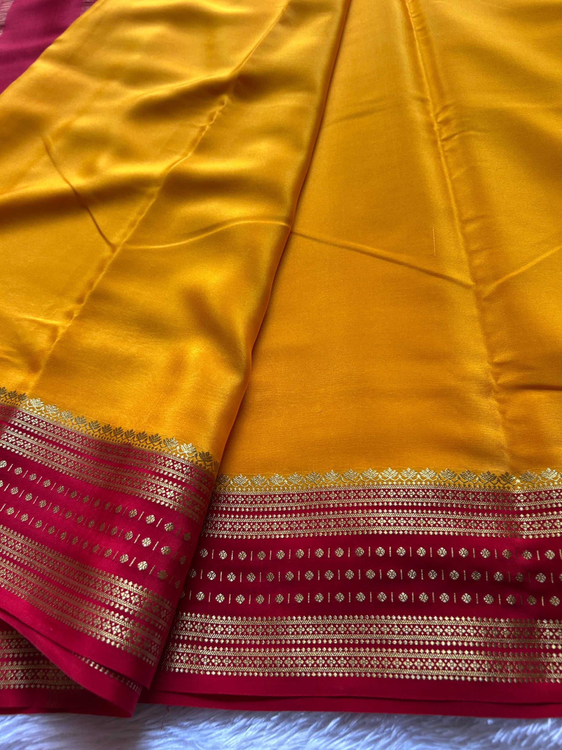 Rohini (2D) showcases the timeless elegance of pure Mysore crepe silk in a luminous golden yellow, complemented by a striking red border. Crafted at 100 GSM, this saree offers the perfect balance of drape and structure that discerning wearers appreciate. The border features an intricate design of CSS (copper silver silk) zari dots interspersed between traditional zari lines, creating a sophisticated interplay of metallic tones. The refined weave and thoughtful embellishment make this piece ideal for both festive occasions and formal gatherings, delivering the authentic luxury that Mysore silk is renowned for.