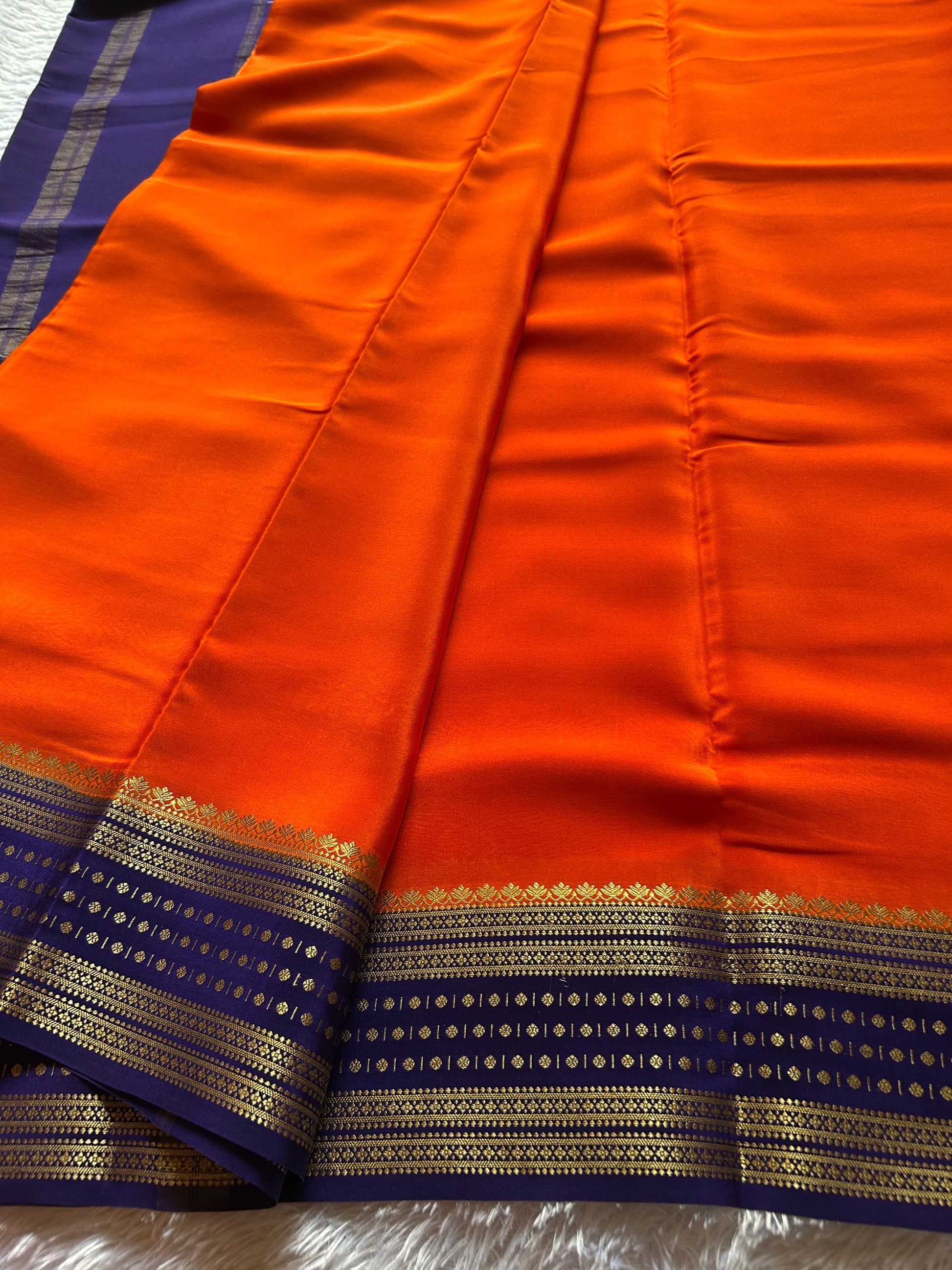 Rohini showcases the timeless elegance of pure Mysore crepe silk in a vibrant orange hue, complemented by a striking navy blue border. Crafted at 100 GSM, this saree offers the perfect balance of drape and structure. The border features an intricate zari design embellished with copper-silver silk (CSS) dots interspersed between traditional zari lines, creating a sophisticated geometric pattern. The lightweight crepe texture ensures comfortable wear throughout the day, while the luxurious silk composition provides a refined sheen. Ideal for both festive occasions and formal gatherings, this saree exemplifies classic South Indian weaving craftsmanship with contemporary design sensibilities.