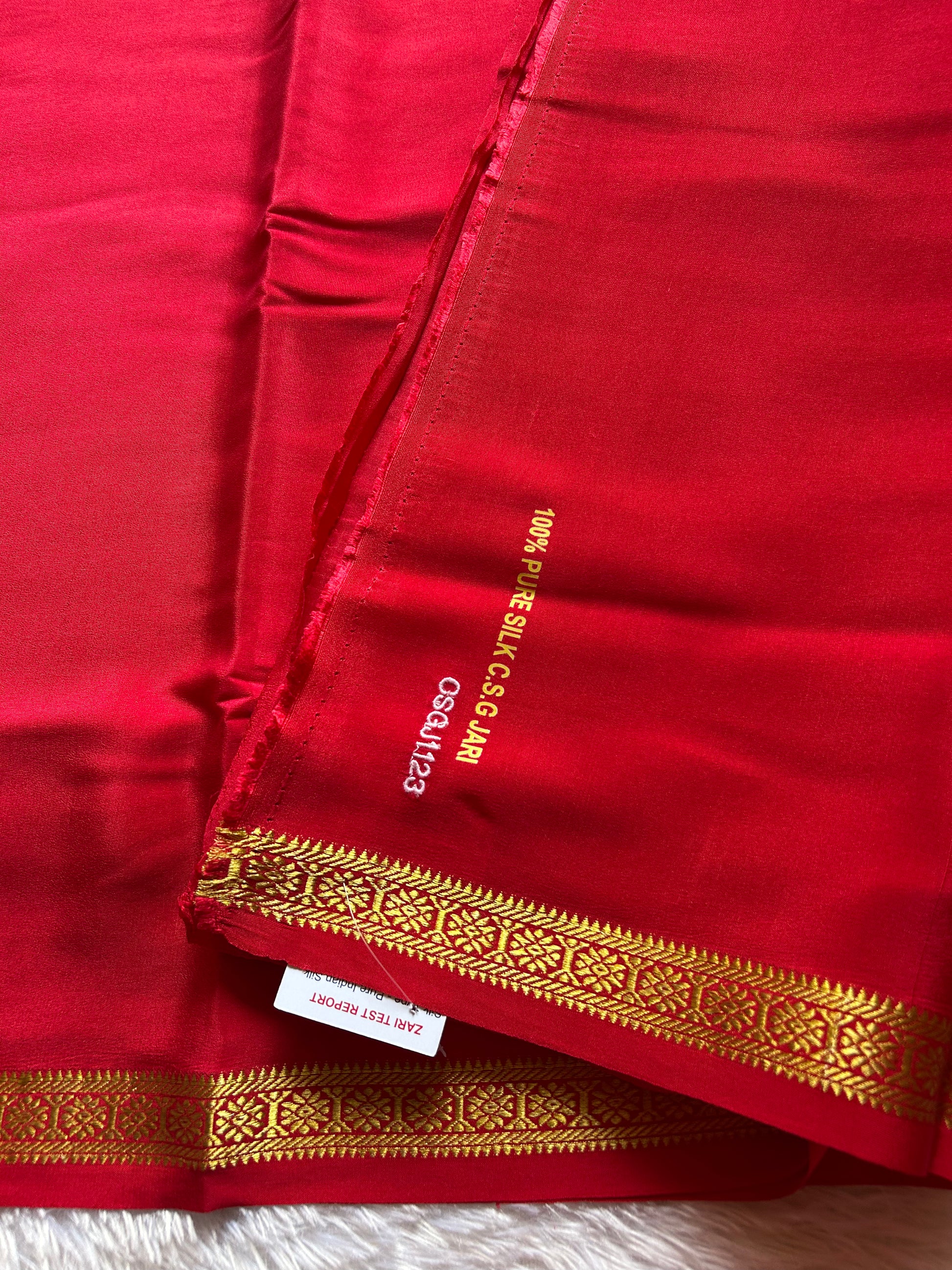 Elevate your collection with this striking red Mysore crepe silk saree, crafted with pure CSG (Copper Silver Gold) zari that catches light beautifully. The fabric drapes with natural elegance, while the border showcases an intricate rudrakshi motif rendered in lustrous CSG zari work. This sophisticated piece balances timeless tradition with refined craftsmanship, making it ideal for festive occasions and celebrations. The rich red hue paired with the ornate border detailing creates a commanding presence, while the crepe silk ensures comfortable wear throughout the day.