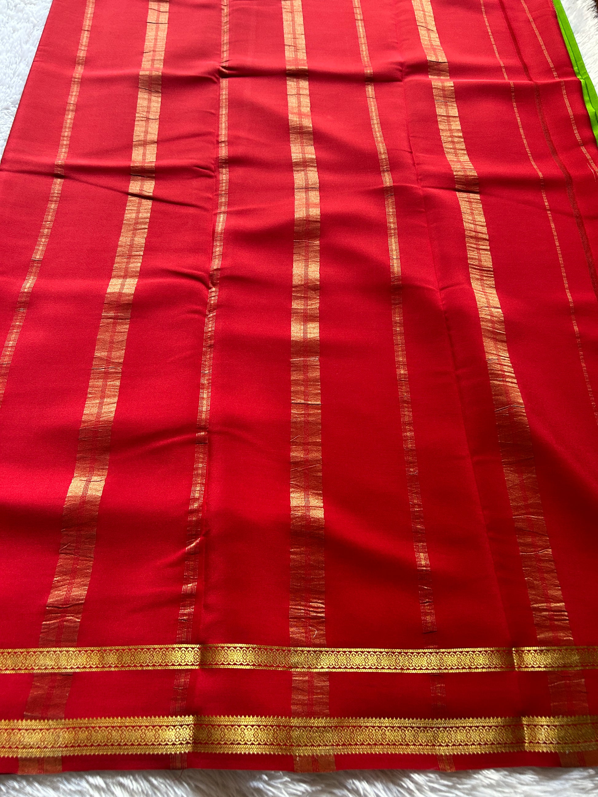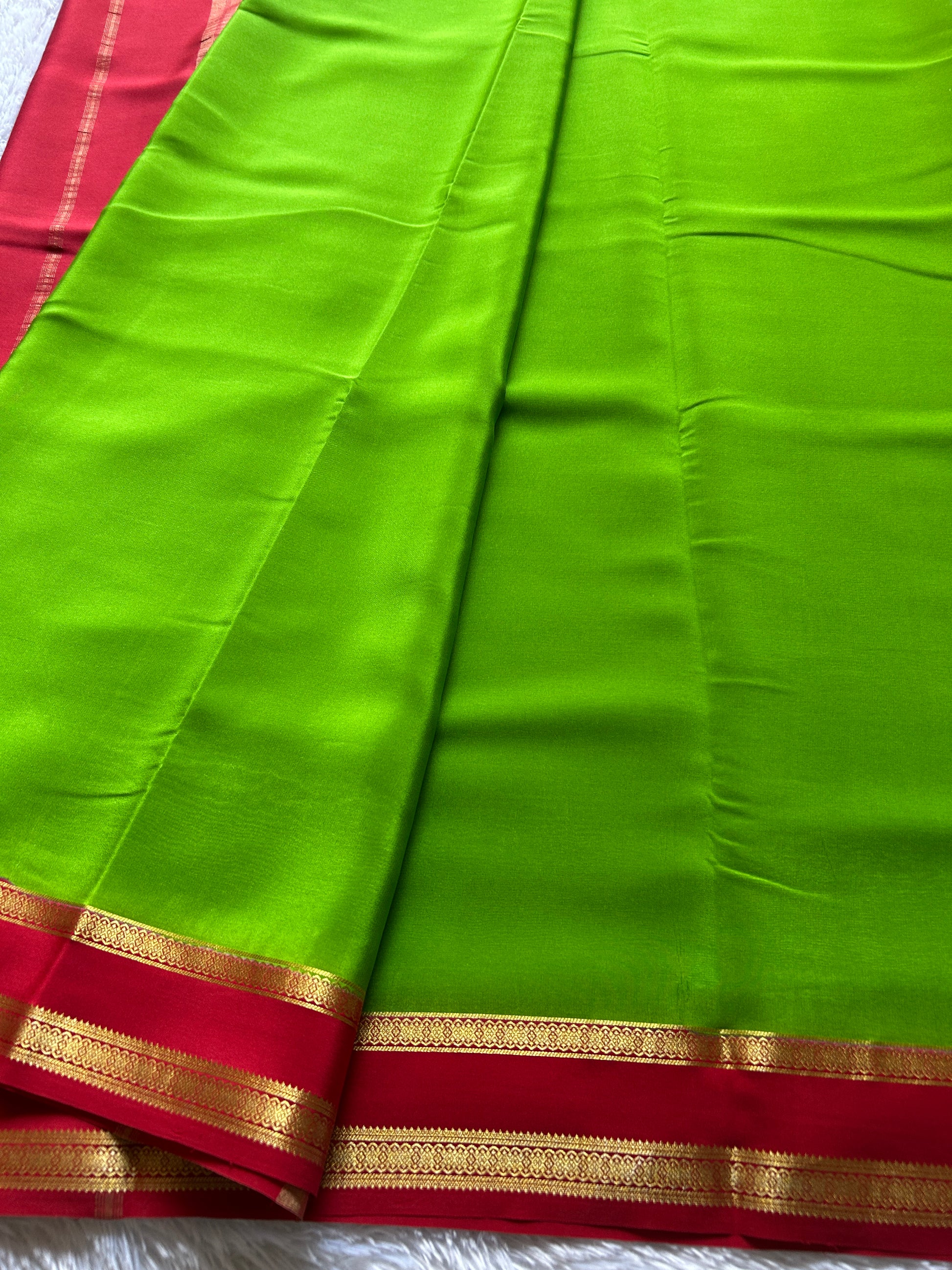 This Mysore crepe silk saree presents a masterful blend of color and craftsmanship. Woven in pure Copper Silver Silk with a luxurious crepe texture, the parrot green body provides a rich canvas for the intricate CSS zari embellishment. The defining red gap border showcases meticulous zari work that demonstrates traditional weaving excellence. The crepe silk fabric at 110 GSM offers a graceful drape with subtle movement, while the contrasting border creates visual depth. Ideal for discerning patrons seeking authentic handloom sarees with refined detailing and enduring quality for special occasions and celebrations.
