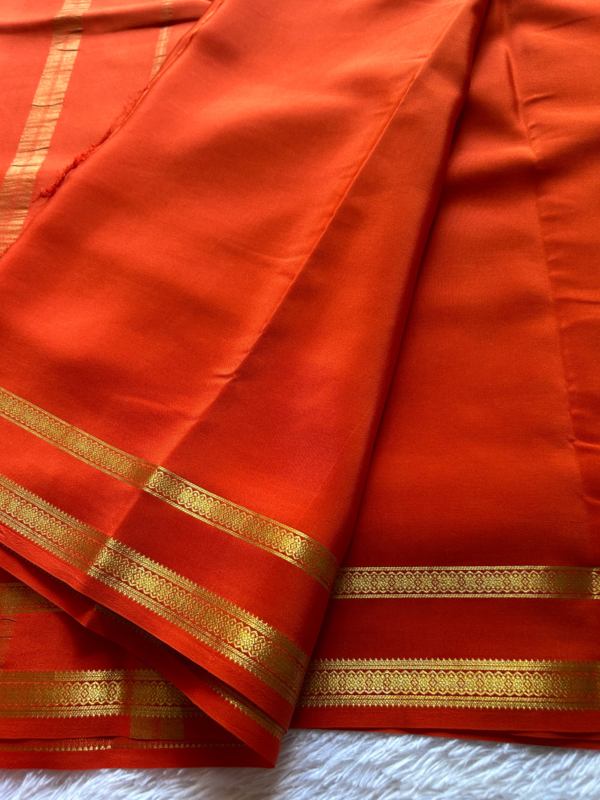 Elevate your collection with this striking orange Mysore crepe silk saree, crafted from premium 110 GSM fabric that drapes with refined elegance. The saree features an exquisite gap border and pallu adorned with intricate copper silver silk zari work, creating a sophisticated interplay of metallic tones against the vibrant orange base. The crepe texture adds subtle dimension and movement, while the CSS zari detailing brings timeless opulence to both traditional and contemporary styling. Perfect for festive occasions and celebrations, this piece combines the luxurious feel of pure silk with masterful artisanal craftsmanship.