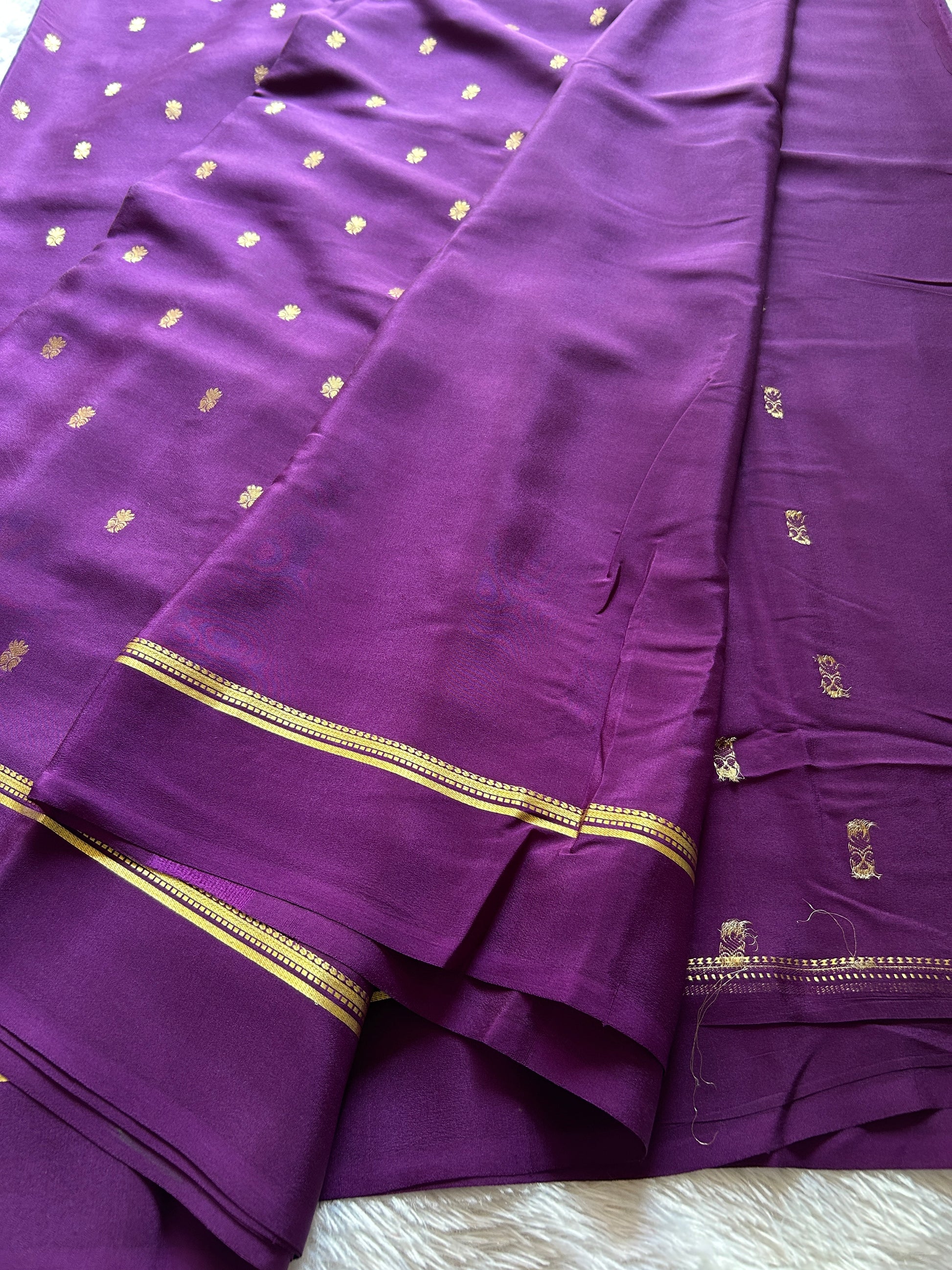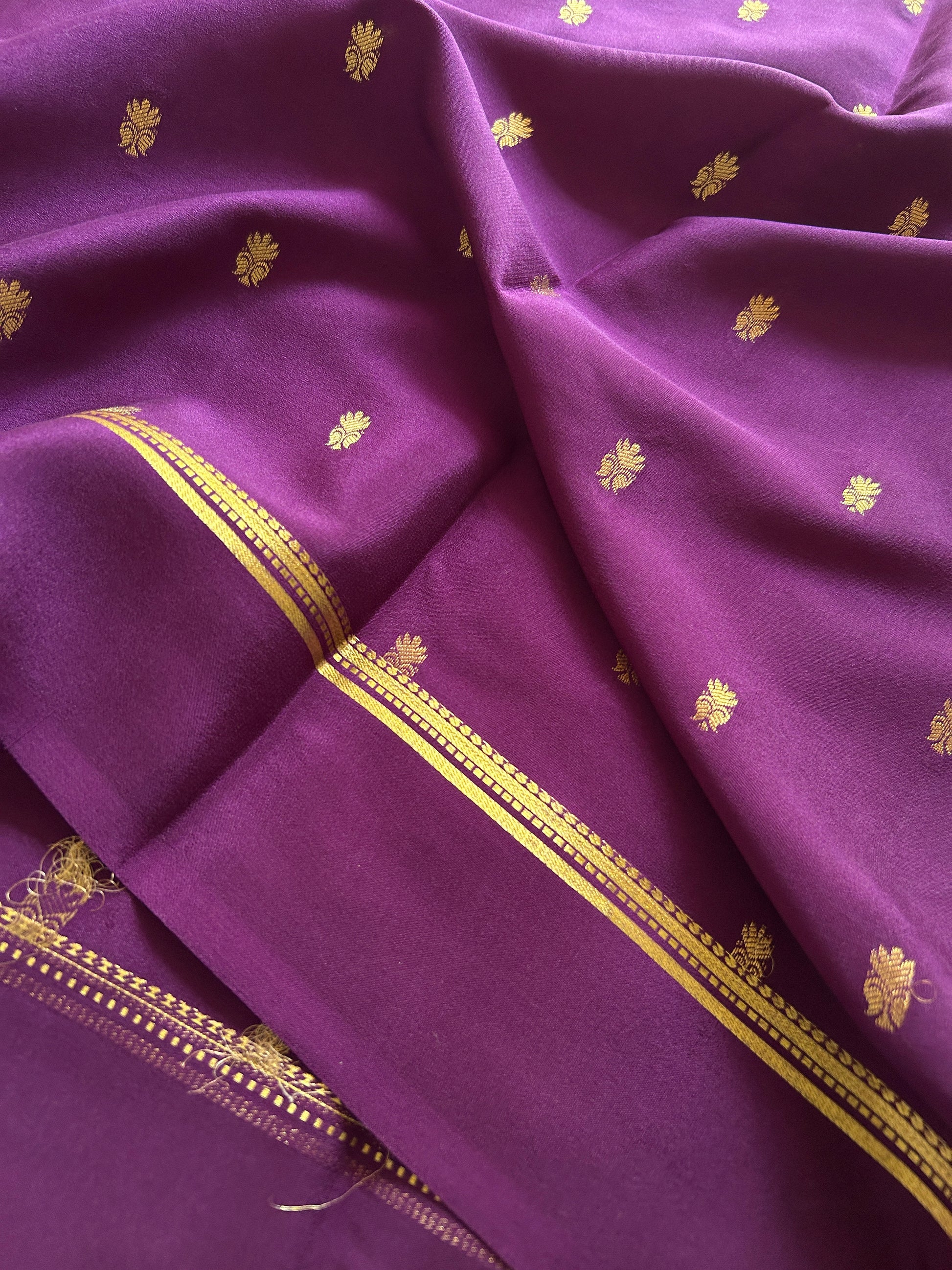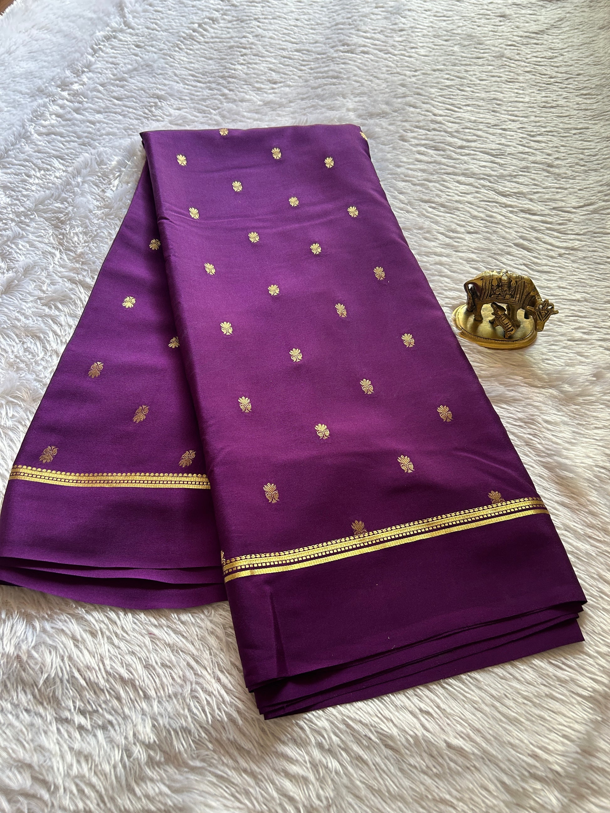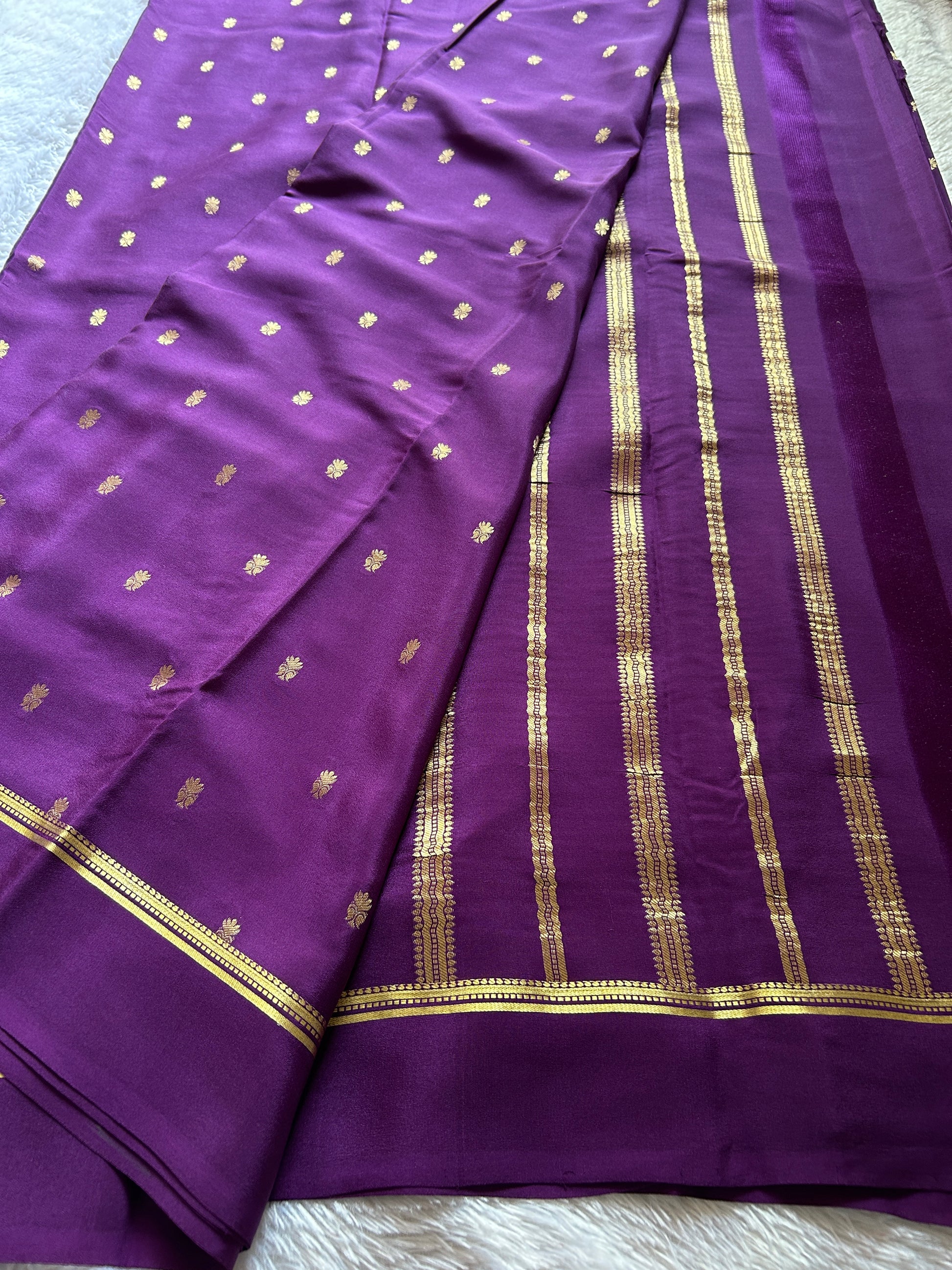 Indulge in the pure luxury of Sahana. Made with premium Mysore crepe silk, this saree in wine color features traditional buttas allover and a simple zari line border. Elevate your style with this exquisite and timeless piece.