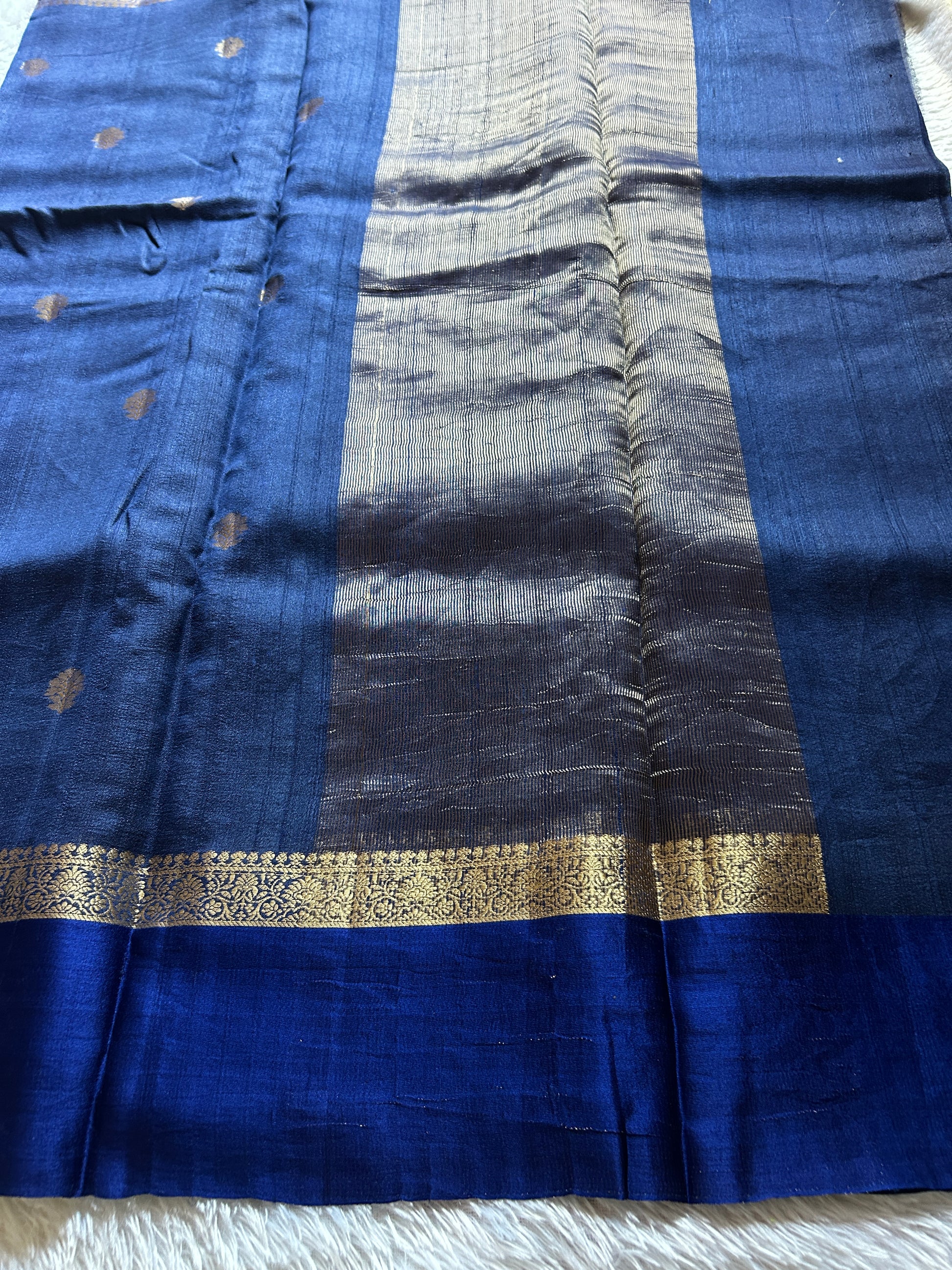 Immerse yourself in timeless elegance with this cobalt blue pure raw tussar georgette saree. The fabric's natural texture creates a sophisticated drape, while delicate zari buttas scattered across the expanse add refined ornamentation. The satin border elevates the design with intricate zariwork meticulously detailed along the inner edge, creating a striking frame for this classic piece. Perfect for those who appreciate understated luxury and traditional craftsmanship.