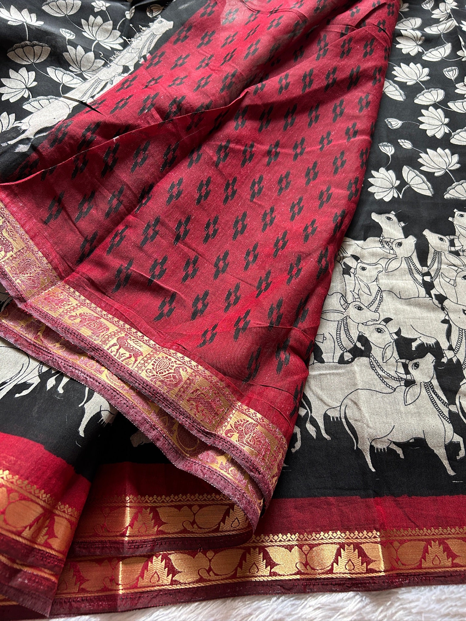 Experience refined textile artistry with this black soft cotton saree featuring comprehensive Pichwai print detailing throughout. The maroon border showcases meticulously crafted zari embroidery with traditional floral motifs, reflecting generations of Indian weaving expertise. Constructed from premium soft cotton, the fabric provides exceptional breathability and elegant drape, ensuring comfort across diverse occasions. The coordinating maroon blouse material offers seamless styling integration. This piece represents a discerning investment for those who value authentic craftsmanship and cultural heritage, delivering timeless sophistication that transcends seasonal trends while maintaining practical, everyday wearability alongside formal occasion versatility.