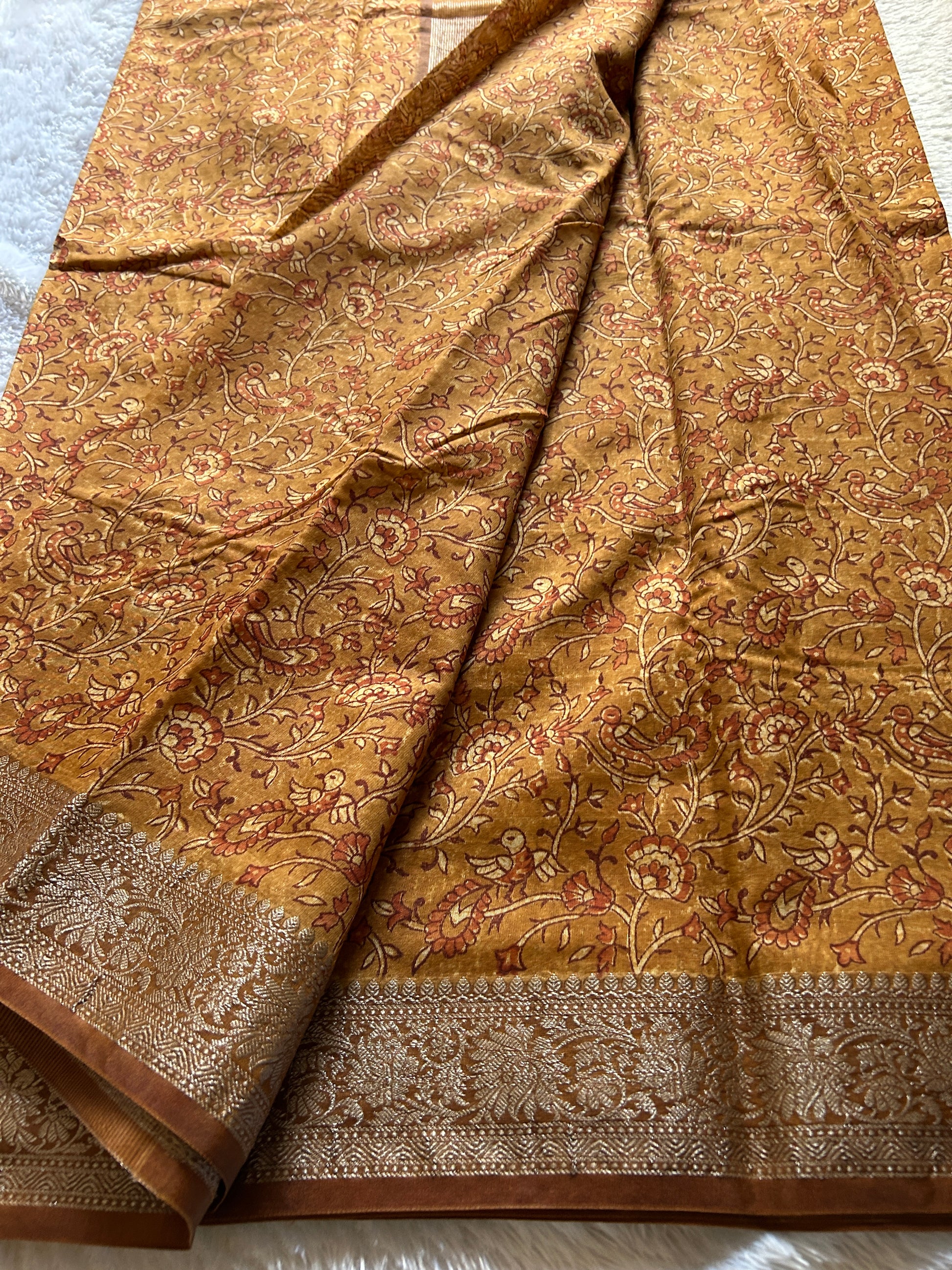 Sarala showcases a luminous golden yellow Chanderi saree adorned with delicate floral prints throughout. The mustard border features intricate zari embellishments that add refined elegance. Crafted from soft Chanderi fabric, this saree drapes effortlessly for casual occasions, offering comfort without compromising on sophistication. The harmonious blend of golden and mustard tones creates a warm, inviting aesthetic perfect for everyday wear and festive gatherings alike.
