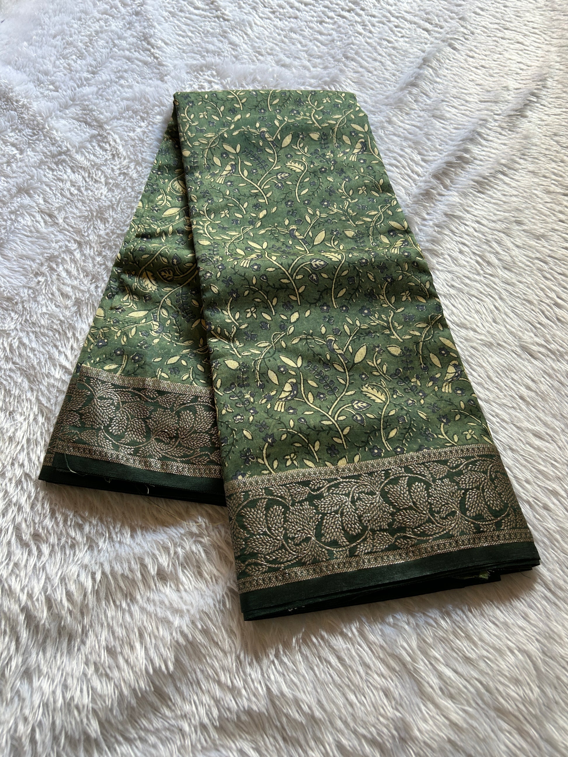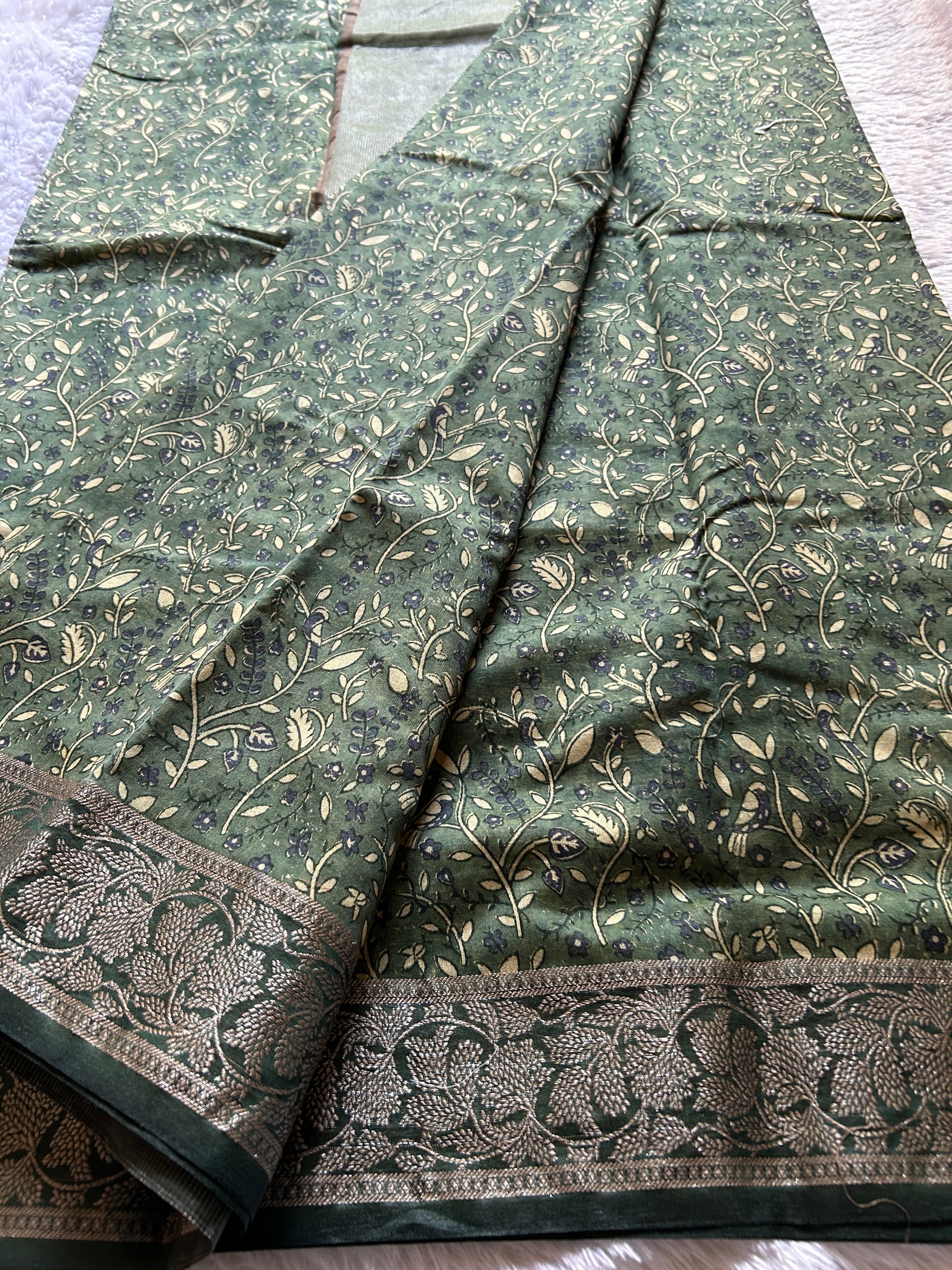 Sarala presents a masterclass in contemporary saree design, featuring a luxuriously soft Chanderi weave in greyish green as its foundation. The all-over floral print showcases meticulous craftsmanship, while the striking dark green border accented with authentic zari work elevates the piece with traditional artistry. This saree is engineered for effortless draping, making it an excellent choice for those seeking refined casual wear. The sophisticated color palette—blending warm olive with deep forest green—offers remarkable versatility, while the premium Chanderi fabric ensures breathability and comfort throughout the day. A perfect balance of heritage craftsmanship and modern wearability.
