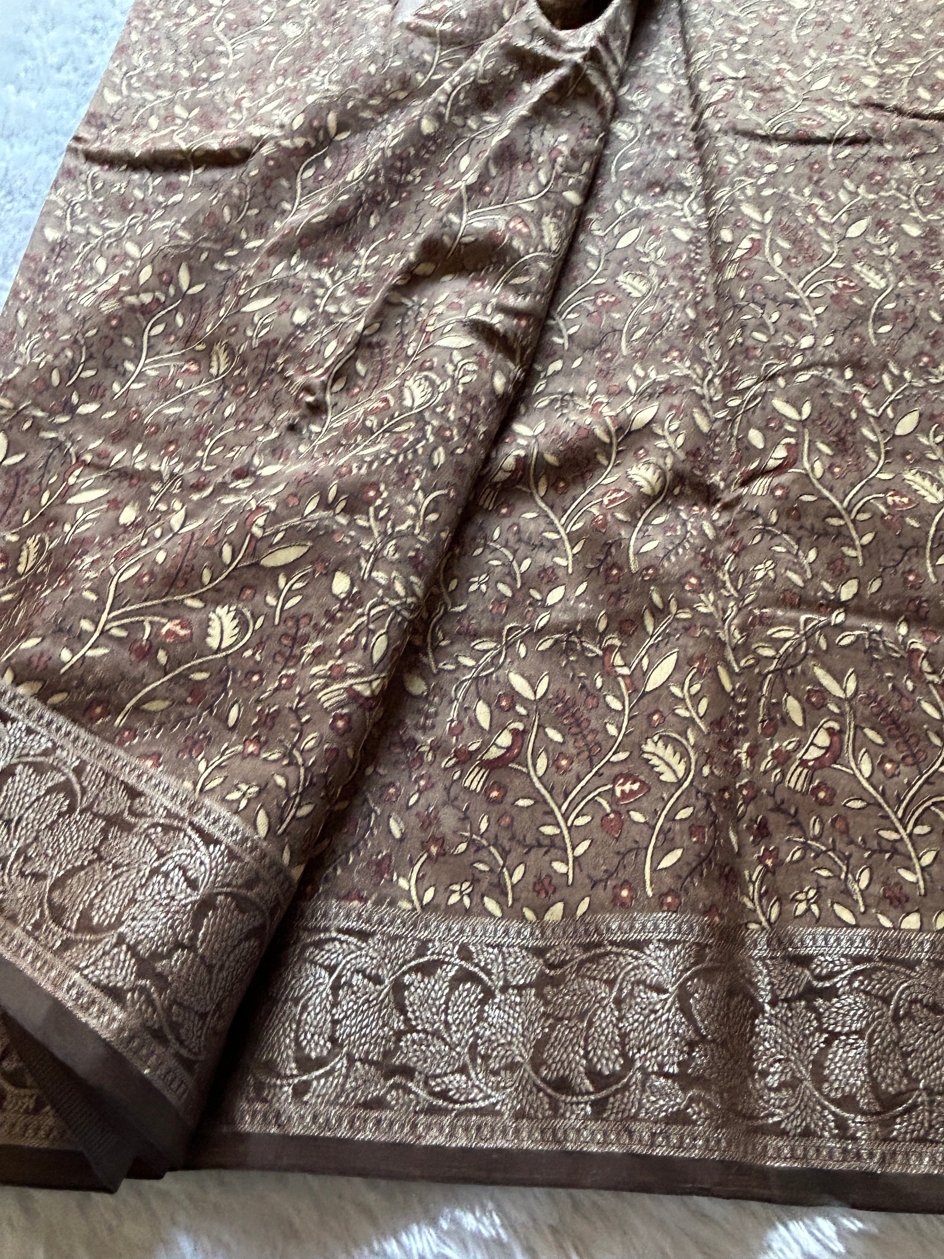 Sarala embodies understated elegance with its tan Chanderi base adorned with delicate floral motifs throughout. The deep brown border, enriched with intricate zari work, provides striking definition while maintaining the saree's refined aesthetic. Crafted from soft Chanderi fabric, this piece drapes effortlessly, making it ideal for casual occasions where comfort meets sophistication. The interplay between the warm tan and rich brown creates a versatile palette that complements various skin tones and styling preferences.