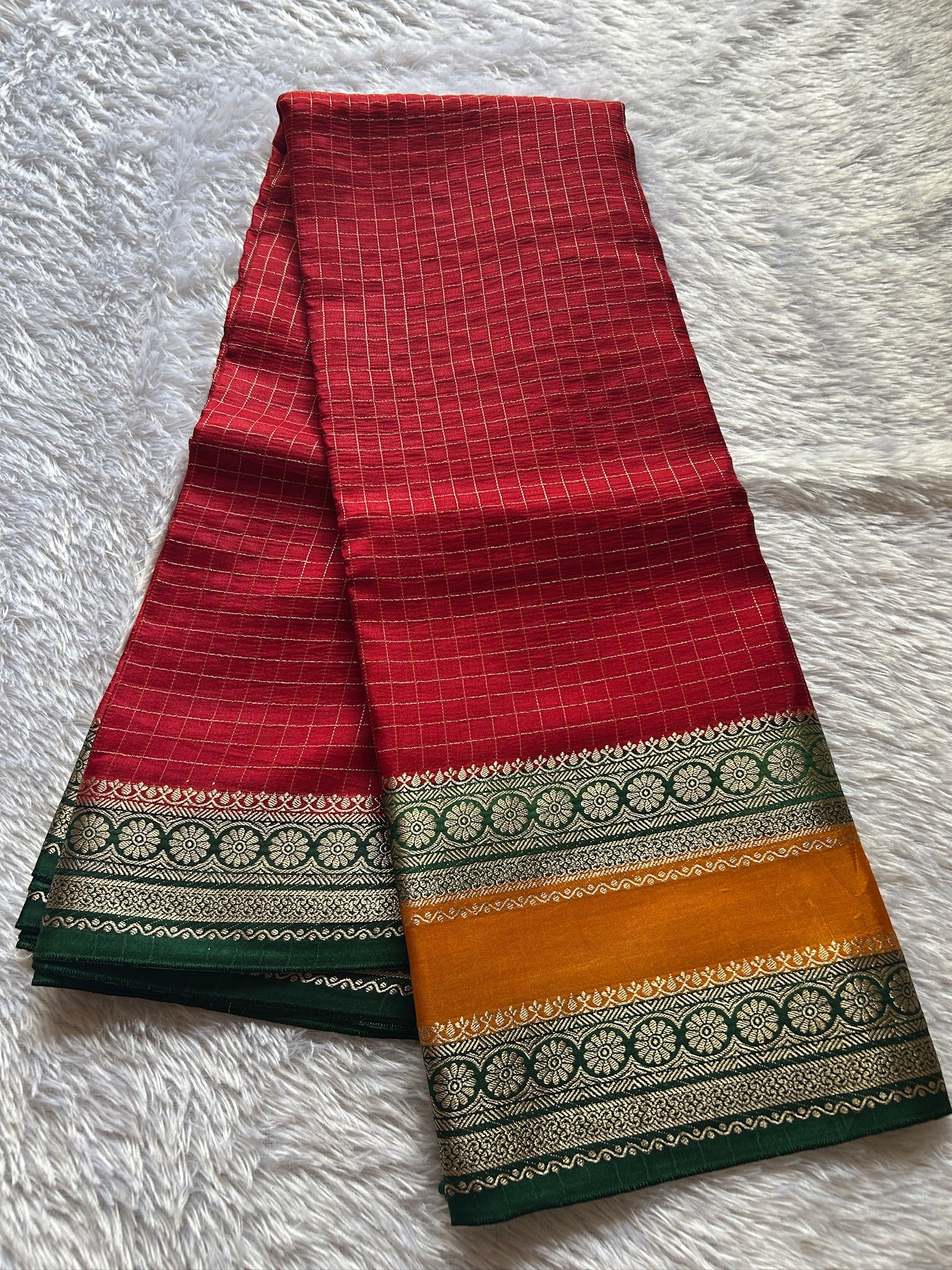 This exquisite red saree is made of semi crepe silk and adorned with traditional zari checks. The allover design adds a touch of elegance, while the golden orange-green border adds a pop of color. Perfect for any special occasion.