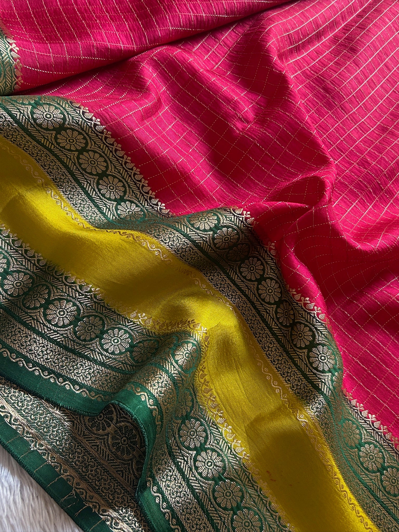 This semi crepe silk saree features a stunning pink color with intricate zari checks. The delicate olive and bottle green border adds a touch of sophistication. Elevate your style with this luxurious and elegant saree.